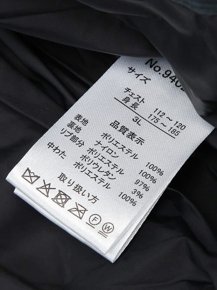 素材 :[表地]ポリエステル100% [裏地]ナイロン100% [リブ部分]ポリエステル97% ポリウレタン3% [中綿]ポリエステル100%