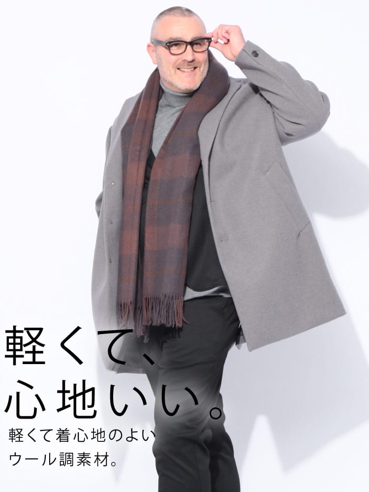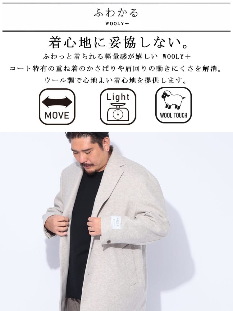 驚くほど軽やかな着心地が魅力の「ふわかるWOOLLY+」チェスターコート。ウールのような柔らかな風合いと、ふんわりとした見た目で品格漂う一着です。ストレッチが効いているので動きやすく、長時間の着用でもストレスフリー。ビジネスからカジュアルまで、シーンを選ばず活躍する万能アイテムです。暖かさと軽やかさを両立した、これからの季節に欠かせない一着。