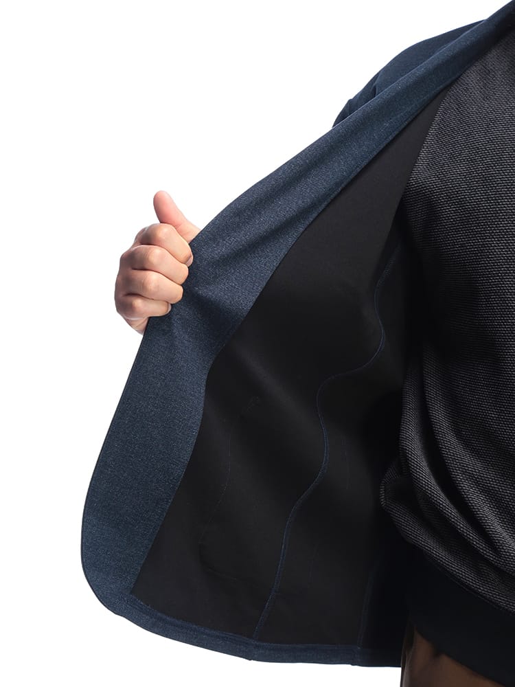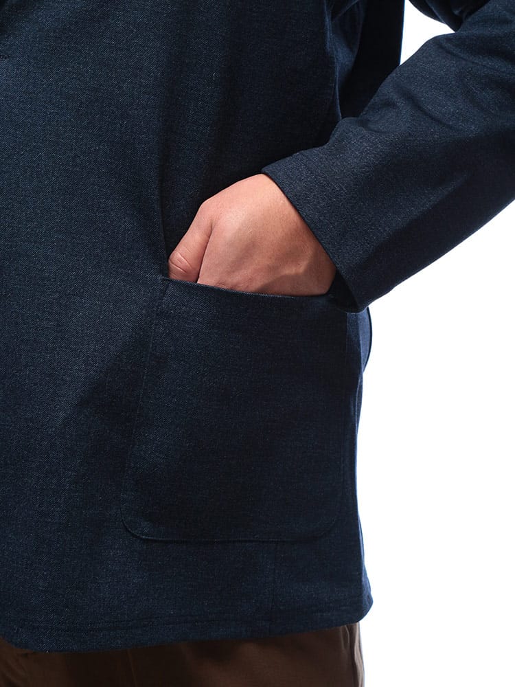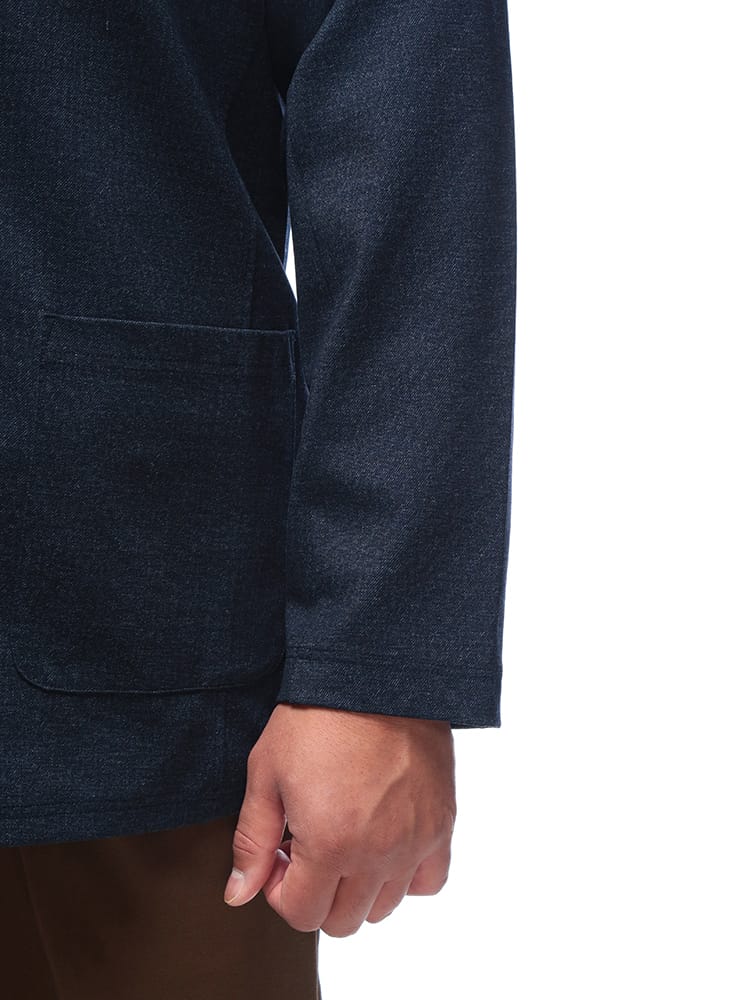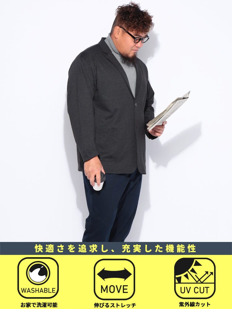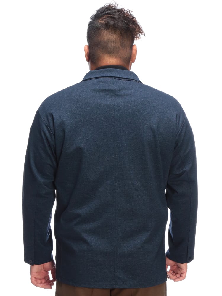 「楽」と「きちんと感」を両立させた大人のための新定番。一見するとデニムのような風合いながら、素材はレーヨン・ナイロンなどをブレンドしたポンチ素材。驚くほどのストレッチ性と、まるでカーディガンを着ているかのような軽快な着心地が魅力です。大きめサイズでも身体に心地よくフィットし、長時間の着用もストレスフリー。外側ポケットは2つ。Tシャツの上に羽織るだけで、リラックススタイルを上品なビジカジスタイルへと昇華させる、まさに「快ラクWEAR」です。