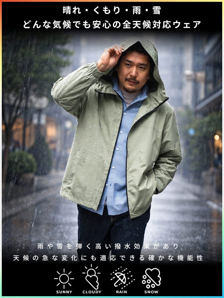 仕様 :外側ポケット数×2つ / シングルジップ / 撥水 / 防花粉 / UVカット / 防風 / ストレッチ