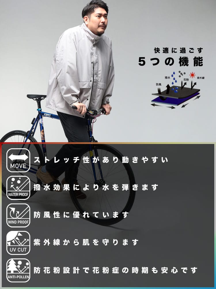 仕様 :外側ポケット数×2つ / 内側ポケット数×1つ / シングルジップ / 撥水 / 防花粉 / UVカット / 防風 / ストレッチ
