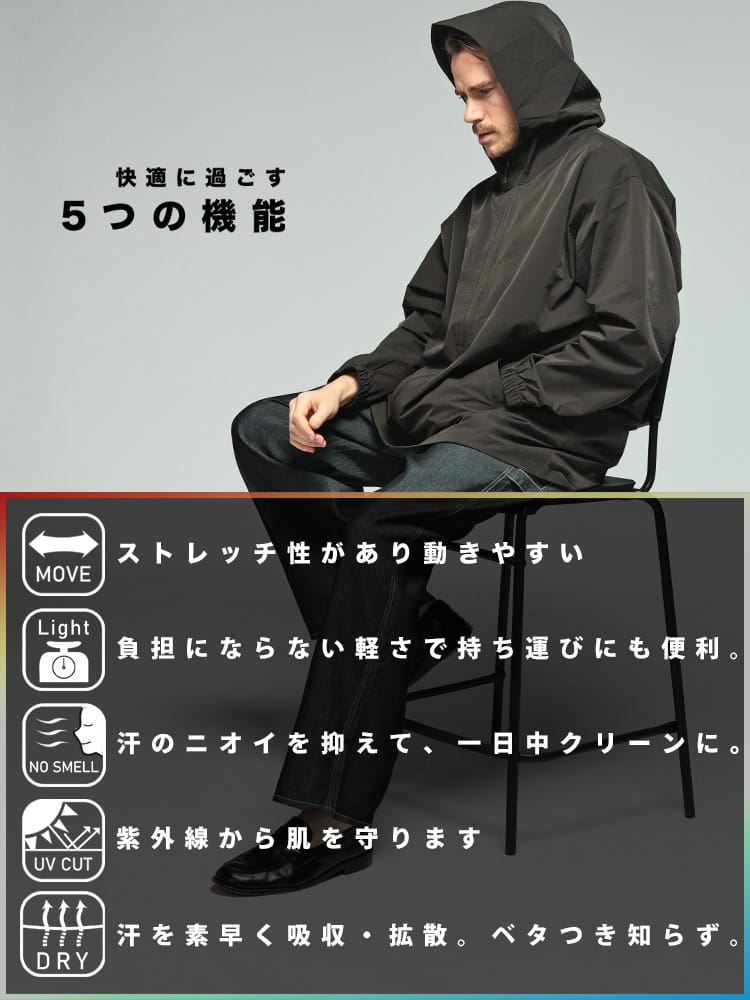 仕様 :外側ポケット数×2つ / シングルジップ / UV対策 / ドライ / 抗菌防臭 / 軽量 / ストレッチ