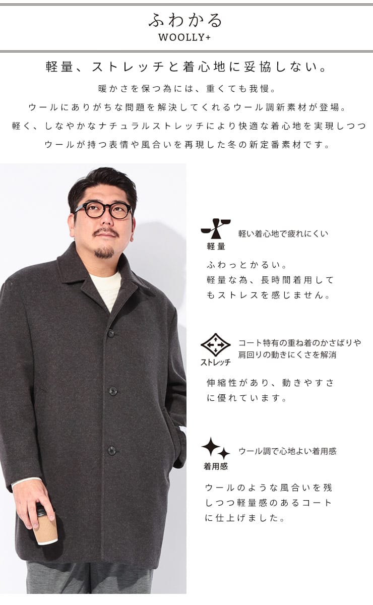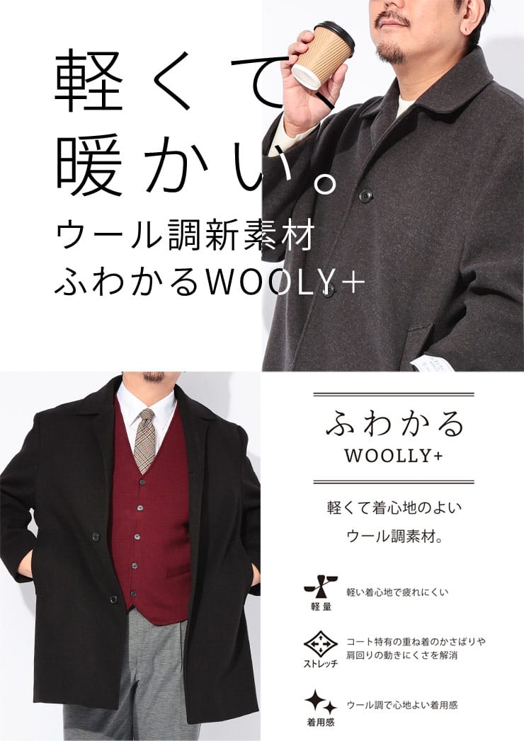 長時間着ても疲れない軽量さとラクに動けるストレッチ素材に加え、ウール調素材を使用した「WOOLLY+」。