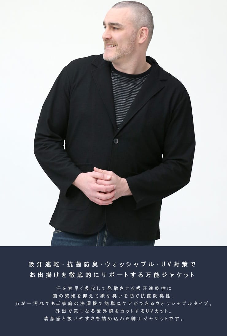 ONからOFFまでマルチに着れるシングル 2ツ釦 ジャケットです。いつもサラサラな着心地の吸汗速乾、脇部分のテープが菌の繁殖を抑えて匂いの発生を防ぐ抗菌防臭、紫外線からお肌を守るUV対策、ご家庭でお手入れが出来るウォッシャブルで快適な着用感を提供する一着。どんなシーンにも着ていただけるヘビロテ間違い無しのジャケットです。