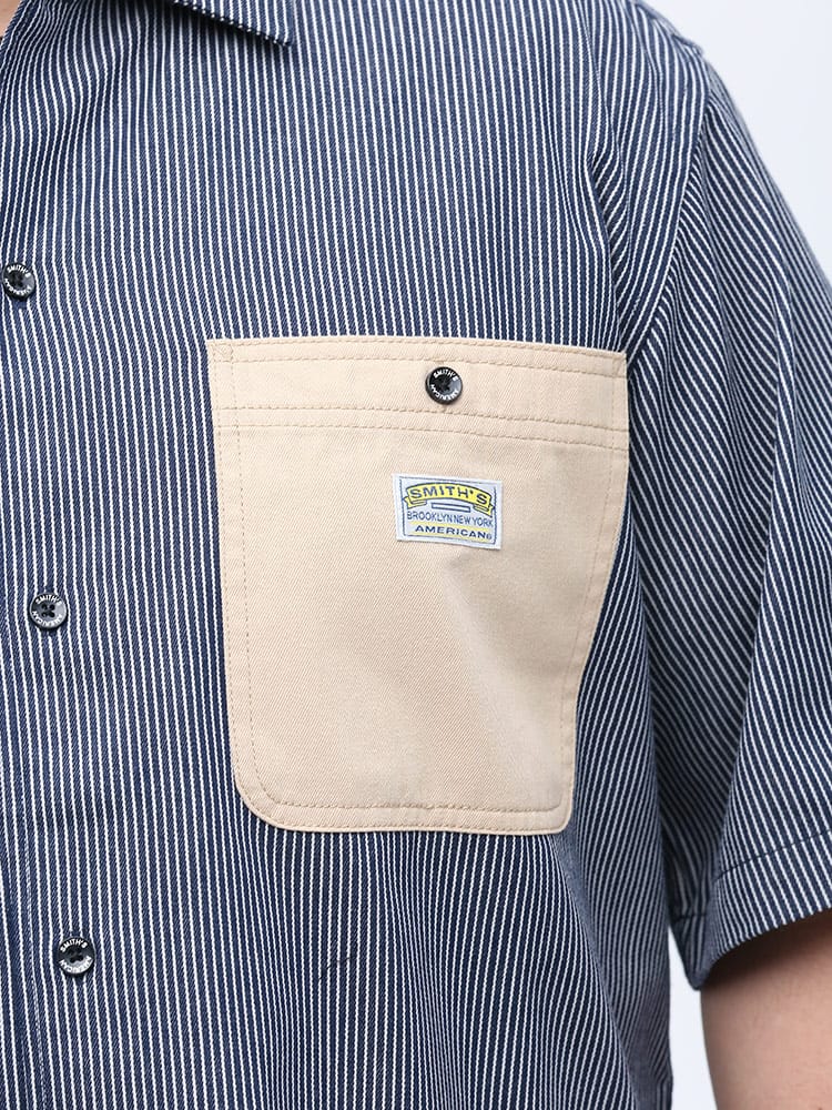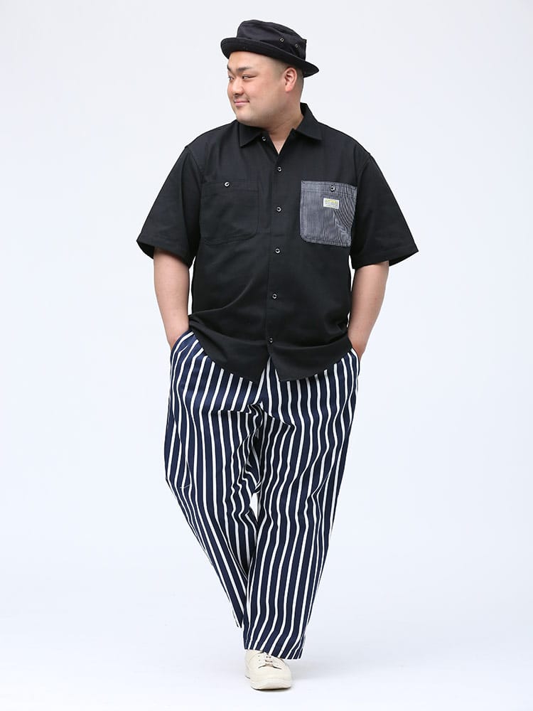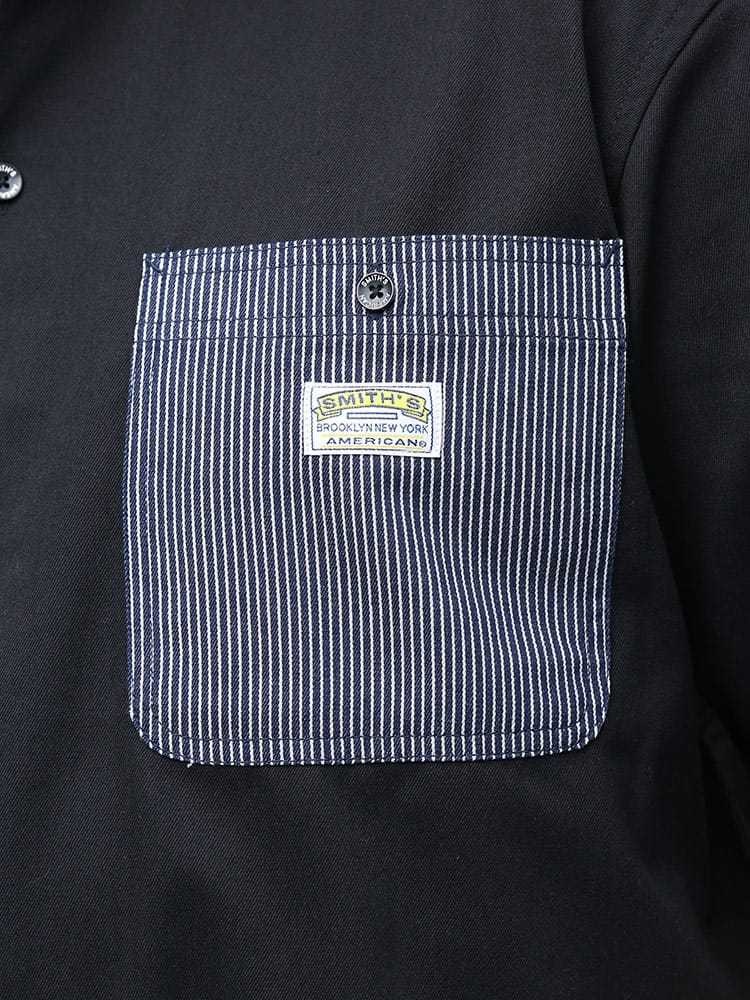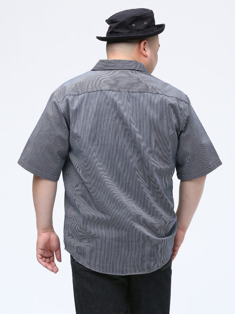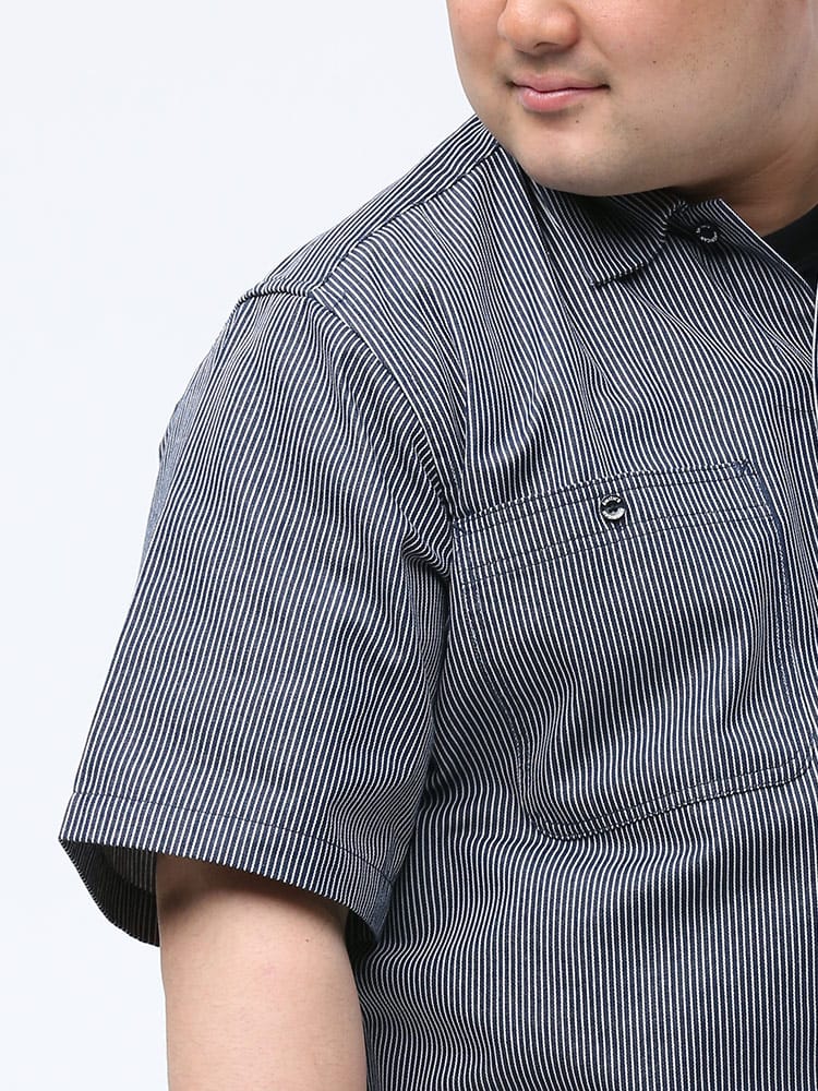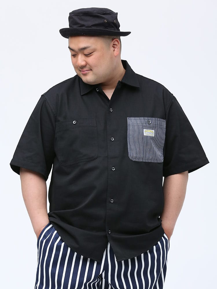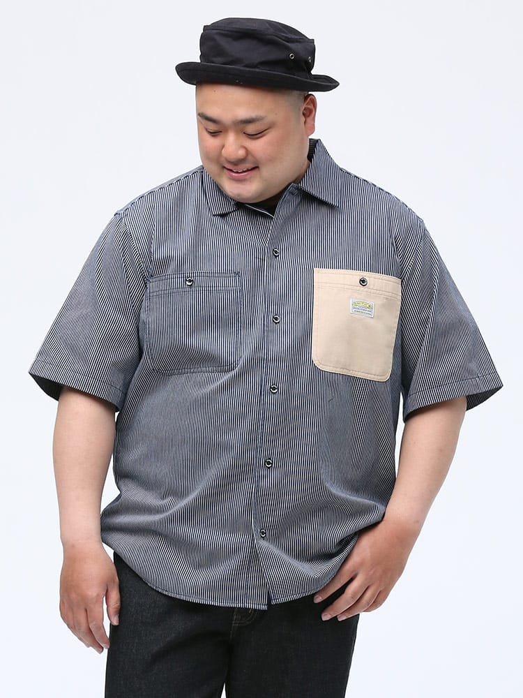 ストライプデザインのポケット切り替えがポイントになった半袖 ワークシャツです。左胸のストライプポケットにブランドタグをあしらっています。肌触りの良いコットン配合生地で着心地も抜群です。ワークスタイルやアメカジスタイルに相性抜群なアイテムです。