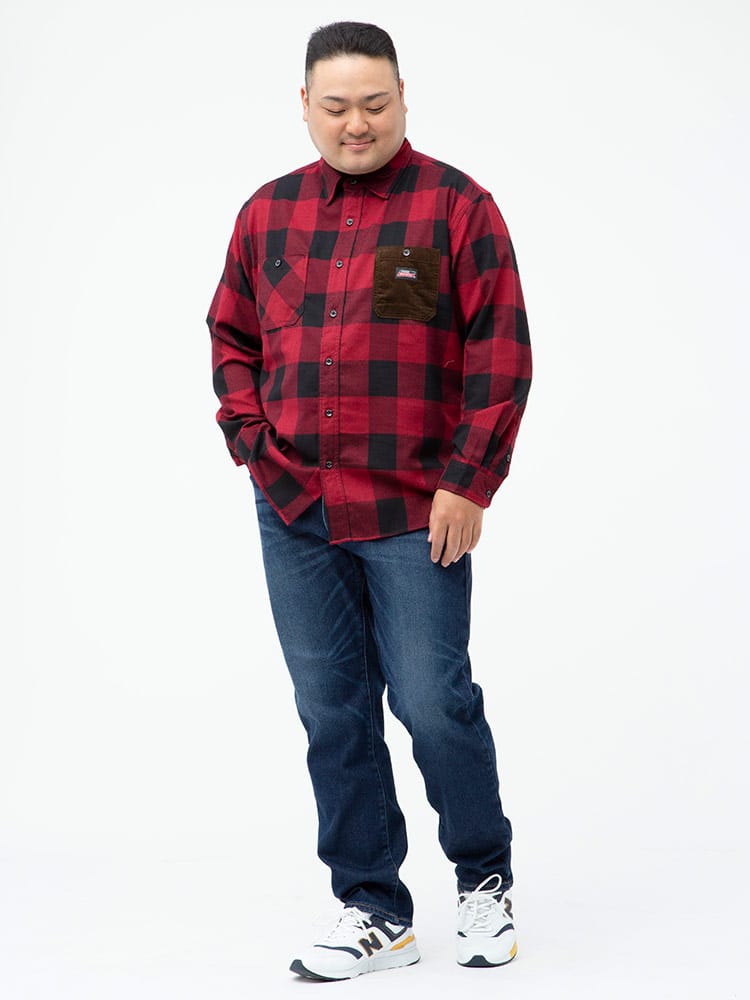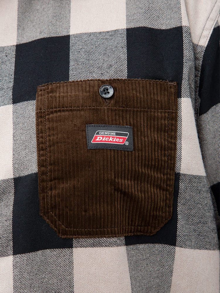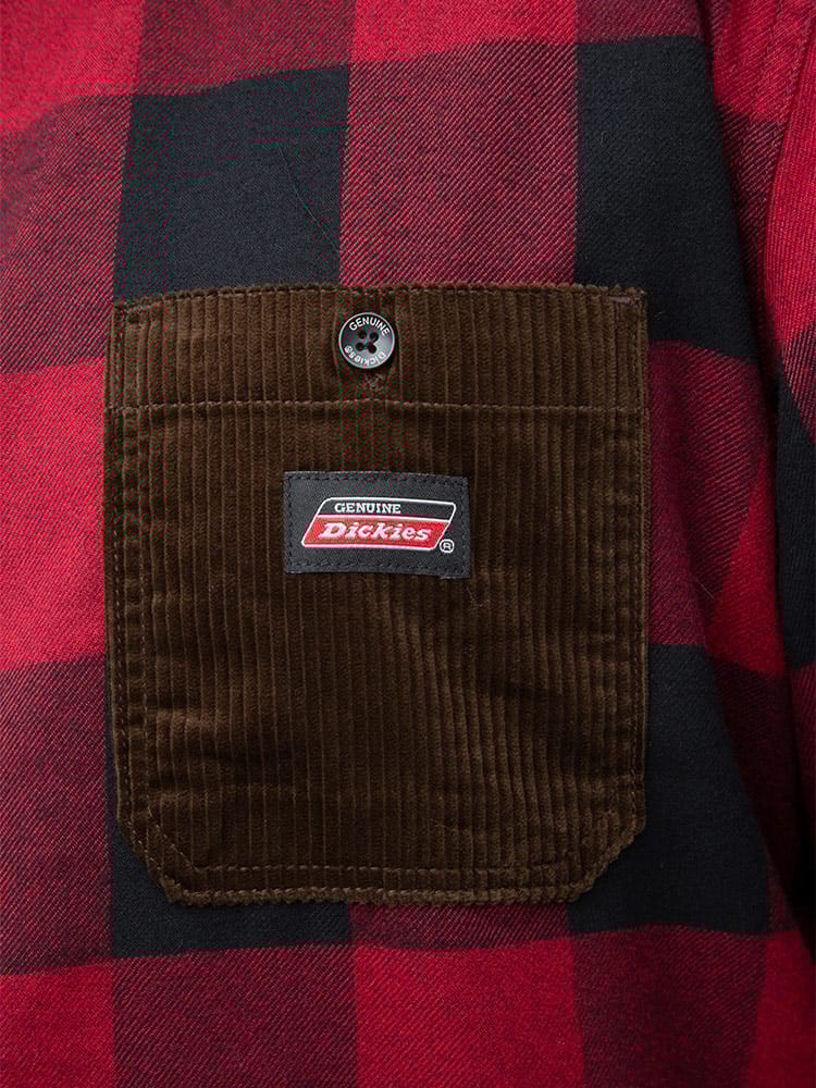 ブロックチェックと切り替えポケットがお洒落なDickiesの長袖 ワークシャツです。フロント左胸ポケットのブランドタグもポイントです。カジュアルなチェックデザインでワークスタイルやアメカジスタイルにおすすめのアイテムです。