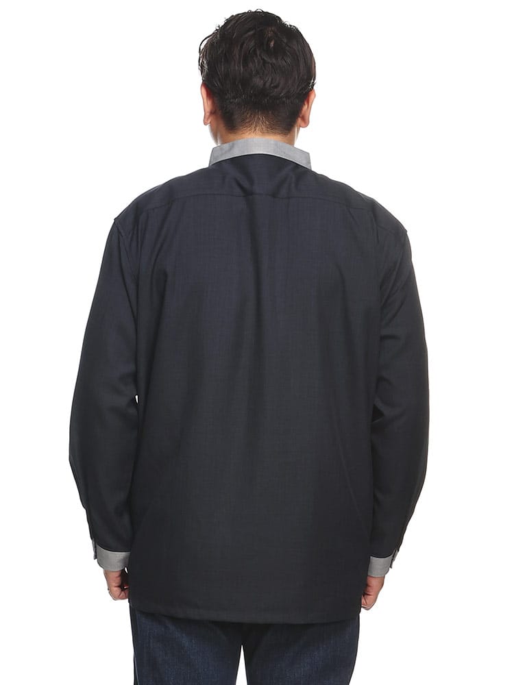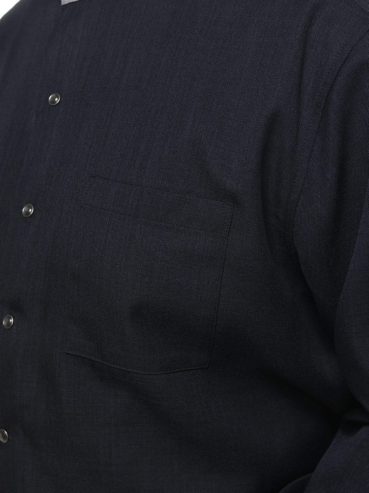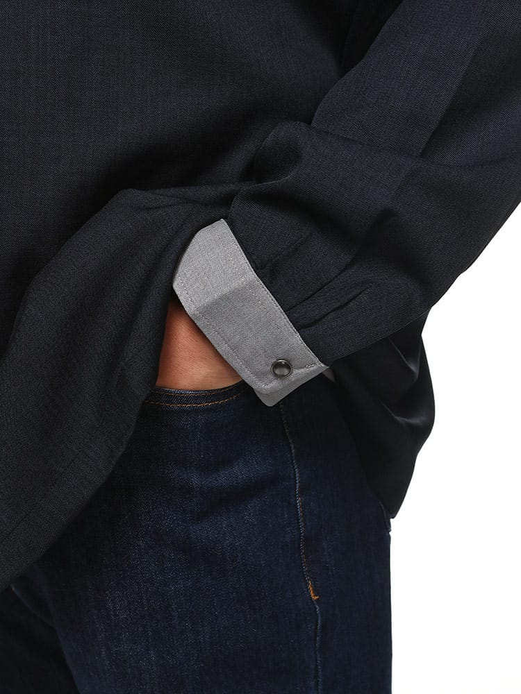 襟、袖口をネイビーに合うグレーで切り替えたクレリック仕様がとってもお洒落。