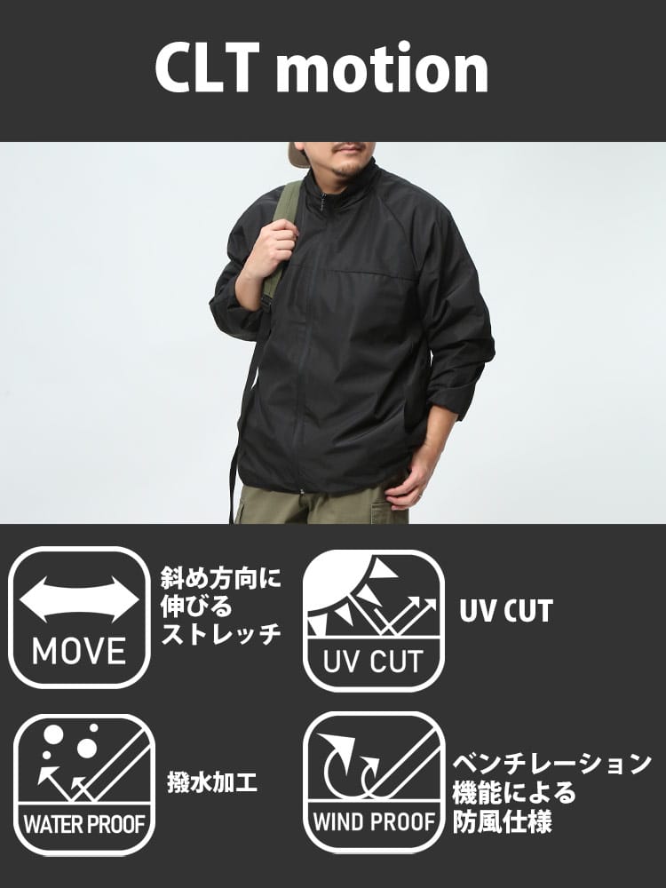 仕様 :外側ポケット数×2つ / シングルジップ / ストレッチ / 防風性 / 撥水加工 / UVケア / 裏メッシュ