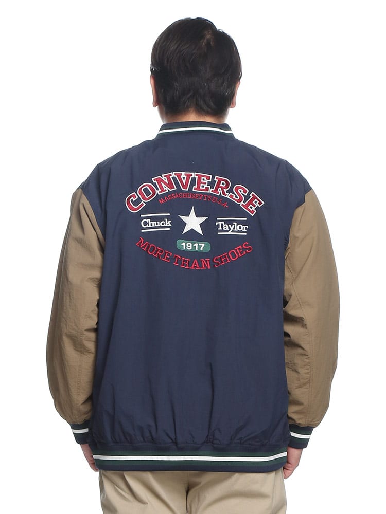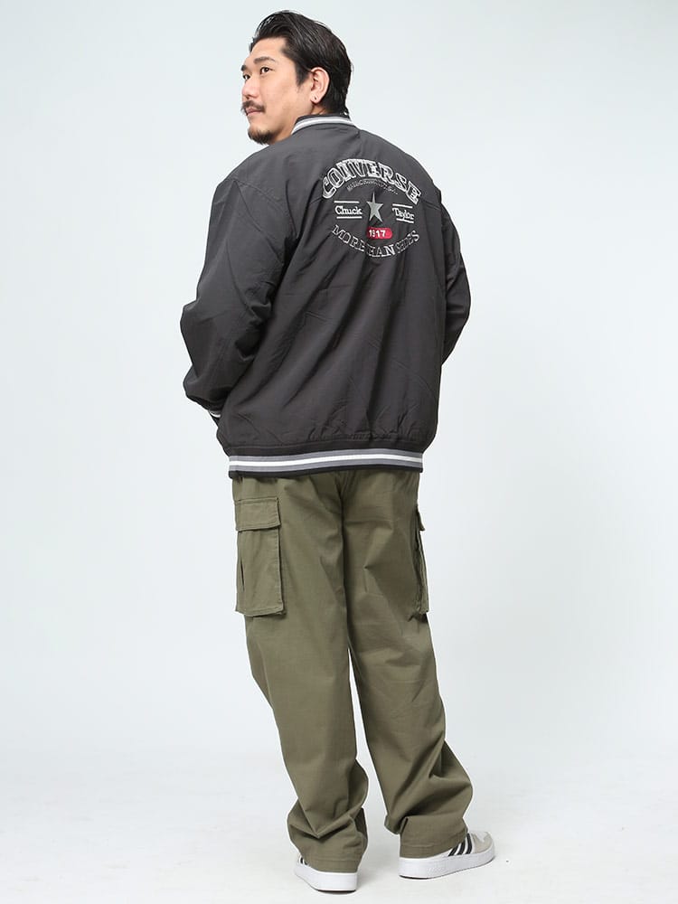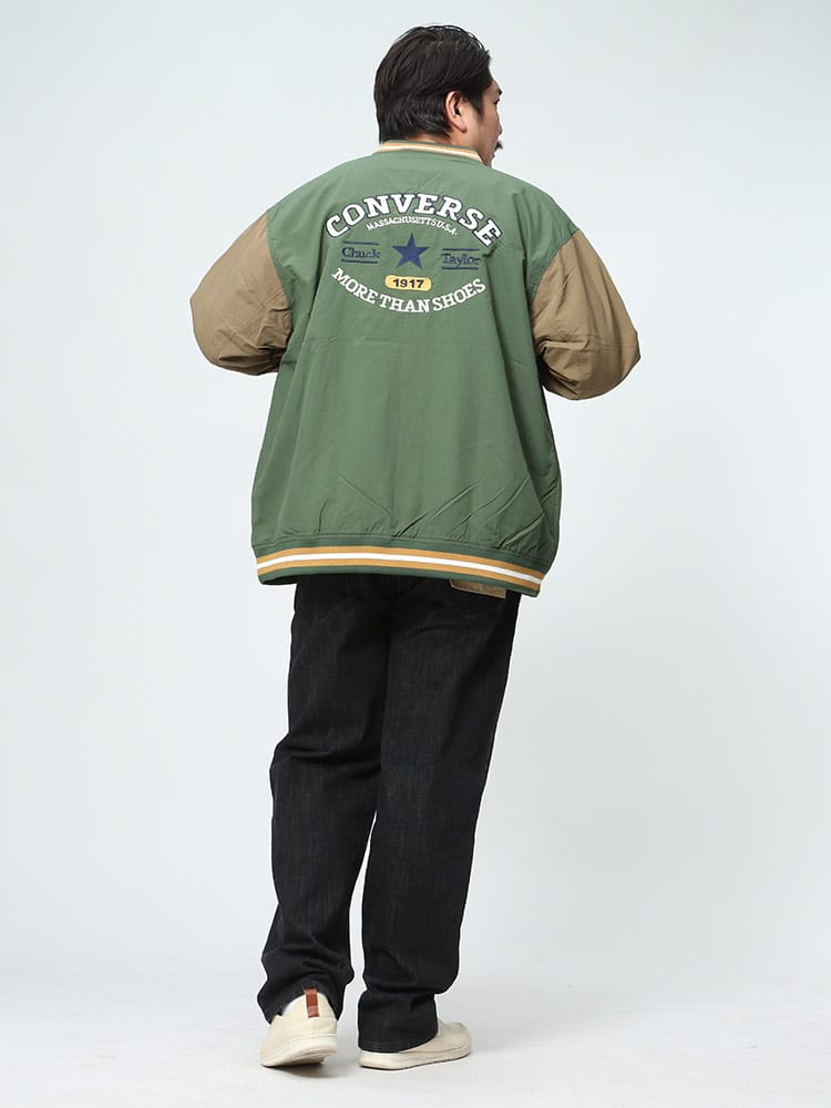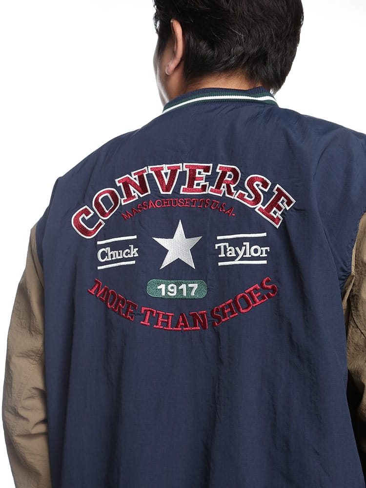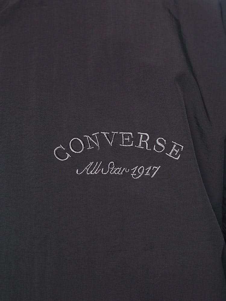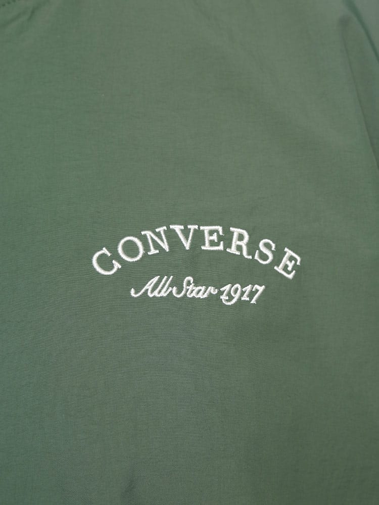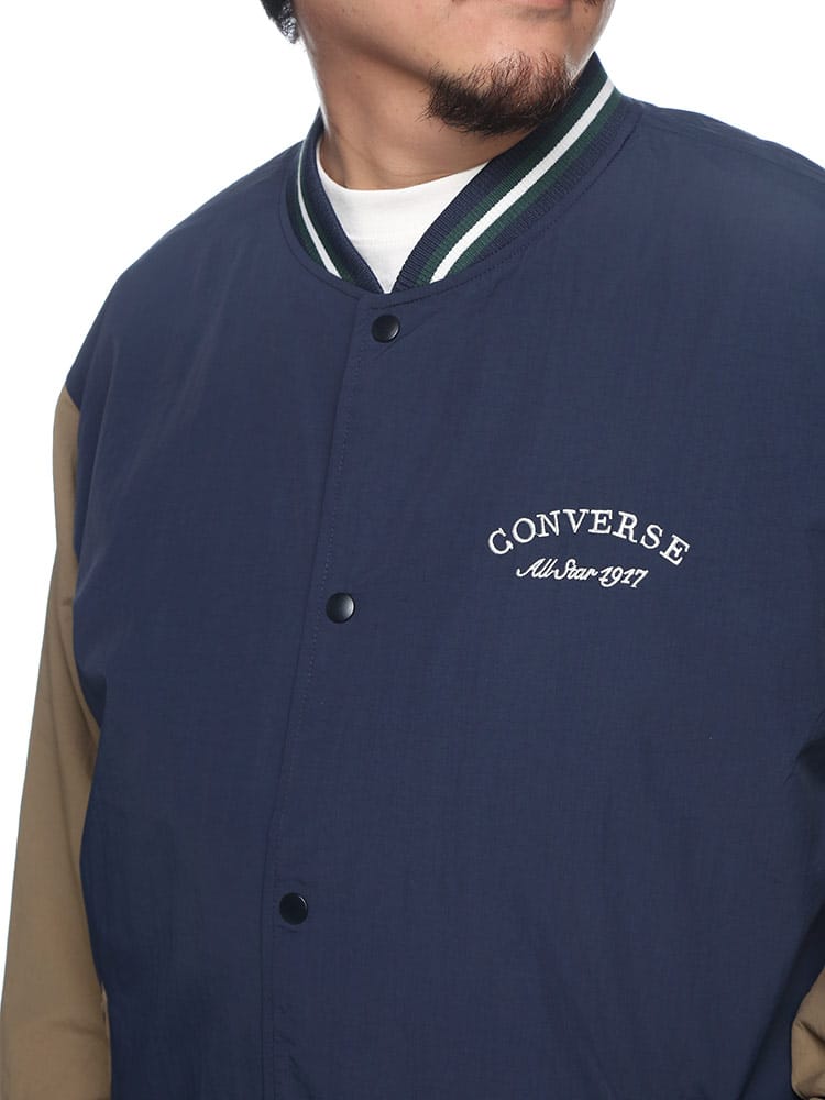 CONVERSEの撥水加工が施されたナイロン製スタジアムブルゾン。フルボタンで着脱も簡単で、春先の軽いアウターとして最適。バックにはコンバースのロゴが施され、スタイリッシュな印象を与えます。防水性能がありながらも軽量かつ通気性があり、様々なシーンで活躍します。