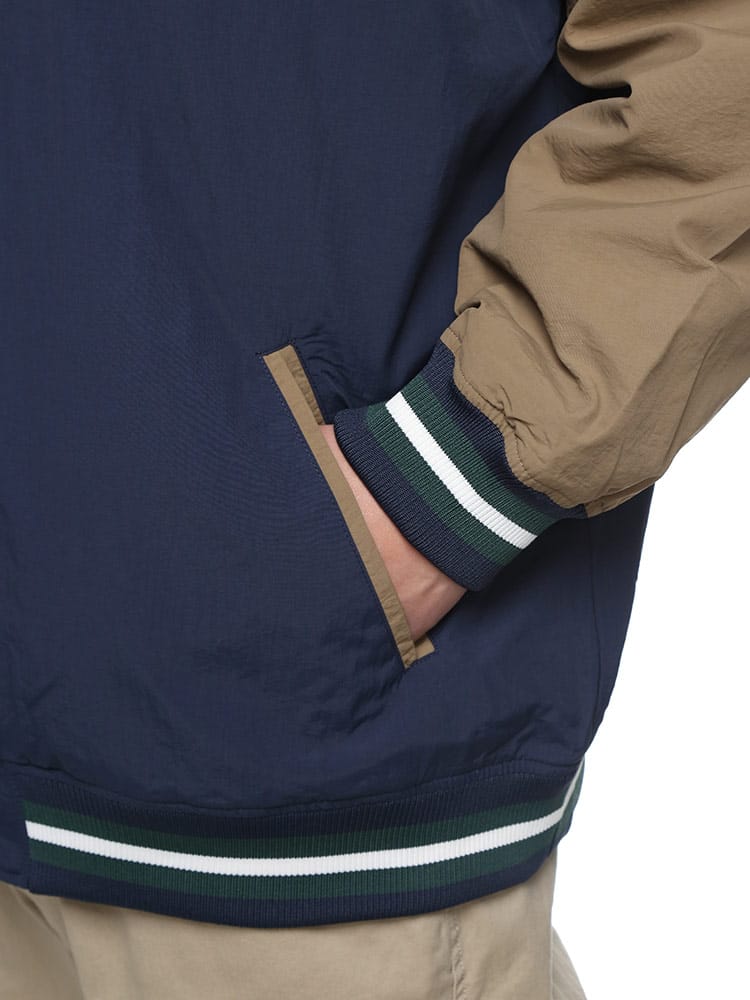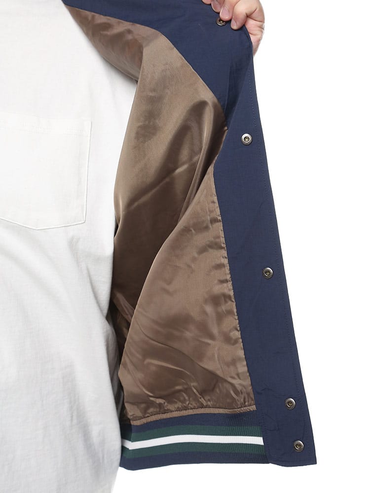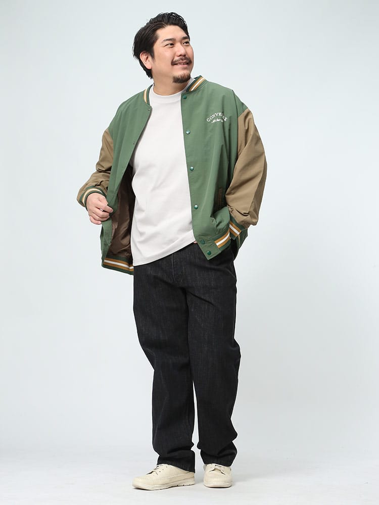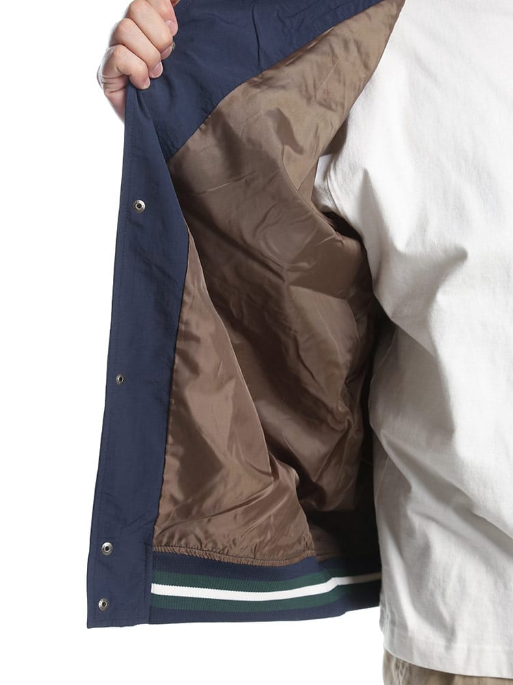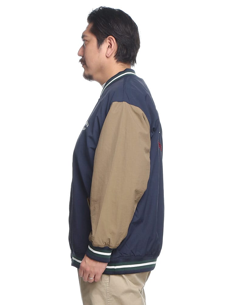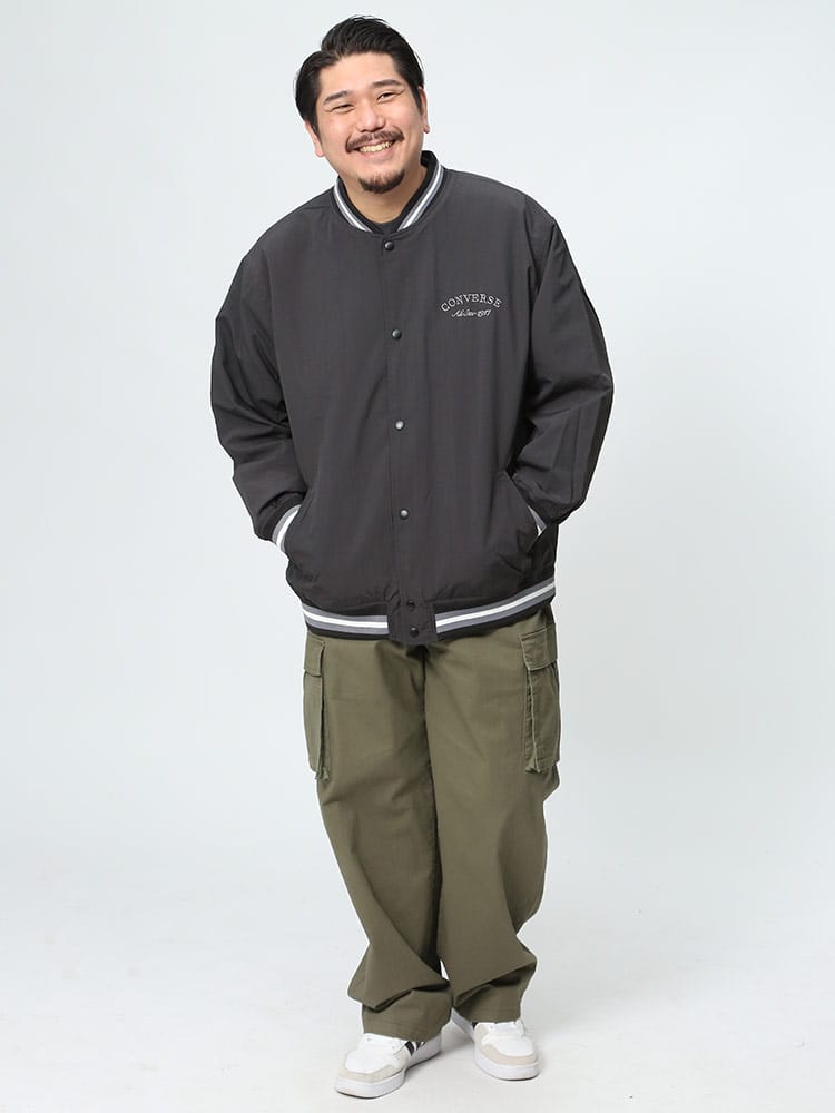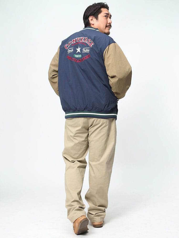 CONVERSEの撥水加工が施されたナイロン製スタジアムブルゾン。フルボタンで着脱も簡単で、春先の軽いアウターとして最適。バックにはコンバースのロゴが施され、スタイリッシュな印象を与えます。防水性能がありながらも軽量かつ通気性があり、様々なシーンで活躍します。