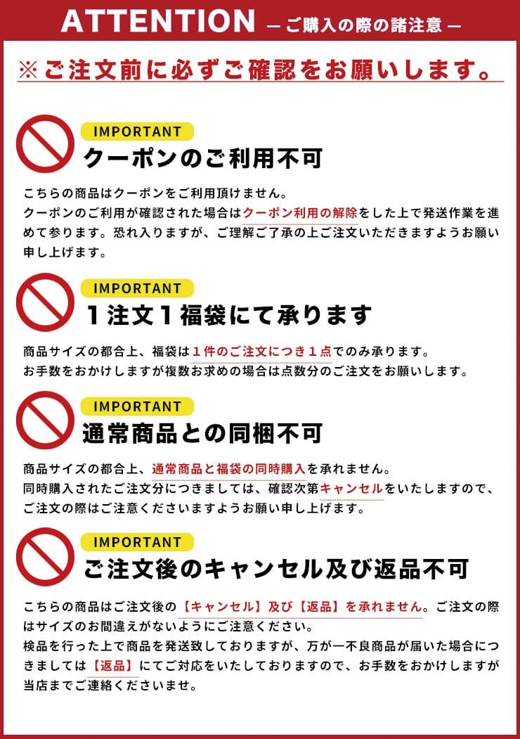 ×クーポンのご利用NG クーポンのご利用が確認された場合、解除した上で発送作業を進めさせていただきます。 ×複数注文及び別商品との注文NG 複数点をご注文を希望される際は1件ずつご注文ください。また商品サイズの都合上他の商品との注文はできません。 ×配送日の指定NG 福袋は最短での発送とさせていただきます。 ×ご注文後の返品・キャンセルNG ご注文後のキャンセル及び返品を承れません。ご注文の際は今一度ご注文内容をご確認ください。検品を行った上で商品の発送を行っておりますが、万が一、不良商品が届いた場合につきましては返品にてご対応を致しますので、お手数ではございますが当店までご連絡くださいませ。 |