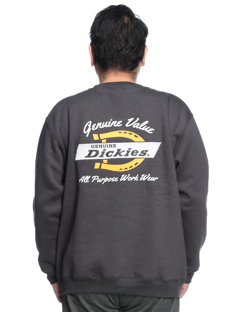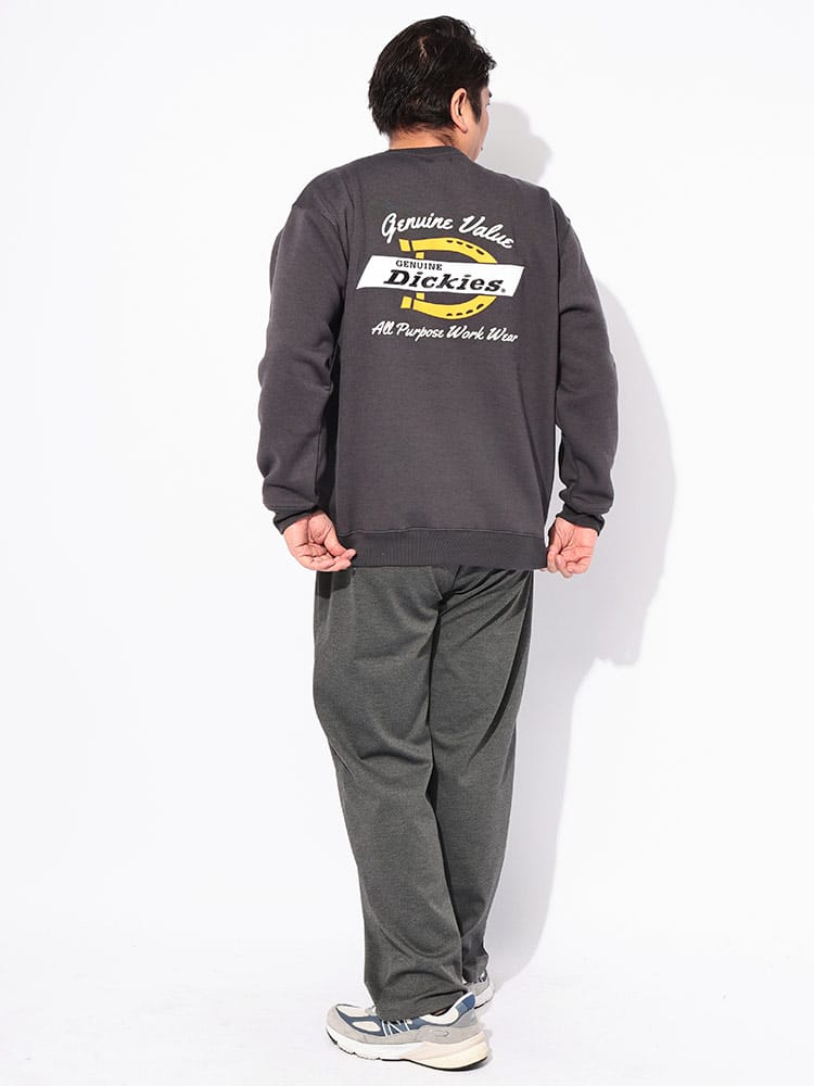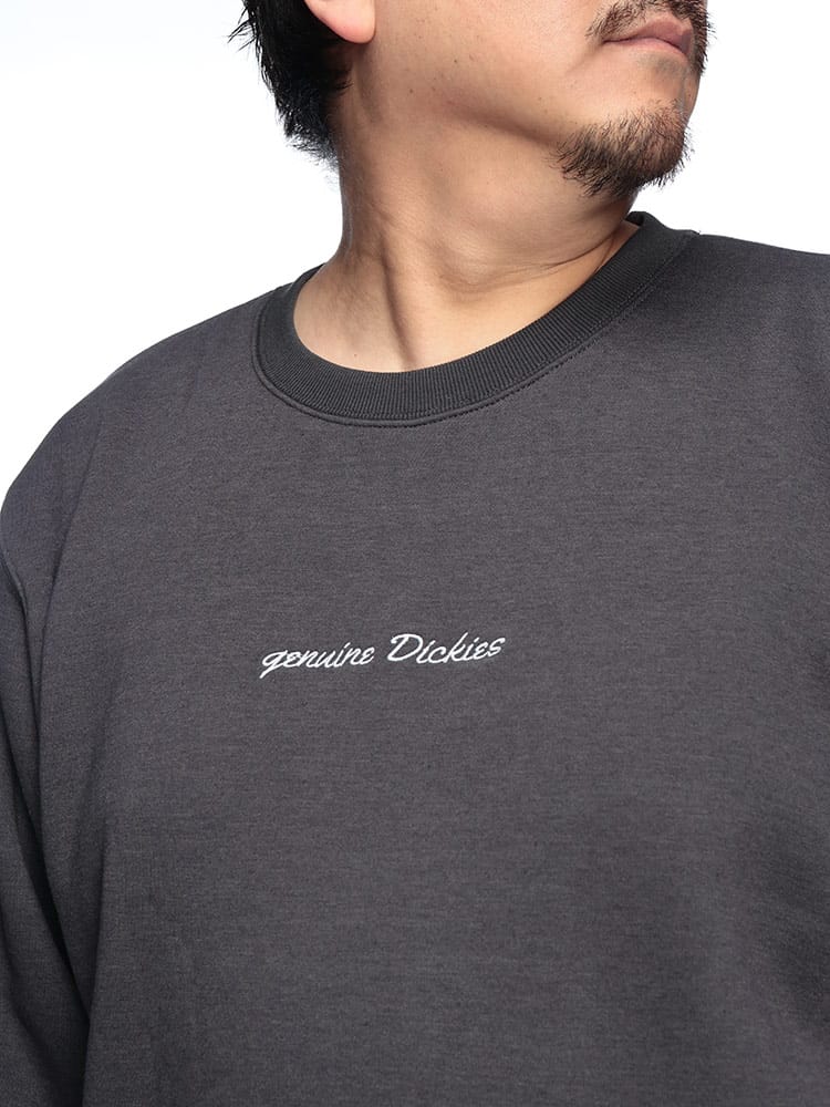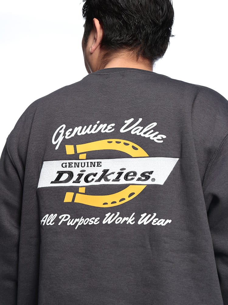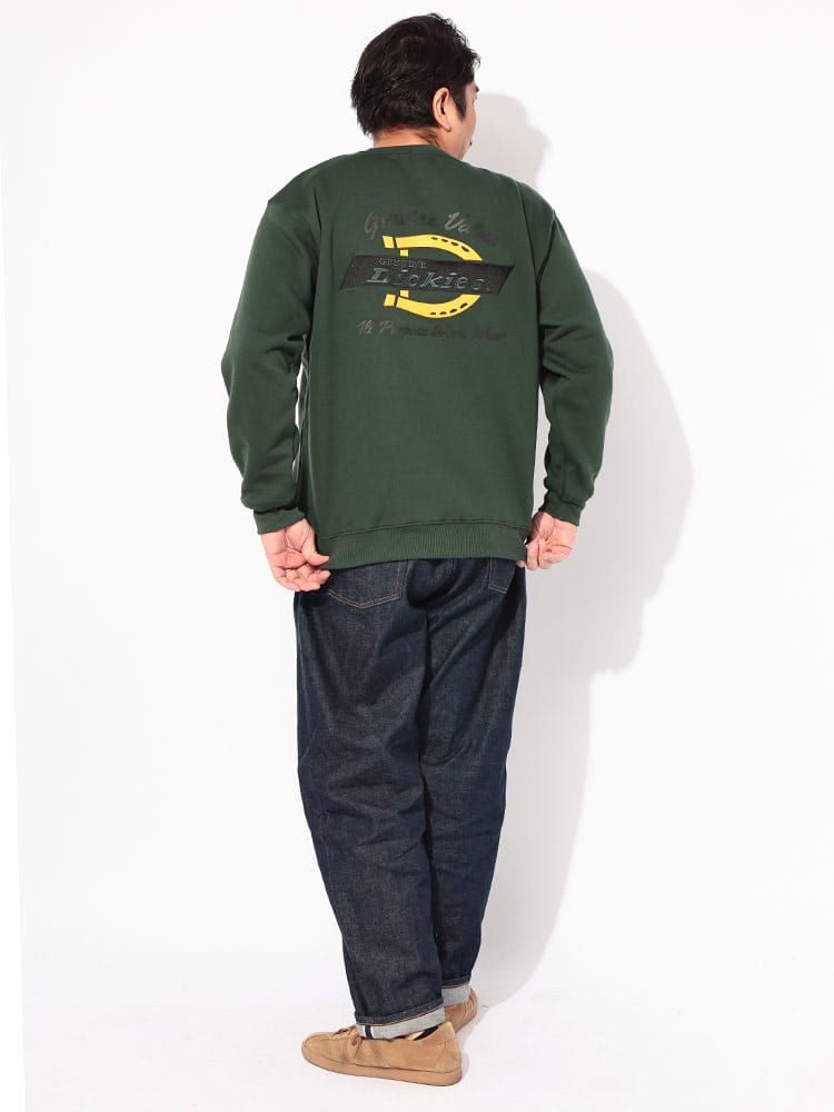 このGENUINE DICKIESのトレーナーは、裏起毛素材で暖かく、快適な着心地が魅力です。フロントには小さなロゴ刺繍を控えめに配置しつつ、背中には大胆な刺繍とプリントのコンビネーションで、ブランドらしいタフで個性的なストリートスタイルを表現しています。一枚で主役になる存在感のあるアイテムです。