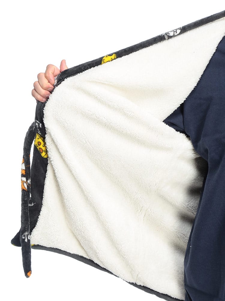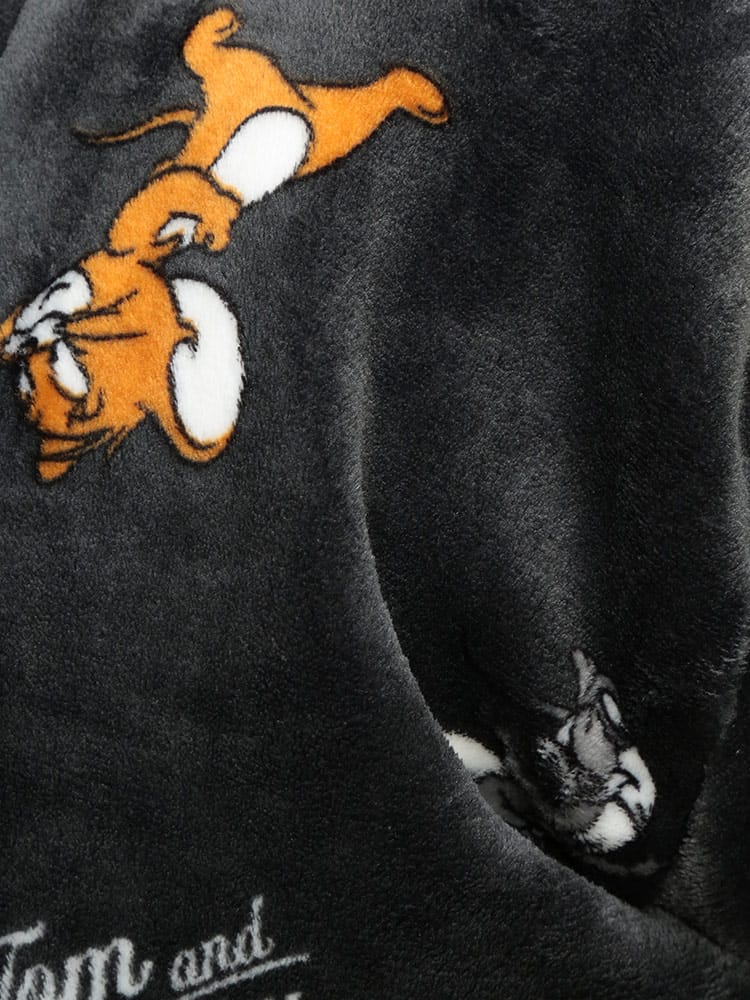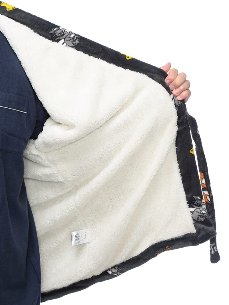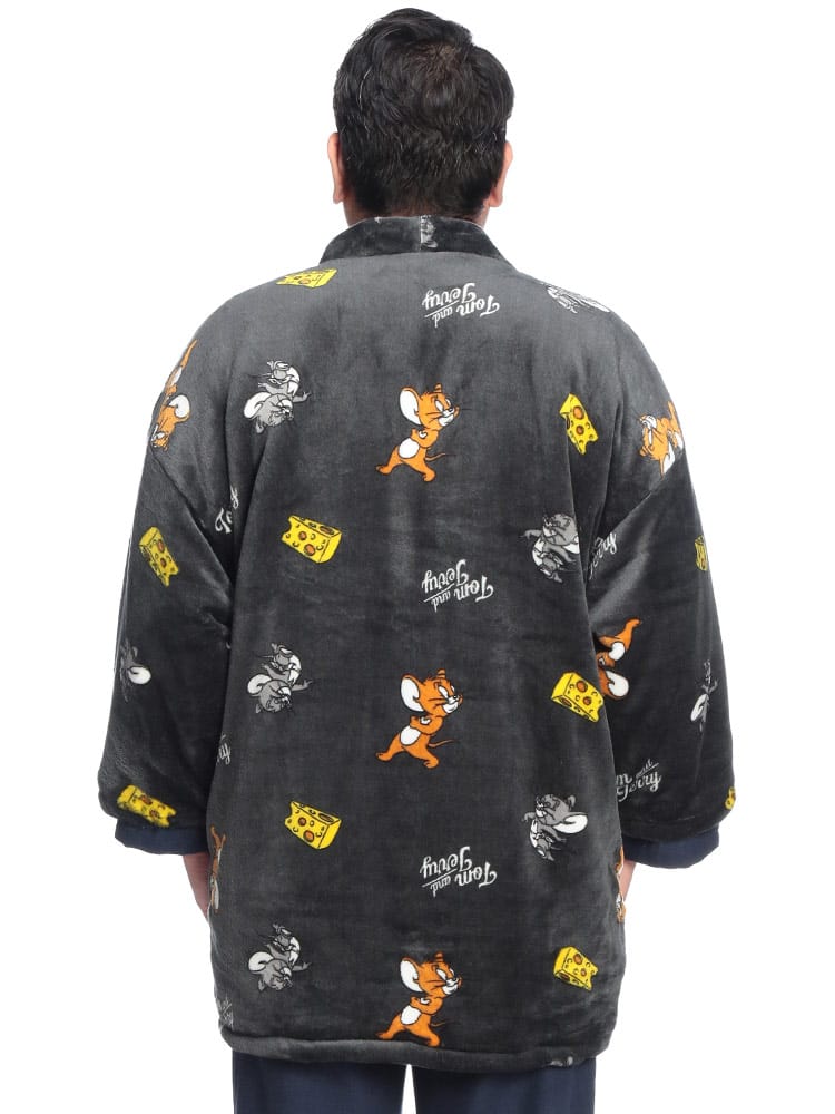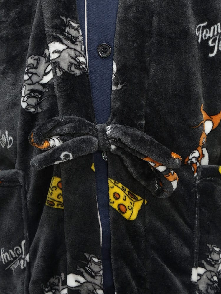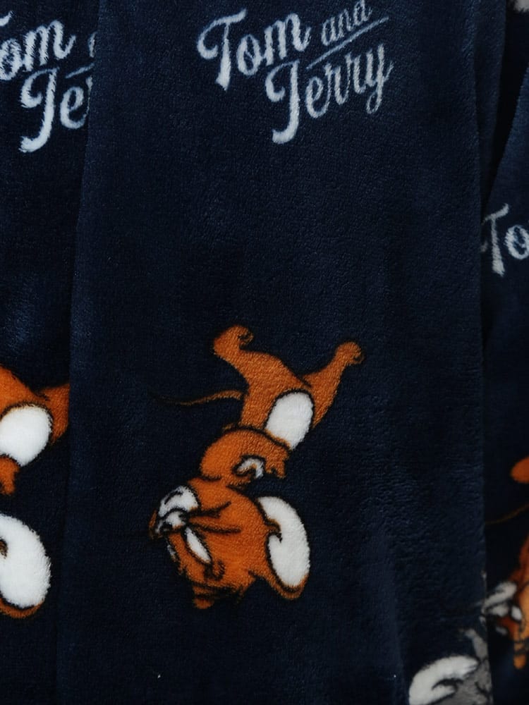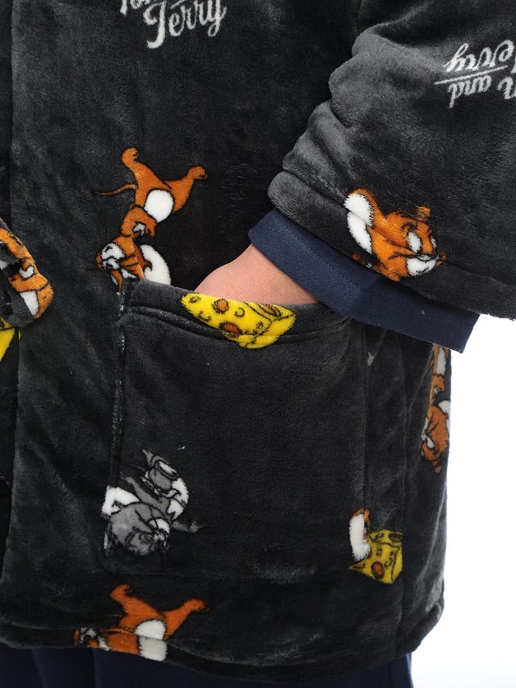 人気キャラクタートムとジェリーの楽しげな総柄をデザインした、遊び心あふれる裏ボア半纏。ふんわりと柔らかな裏ボア素材が、まるで毛布に包まれているような抜群の温もりと着心地を提供します。冷え込む季節の部屋着や防寒着として最適。かわいらしいデザインで、おうち時間を楽しく、暖かく過ごしたい方にぴったりのアイテムです。