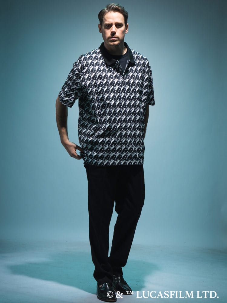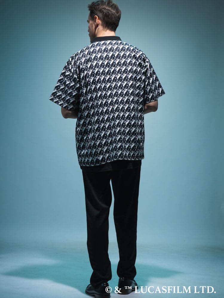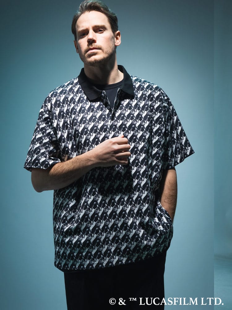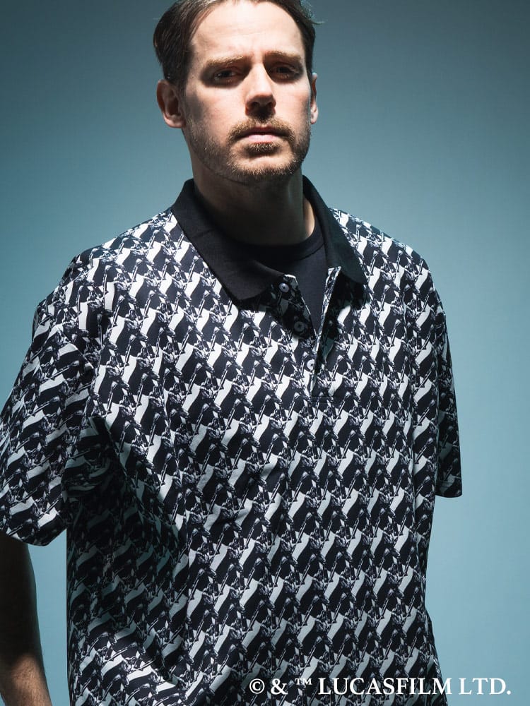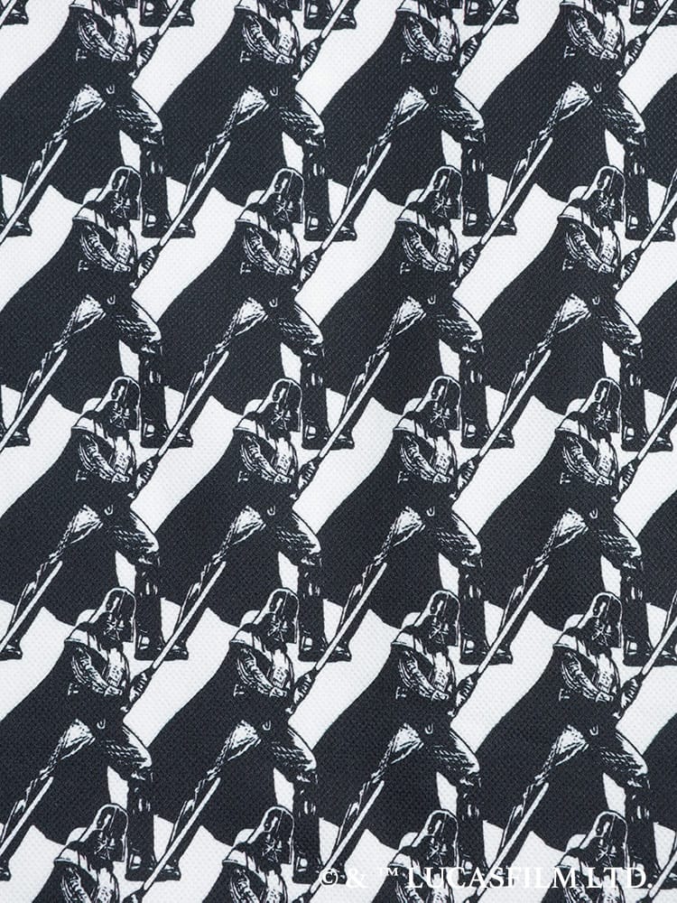 「ダース・ベイダー」のアートをプリントしたデザインを斜め方向のグリッド状にプリントし、アイコニックなシルエットとライトセーバーを構えるポーズのデザイン。