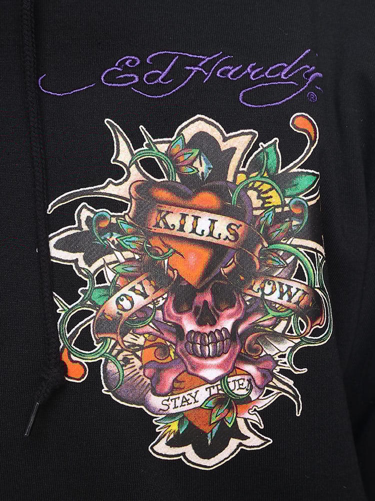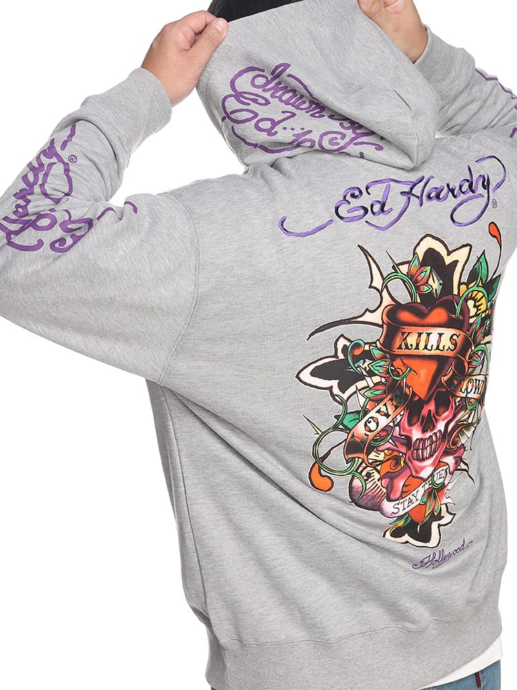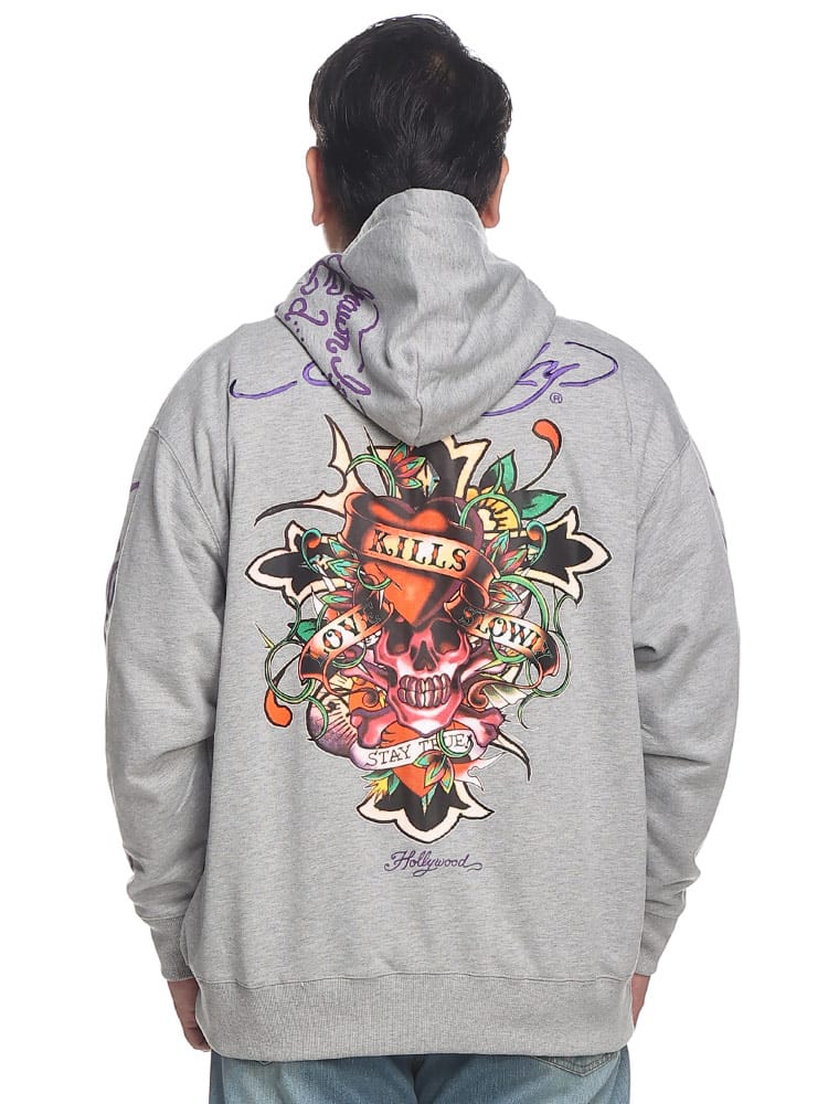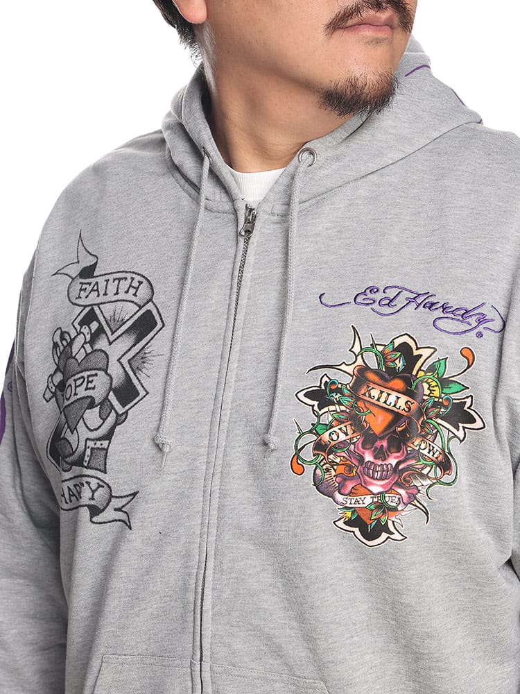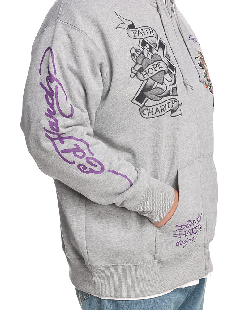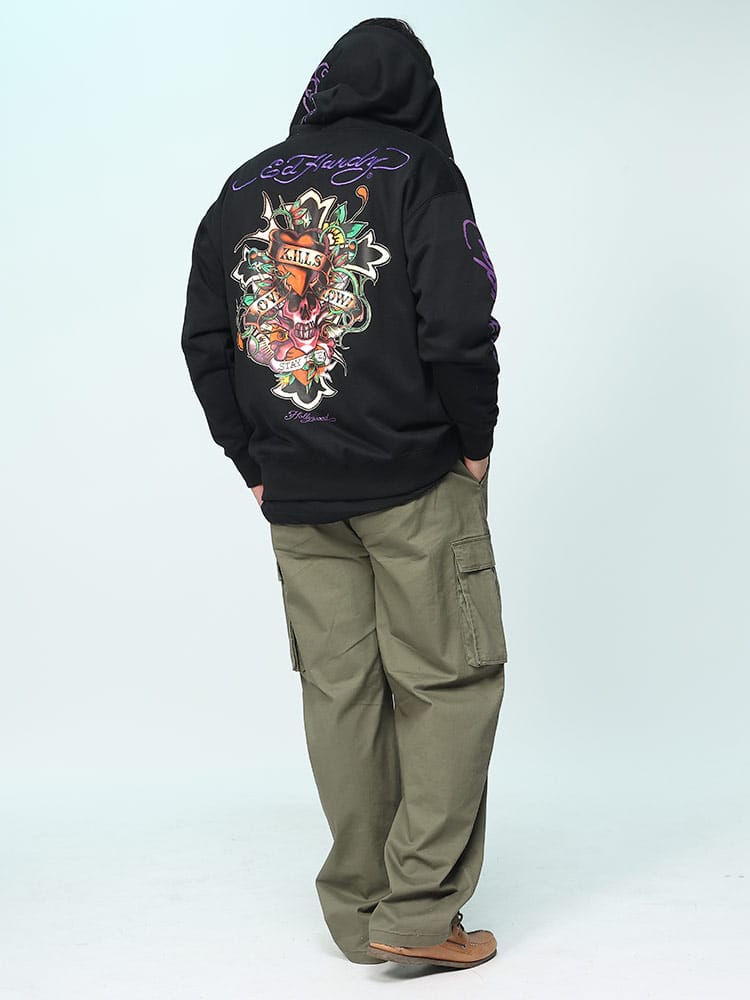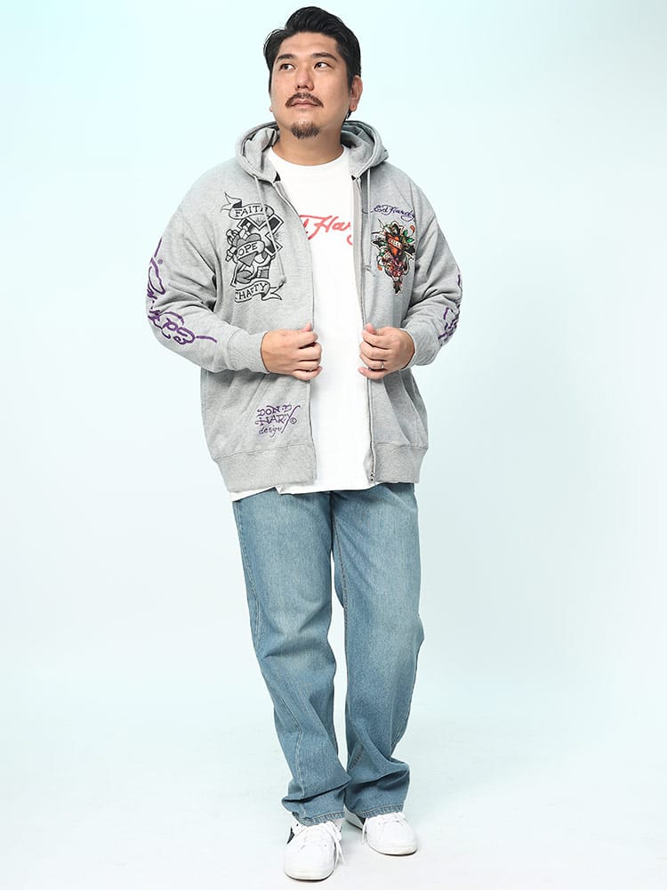 背面に刺繍とプリントの二重のデザインが施され、存在感を放っています。一方、フロントにもプリントがあり、全体として洗練された印象を持ちつつも、エドハーディー独自のエッジの効いたデザインが随所に見られます。フルジップ仕様で、機能性とファッション性を兼ね備えており、日常のカジュアルウェアから特別なシーンまで幅広く活躍します。そのユニークなアートワークと高品質な素材感は、着る人の個性を引き立てること間違いなしのアイテムです。
