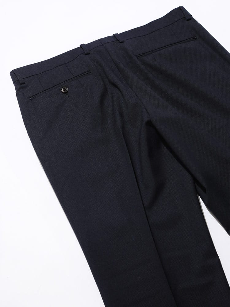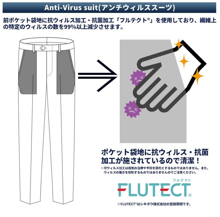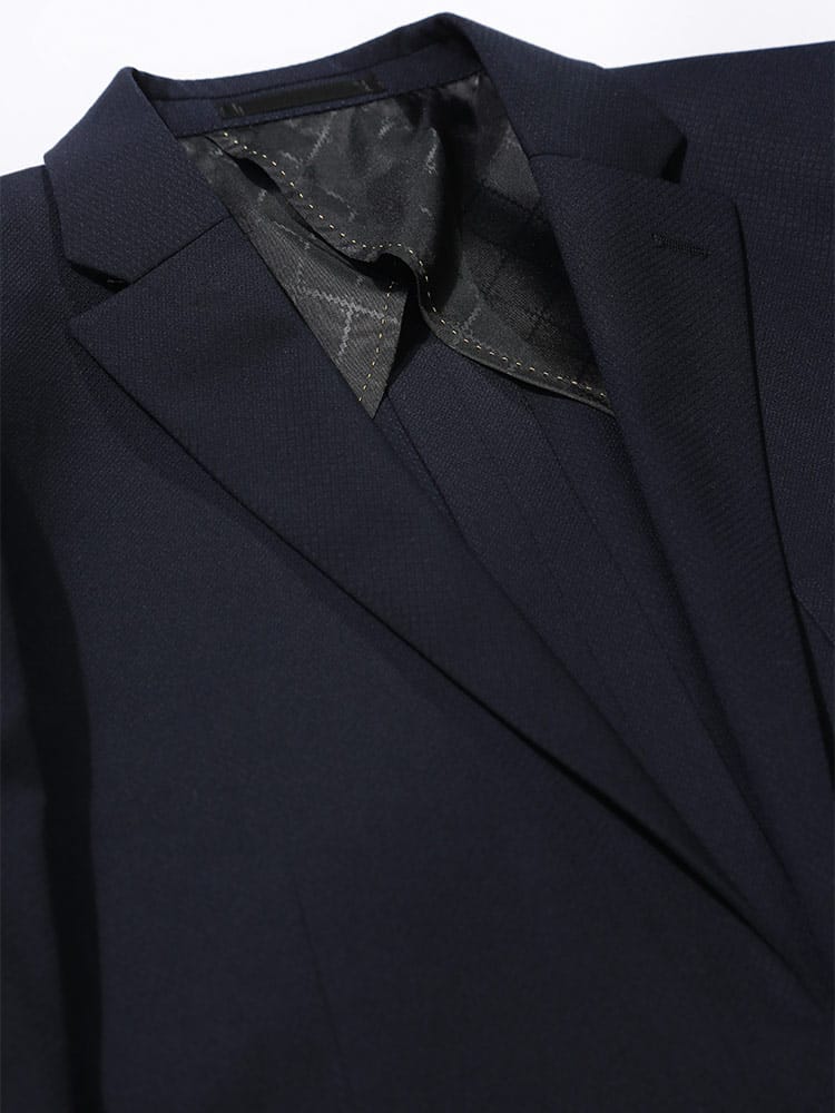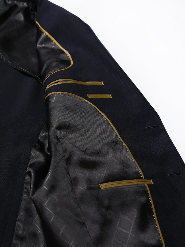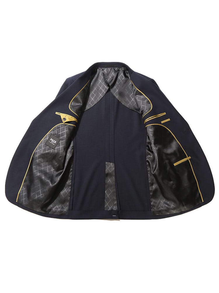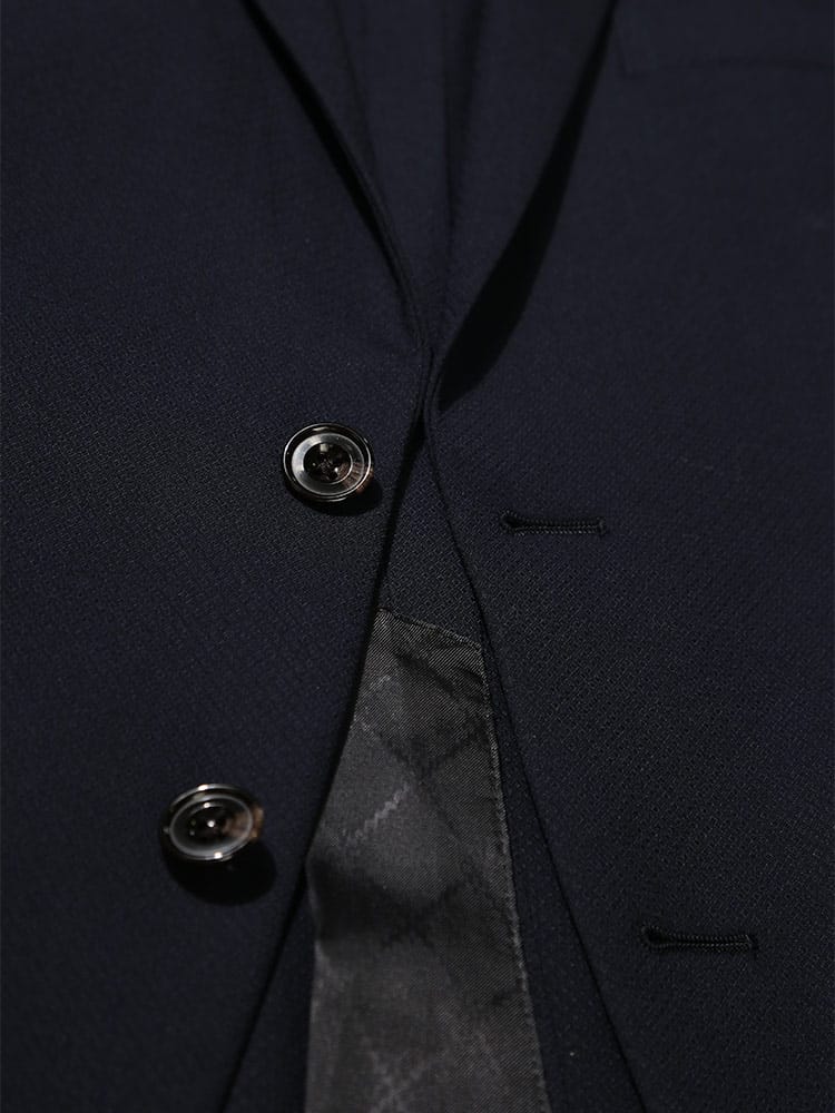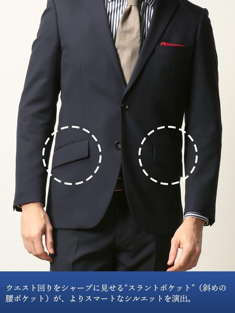 仕様 :外側ポケット数×9つ / 内側ポケット数×4つ / シングル2つボタン / セッパタイプ / 額縁あり / 背抜き / センターベント / ジップフライ / ノータック / ローライズパンツ / 抗ウイルス加工ポケット裏地