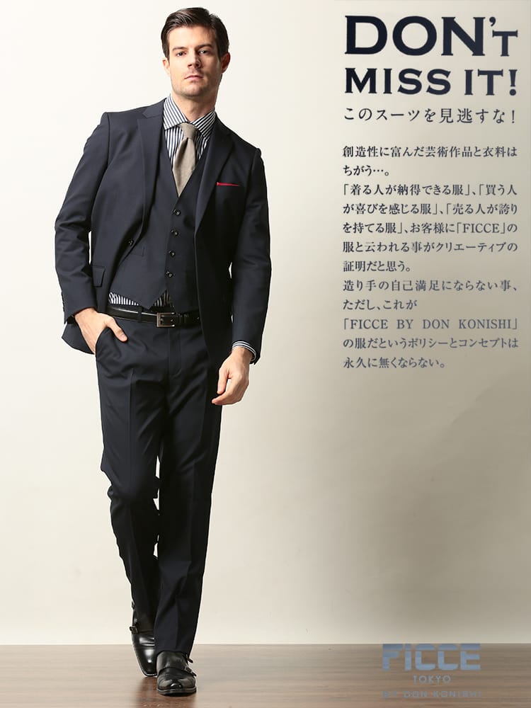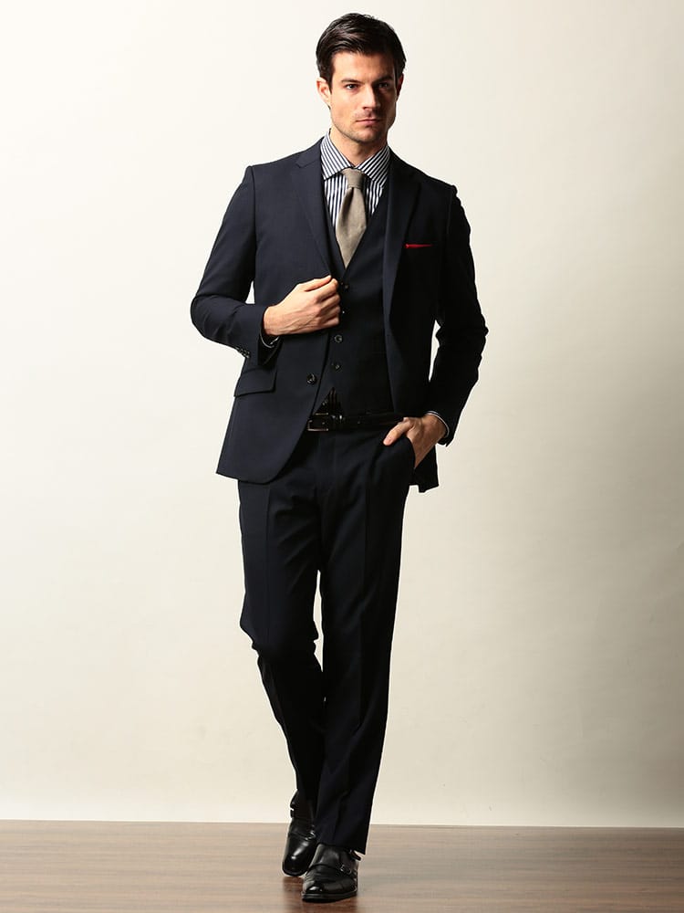 ウール混の上質な生地で仕上げたベスト付きのスリーピーススーツです。2つボタンのシングルジャケットと、パンツはローライズタイプのノータックですっきりとスマートに着こなしていただけます。スラックス前ポケットの袋地に抗ウィルス加工「フルテクト」を施した生地を使用し、清潔さをキープします。ビジネスからフォーマルまで幅広いシーンに活躍するアイテムです。