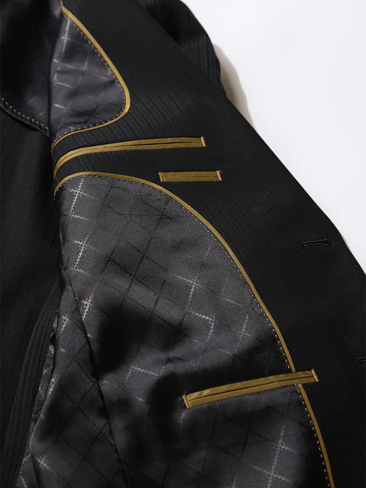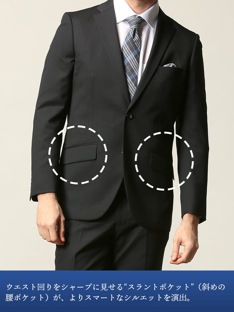 仕様 :外側ポケット数×9つ / 内側ポケット数×4つ / シングル2つボタン / セッパタイプ / 額縁あり / 背抜き / センターベント / ジップフライ / ノータック / ローライズパンツ / 抗ウイルス加工ポケット裏地