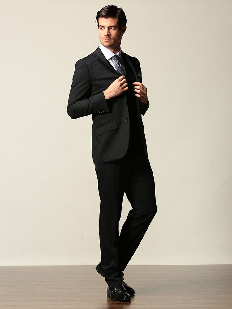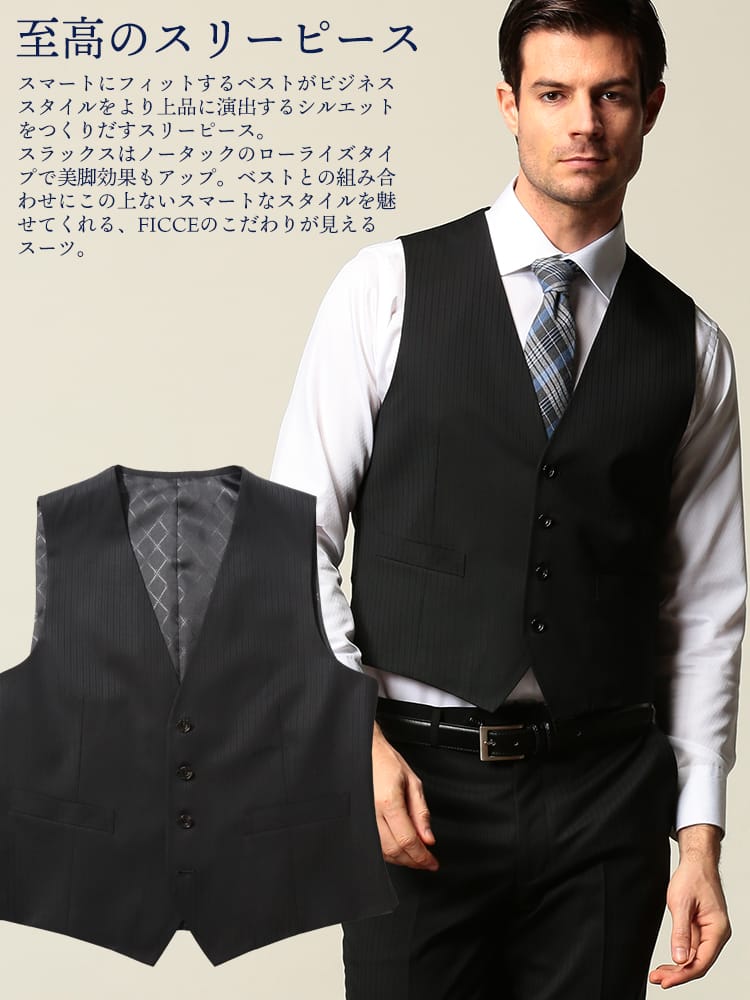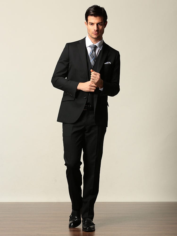ウール混の上質な生地で仕上げたベスト付きのスリーピーススーツです。2つボタンのシングルジャケットと、パンツはローライズタイプのノータックですっきりとスマートに着こなしていただけます。スラックス前ポケットの袋地に抗ウィルス加工「フルテクト」を施した生地を使用し、清潔さをキープします。ビジネスからフォーマルまで幅広いシーンに活躍するアイテムです。