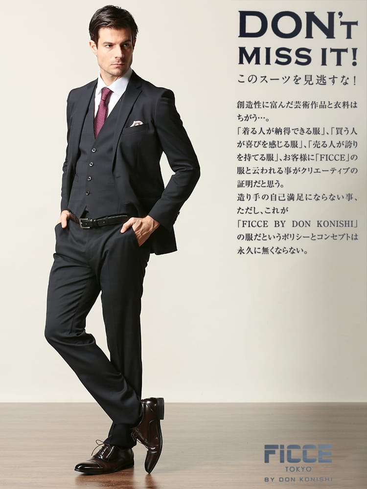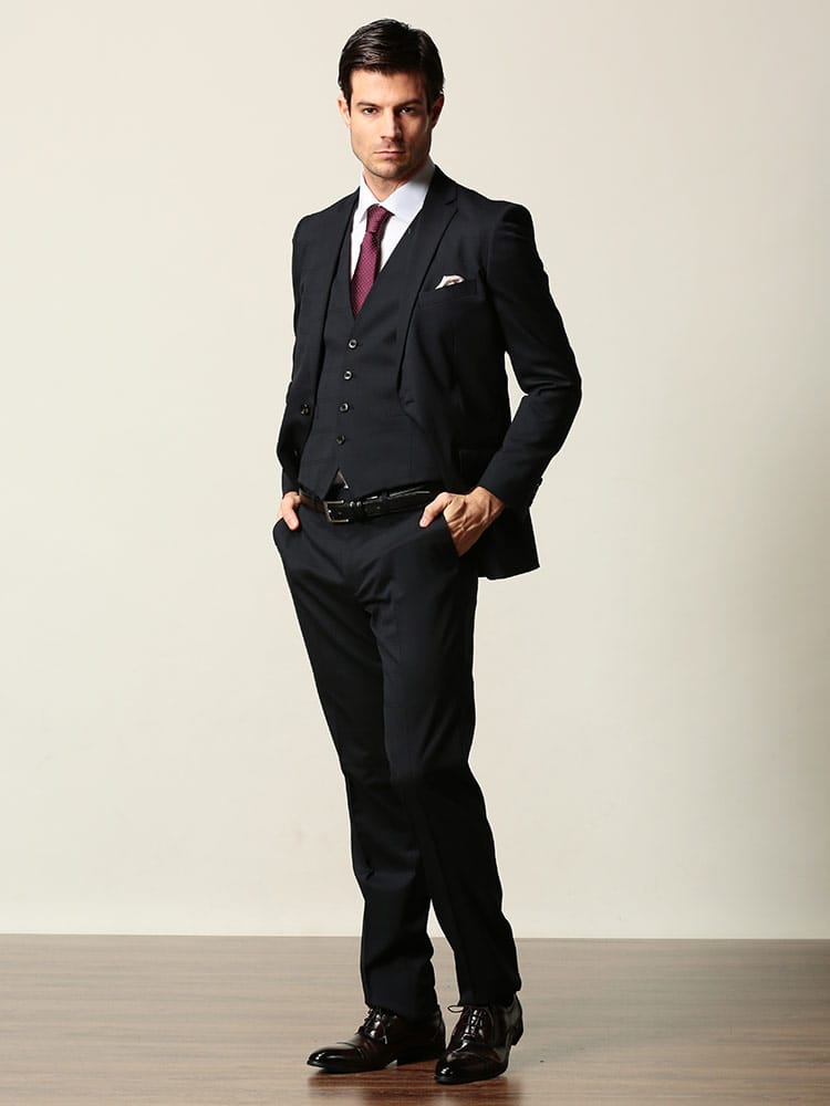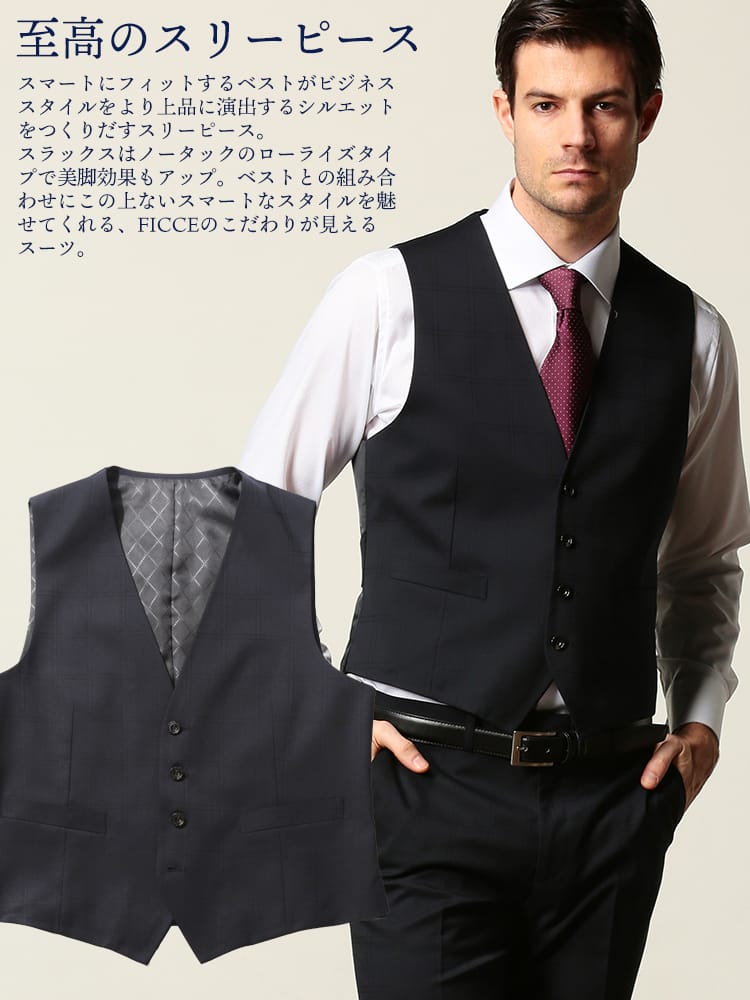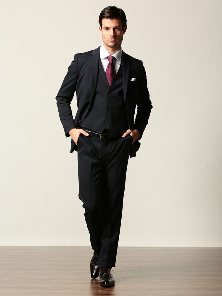 ウール混の上質な生地で仕上げたベスト付きのスリーピーススーツです。2つボタンのシングルジャケットと、パンツはローライズタイプのノータックですっきりとスマートに着こなしていただけます。スラックス前ポケットの袋地に抗ウィルス加工「フルテクト」を施した生地を使用し、清潔さをキープします。ビジネスからフォーマルまで幅広いシーンに活躍するアイテムです。