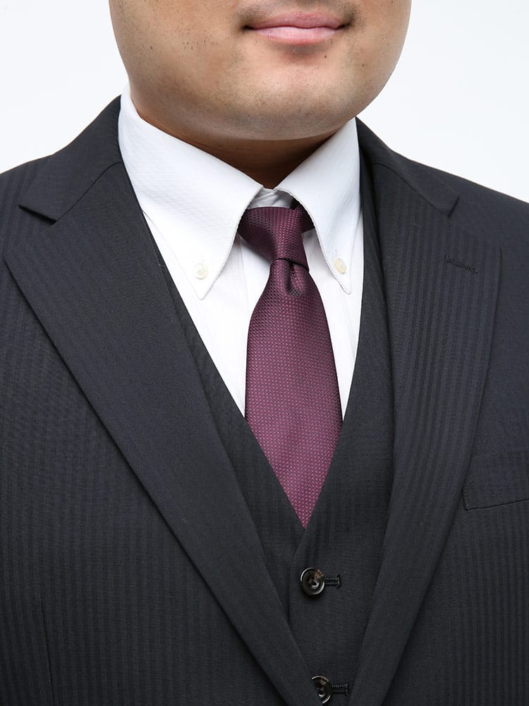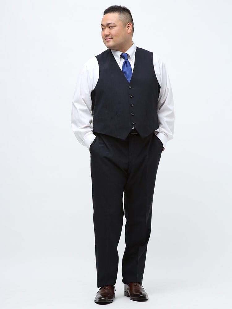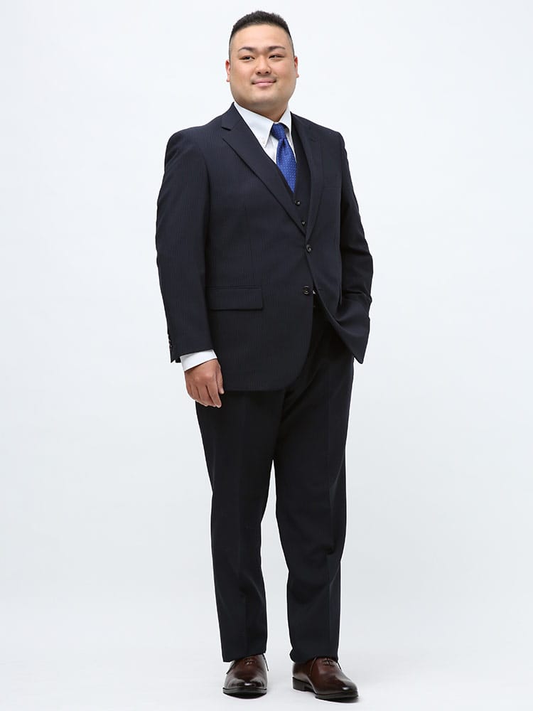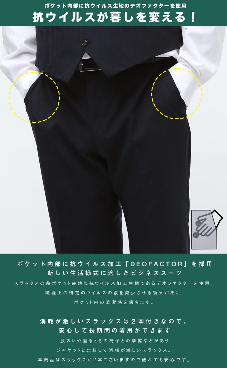 ウール混の上質な生地で仕上げたベスト付きのスリーピーススーツです。洗練された印象のストライプデザイン。毎日着るビジネスマンには嬉しいパンツは2パンツです。2つボタンのシングルジャケットと、パンツはノータックですっきりとスマートに着こなしていただけます。脇ポケットの袋地に抗ウィルス加工「DEOFACTOR」を施した生地を使用し、清潔さをキープします。ビジネスからフォーマルまで幅広いシーンに活躍するアイテムです。