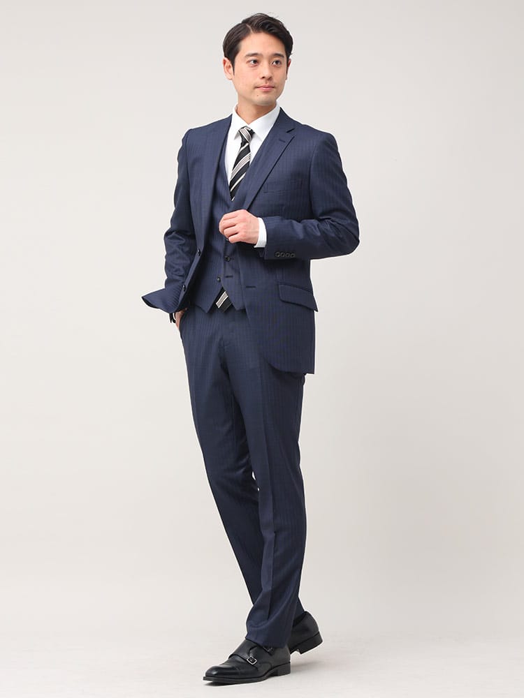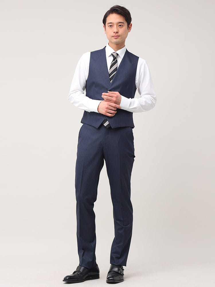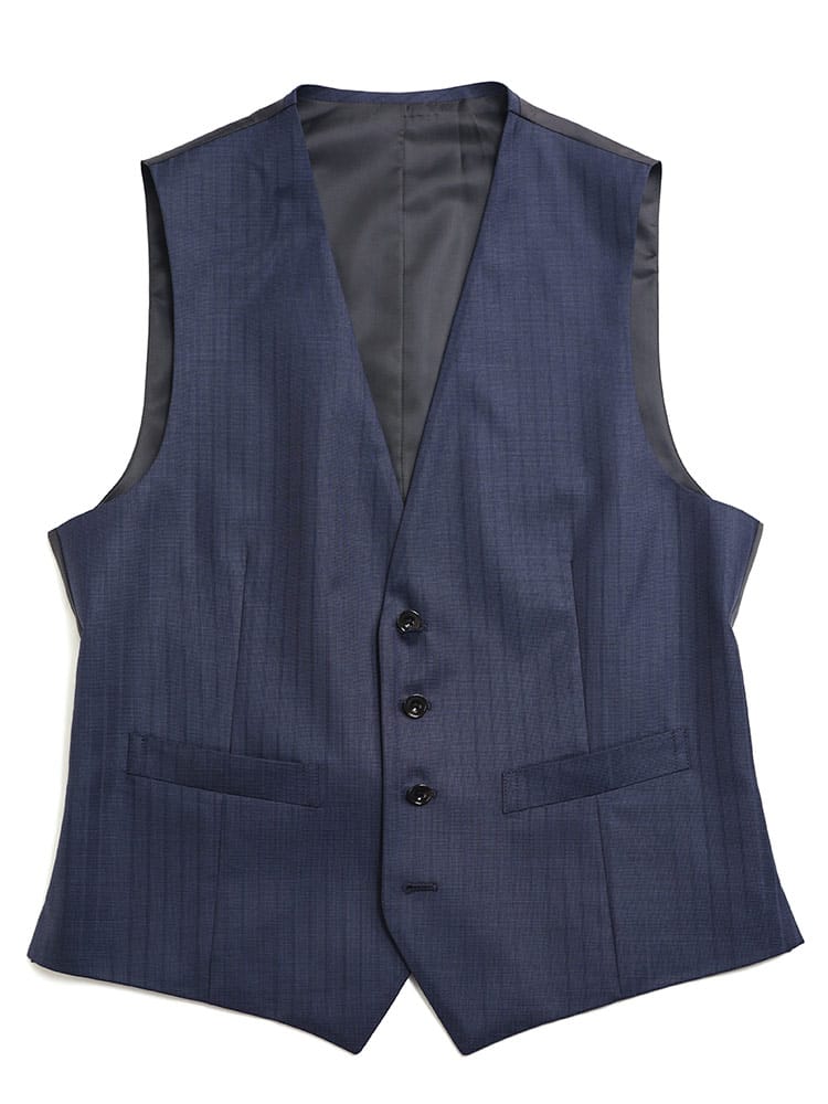 ウール混の上質な生地で仕上げたベスト付きのスリーピーススーツです。2つボタンのシングルジャケットと、パンツはローライズ仕様のノータックですっきりとスマートに着こなしていただけます。ビジネスからフォーマルまで幅広いシーンに活躍するアイテムです。