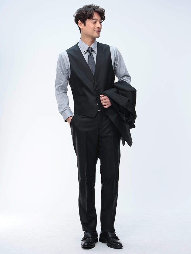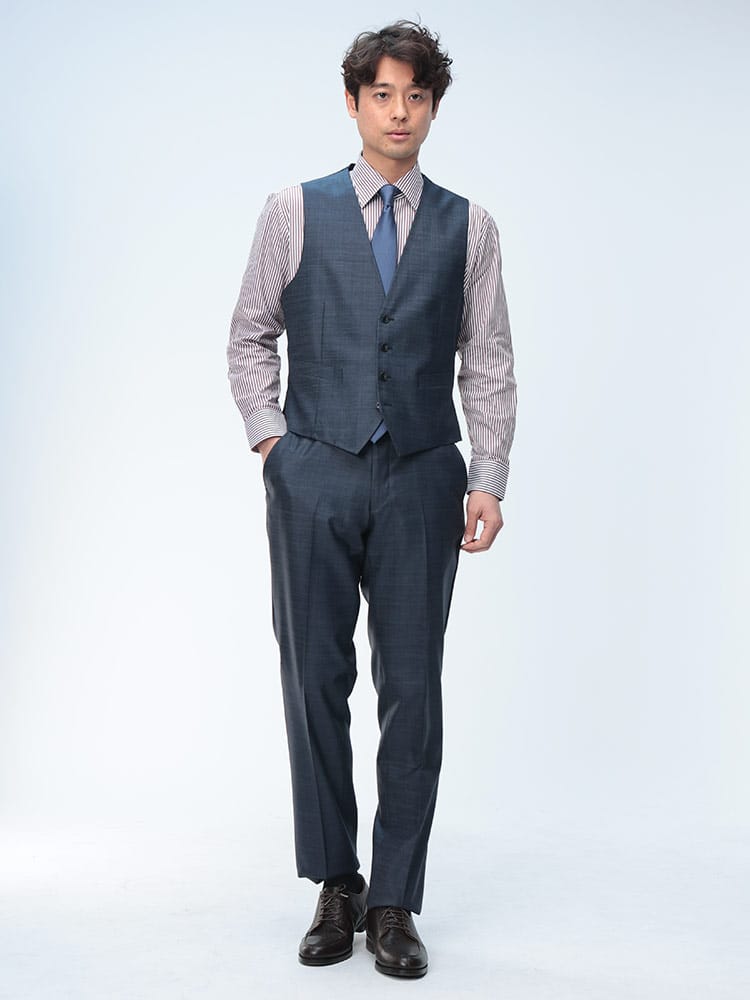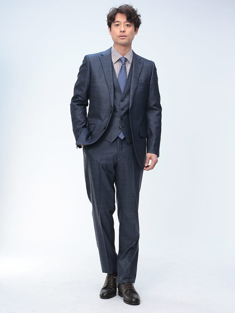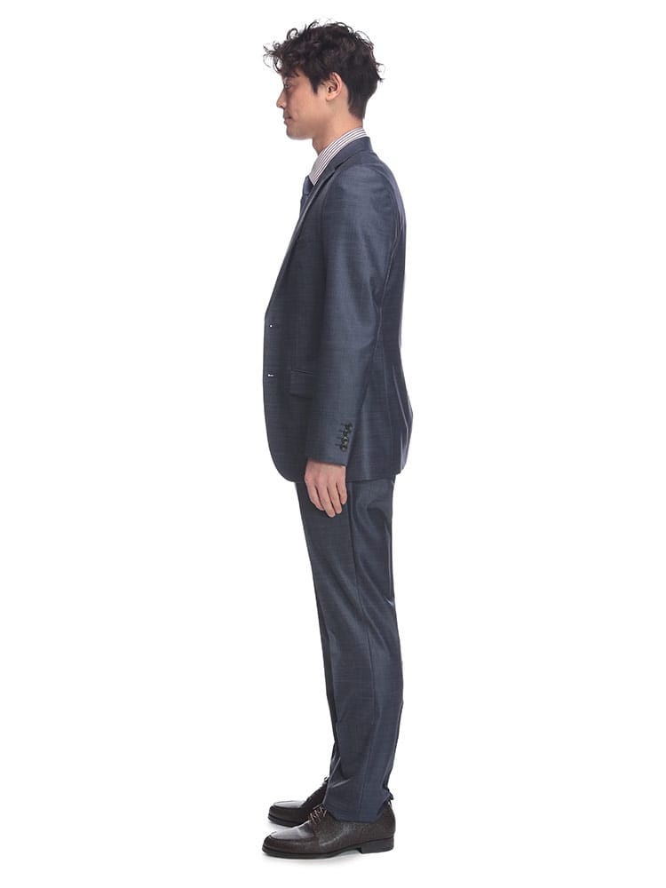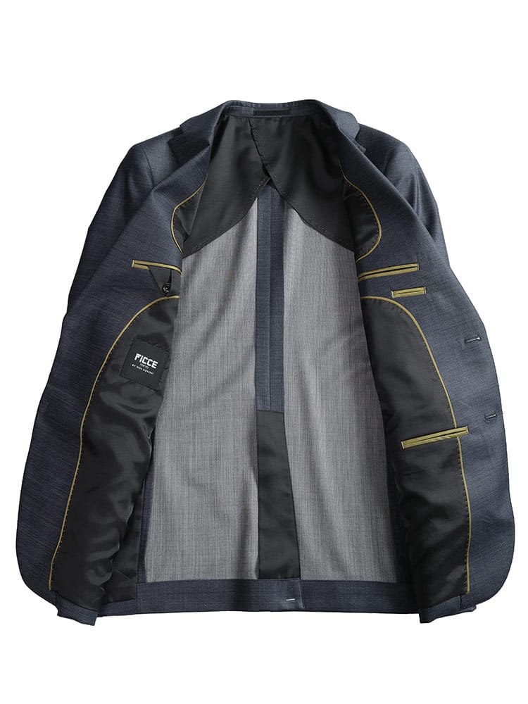 仕様 :ジャケット外側ポケット数×3つ / 内側ポケット数×3つ /内側ペンポケット数×1つ / シングル2つボタン / 背抜き / 額縁あり / センターベント / セッパタイプ / スラックスポケット×4つ / ジップフライ / ノータック / ベスト付き
