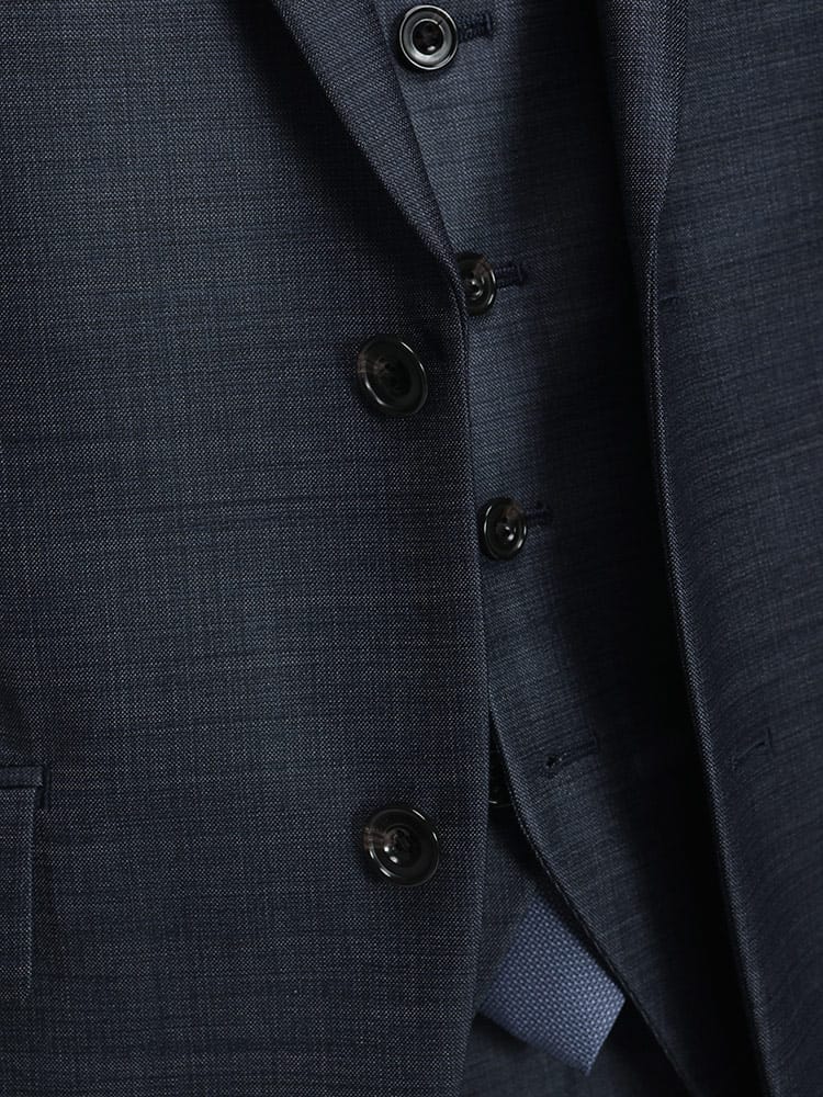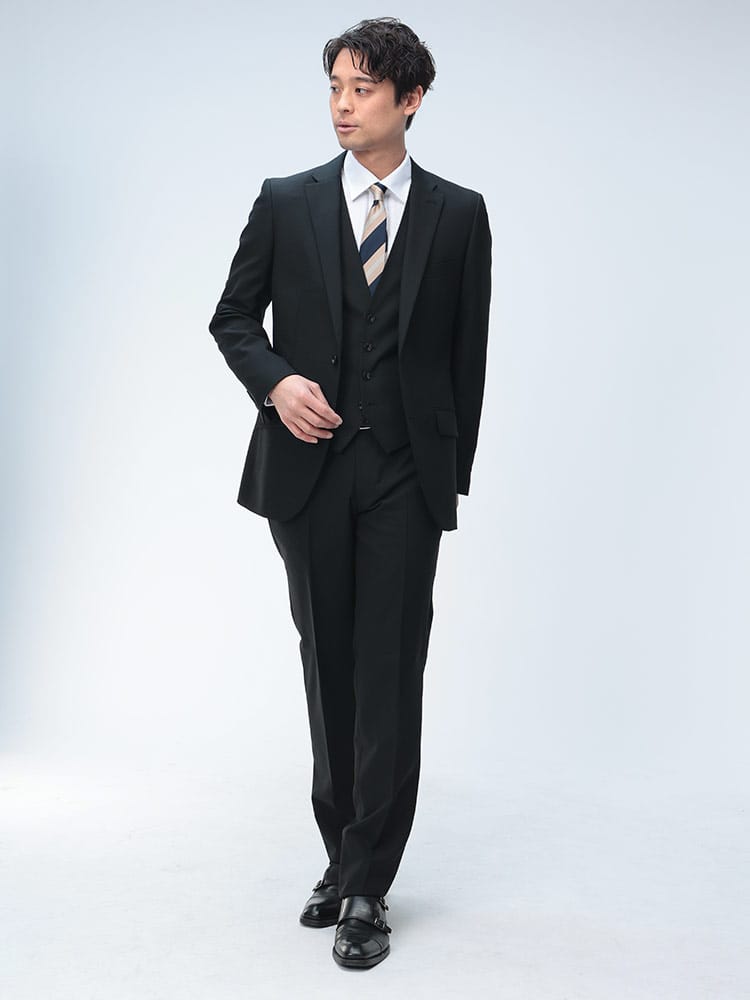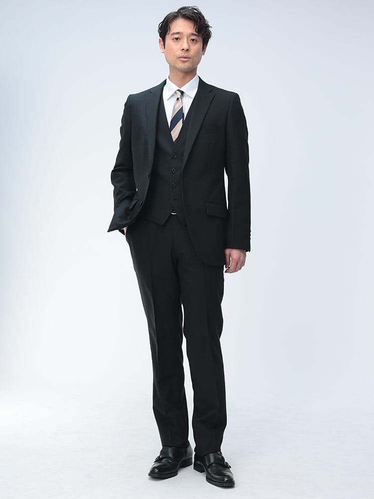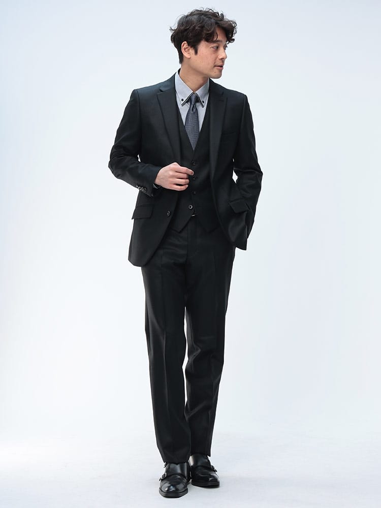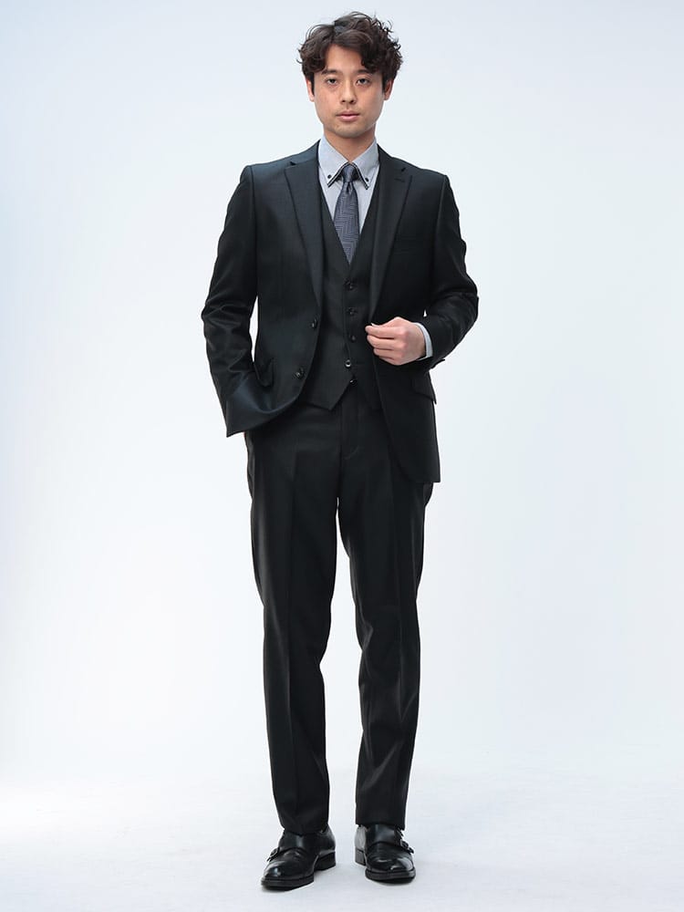 仕様 :ジャケット外側ポケット数×3つ / 内側ポケット数×3つ /内側ペンポケット数×1つ / シングル2つボタン / 背抜き / 額縁あり / センターベント / セッパタイプ / スラックスポケット×4つ / ジップフライ / ノータック / ベスト付き