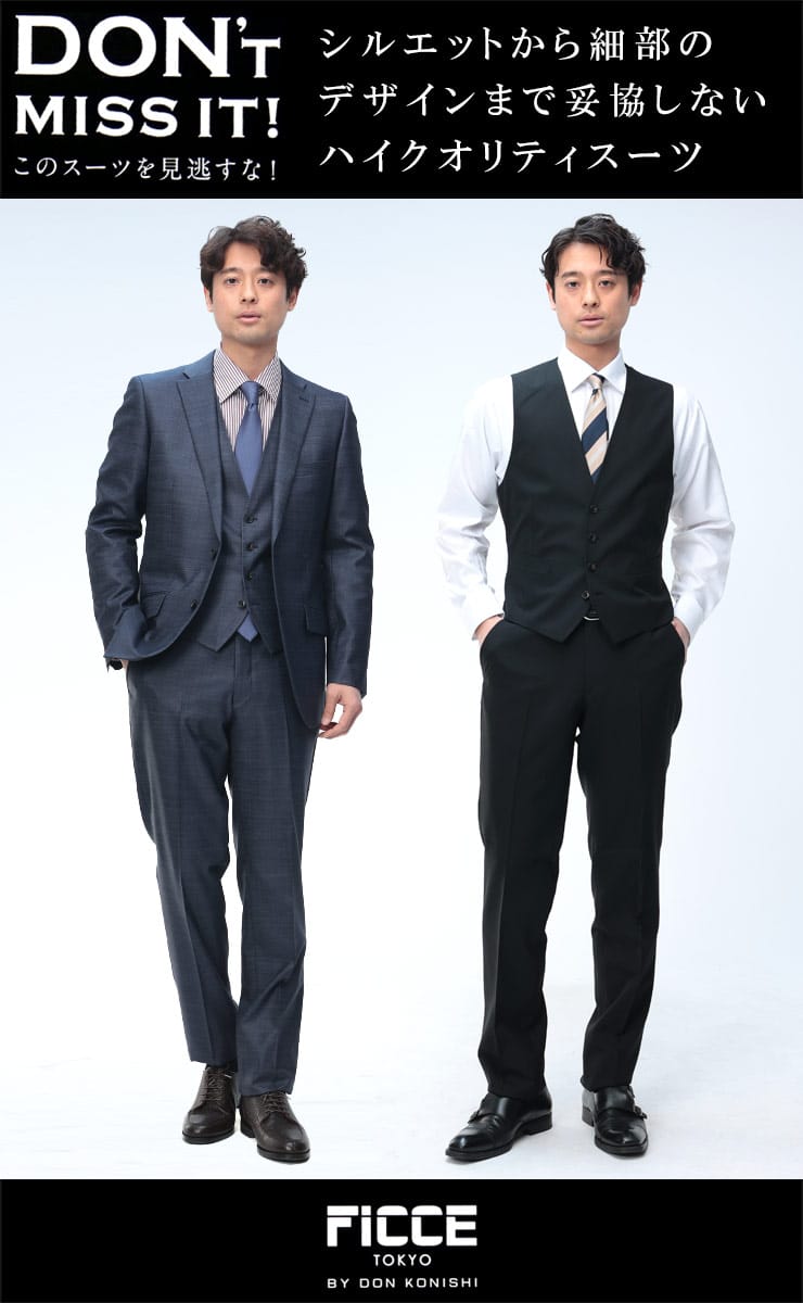 洗練されたスタイルを演出する、FICCEのウール混スリーピーススーツ。上質なウール混素材が、滑らかな肌触りと深みのある光沢感を実現。ジャケットは、シングル2つボタン、背抜き仕様で、軽快な着心地。センターベント、セッパタイプ、額縁仕立てなど、本格的なディテールもポイント。スラックスは、ノータックで、すっきりとしたシルエット。ベスト付きで、3通りの着こなしが楽しめます。ビジネスシーンはもちろん、パーティーや結婚式などのフォーマルな場面にも最適。豊富なサイズ展開で、様々な体型にフィットします。