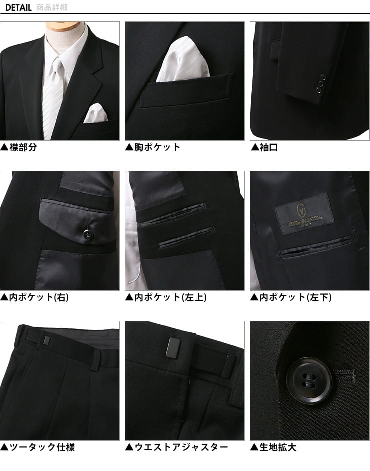 GIANNI VALENTINO 3シーズン対応シングル2ツ釦礼服です。高品質素材「SUPER 100's」を使用し仕立てられた礼服です。両内ポケット周囲は台場仕立てとなっており、胸周りのシルエットを綺麗に保ちます。ブラックカラーも「ULTRA BLACK」のしっかりと濃い色のブラックとなっております。