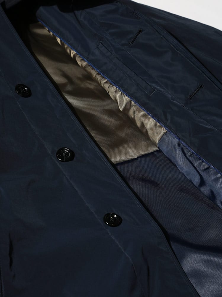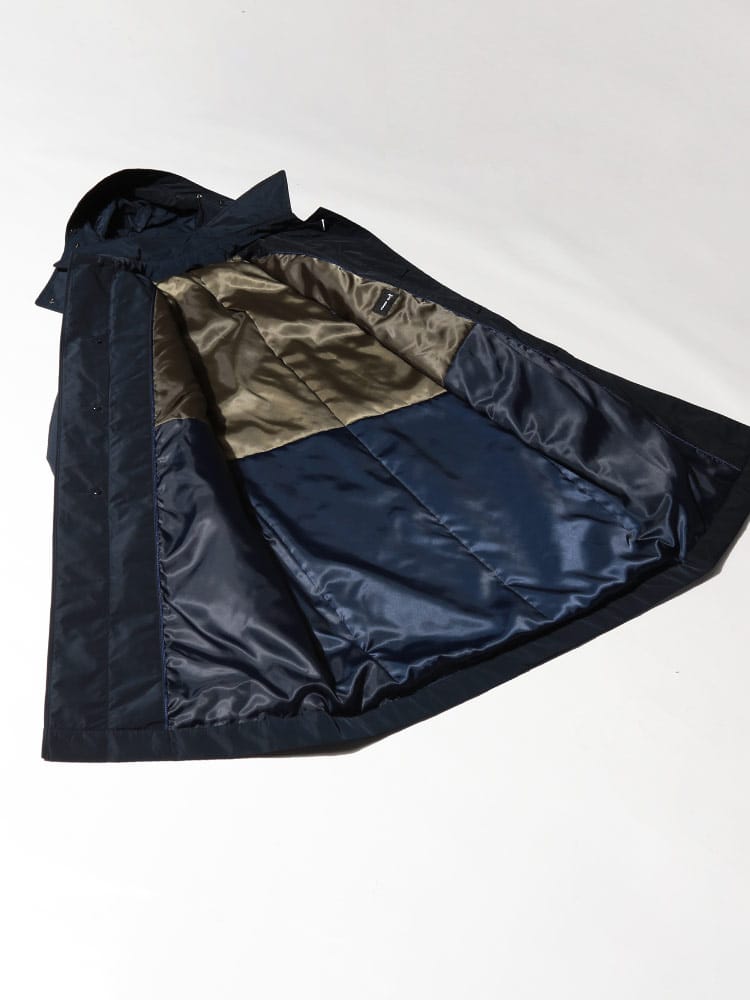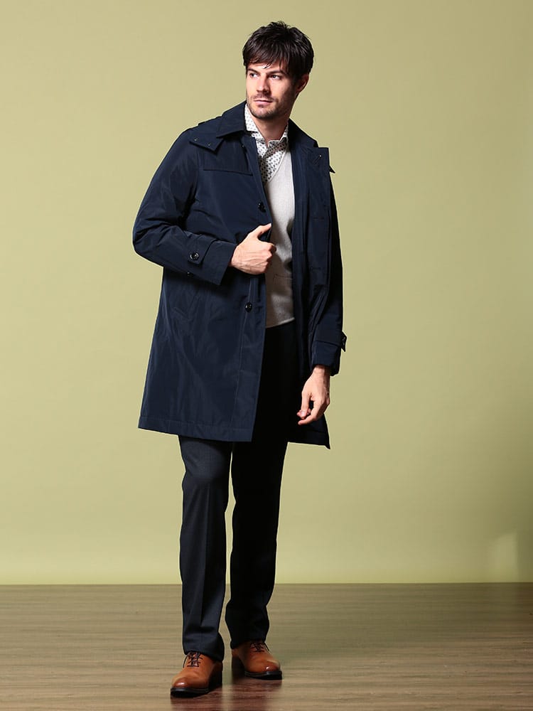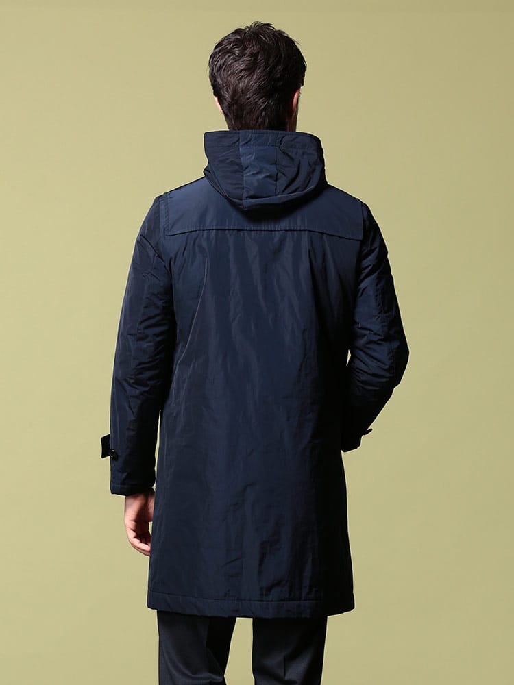 撥水加工を施したフード取り外し 中綿 シングル コートです。中綿にはフロイデンベルグの技術を駆使した高機能中綿のComfortemp(コンフォテンプ)を使用し、快適な着心地を提供します。無地のシンプルなデザインでビジネスシーンに最適な一着です。
