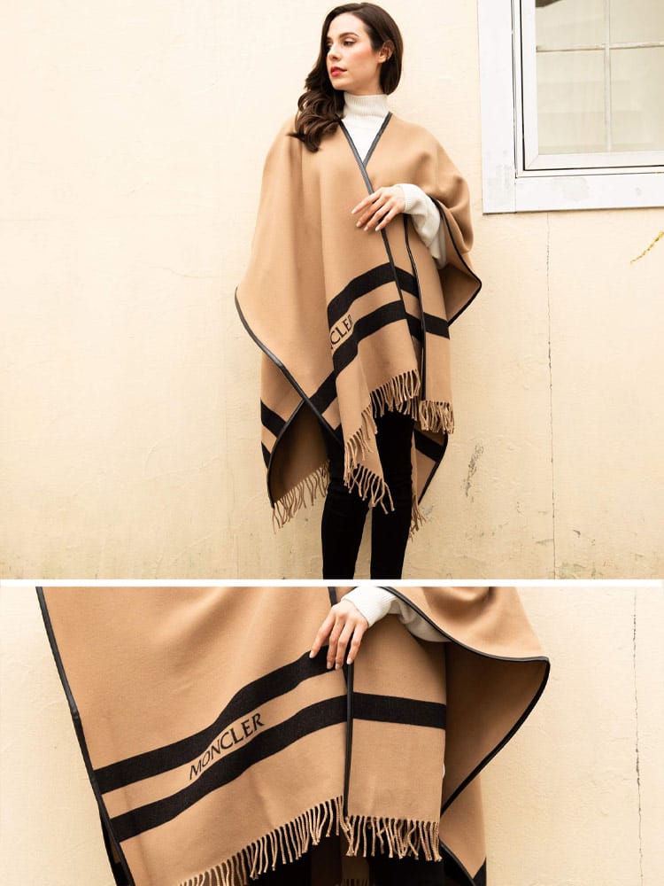 かわいい!欲しい!私が一目惚れした1着です。ポンチョだから軽く羽織れるのに高級な羊毛100%なのでとっても暖かくコートの役割にも♪ちょっとコンビニへ行く時や車移動でそこまで厚手のアウターが必要じゃない時に1枚持っているととっても便利です!注目すべきは、まさかのレザー縁取り!端からほつれてくる事もないので長く使えますね!ジャガード織でほんの少し立体感があってしっとりソフトな肌触りです★マフラーのように巻くこともできるし、お手持ちのベルトでウエストを止めてもかわいいですよ~!