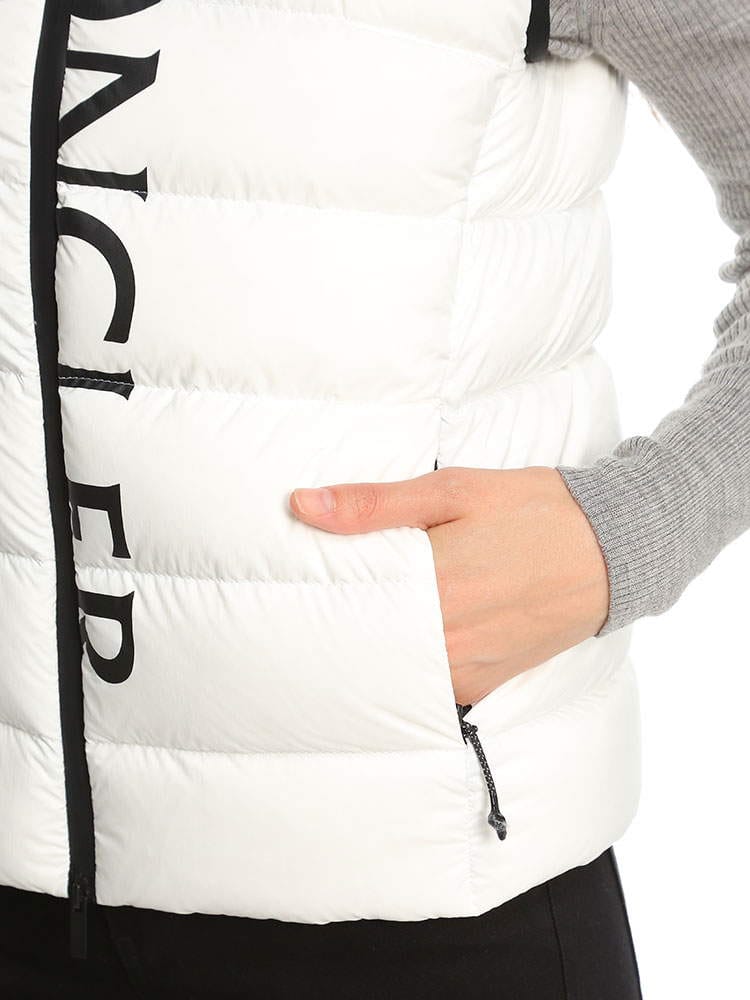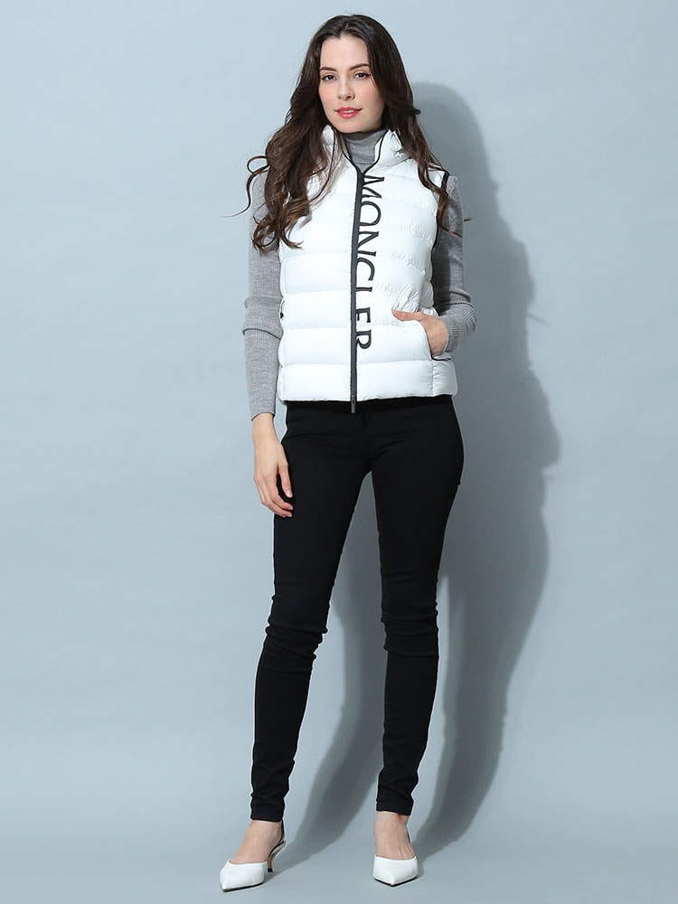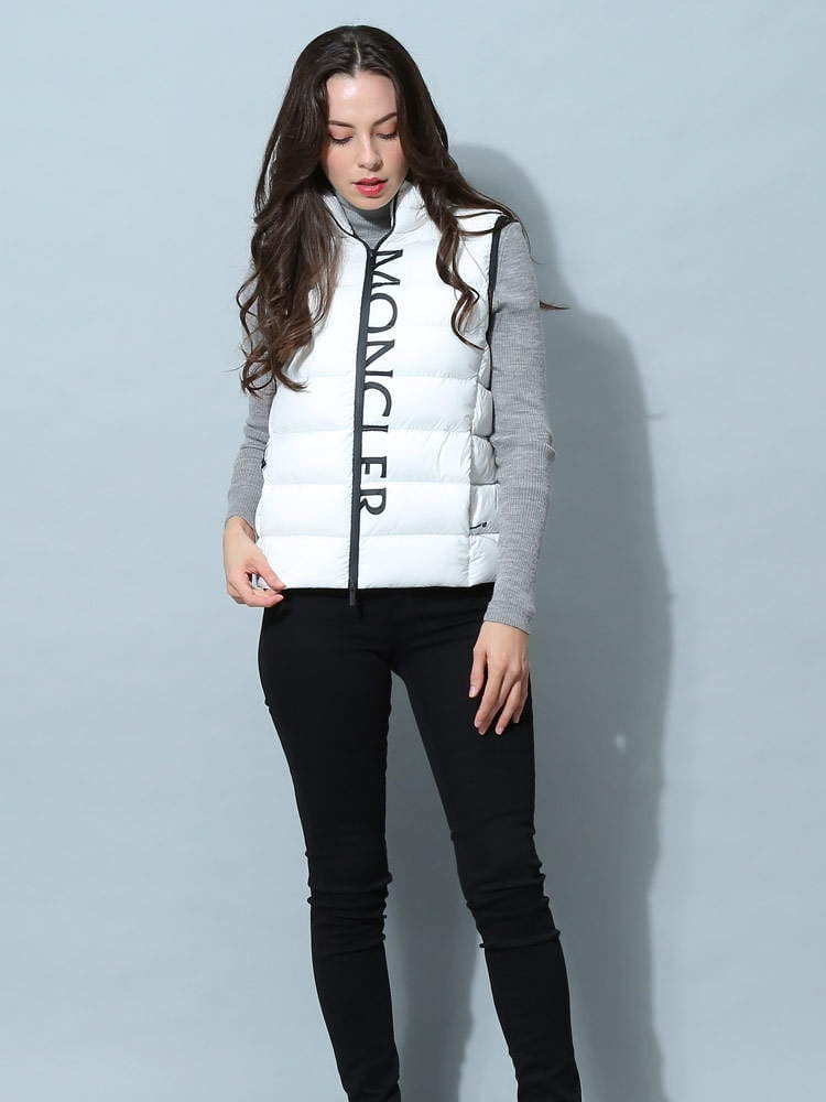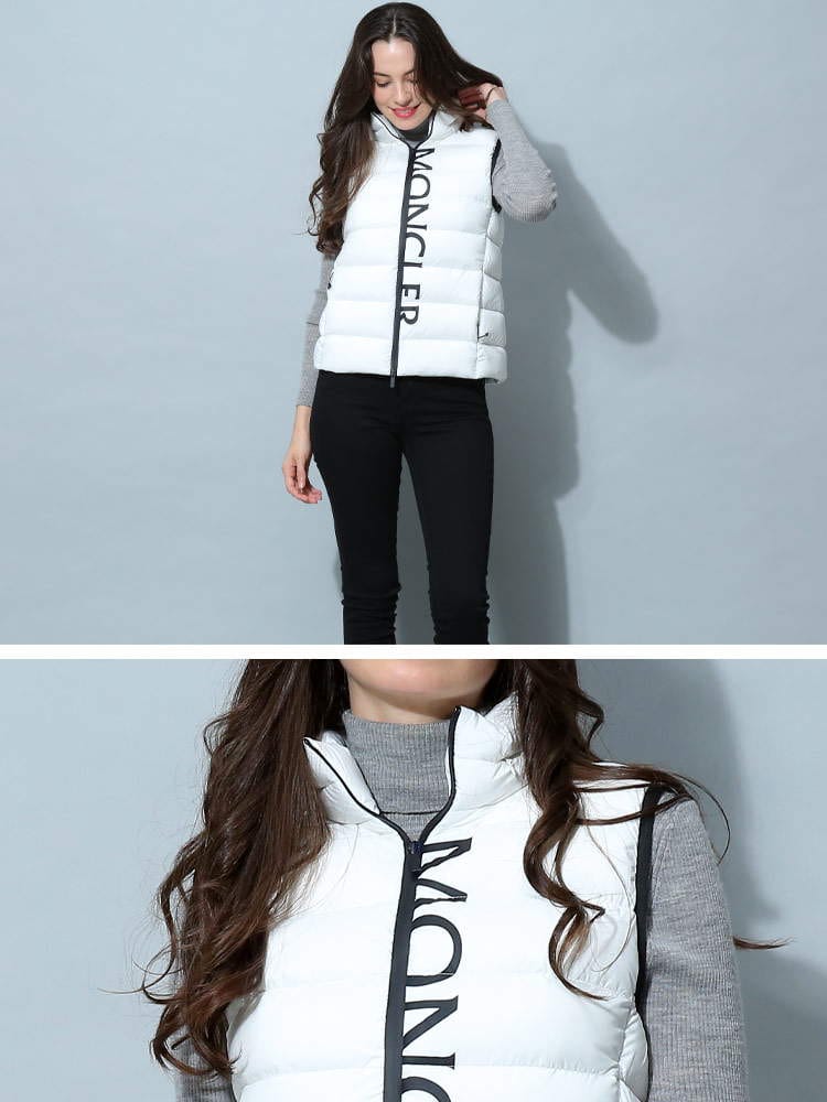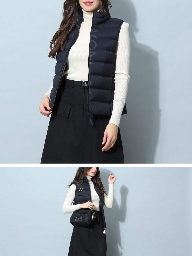 2022年秋冬新作のモンクレールレディースベストです。高級ダックダウンを90%も配合されており、暖かくとっても軽いのが特徴です。防風ジップでハイネックタイプはマフラー要らずでご着用頂けます。首の後ろには細目のジップが付いておりフードを出す事が出来ますので2WAYで楽しめますね。コートやジャケットのインナーダウンとしても活躍しますよ!ホワイトはモノトーンのバイカラー、ブラックはオールブラックでどちらもシンプルで飽きがこないデザインです。カジュアルにもフェミニンにも、またはビジネス用としても活躍する一着です。ポケット付きなのも嬉しいですね。サイズ感はごわつかないスリムフィットになりますので、通常のサイズでもご着用頂けますが大き目がお好みでしたらワンサイズ上げてくださいね。私は普段Lサイズですが、Lでピッタリ、Mだと厚手のインナーを着たときに窮屈でした。( スタッフS )・マットなロングセゾン素材を使用