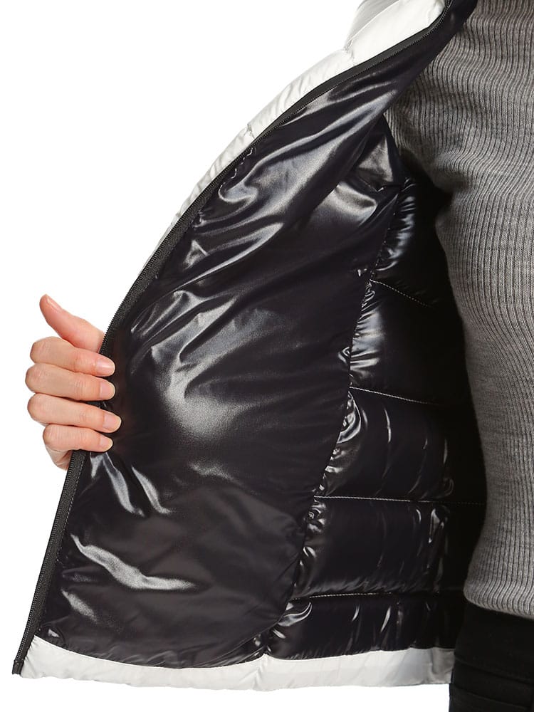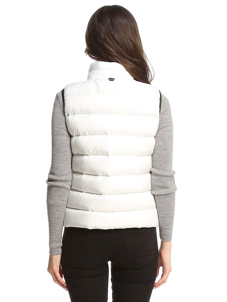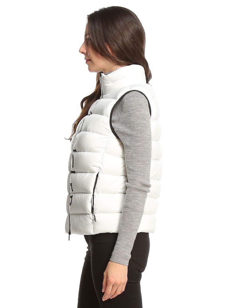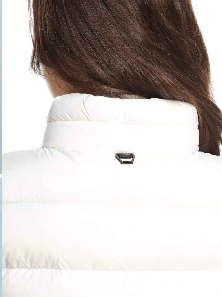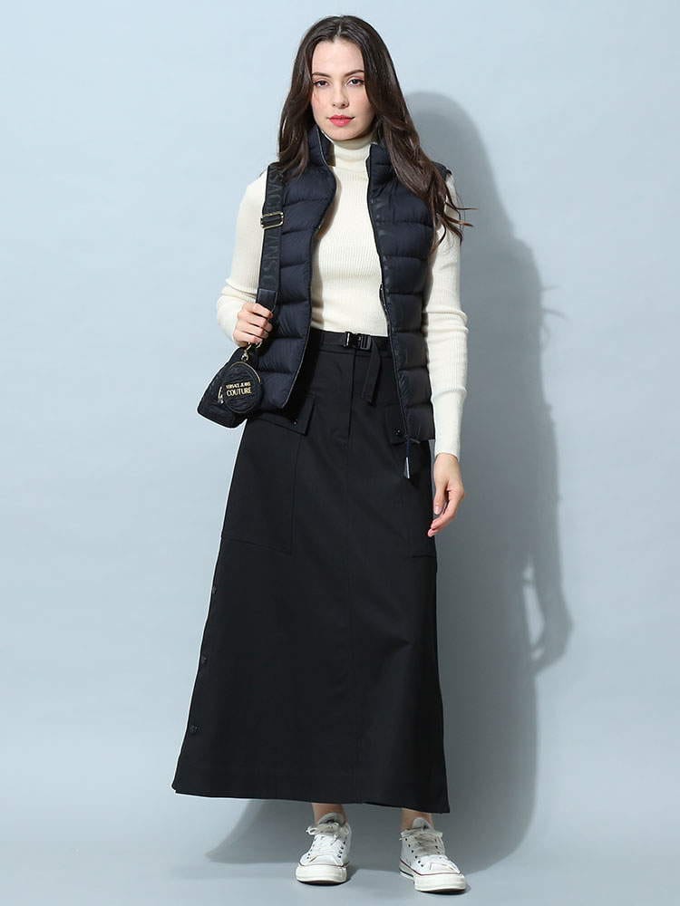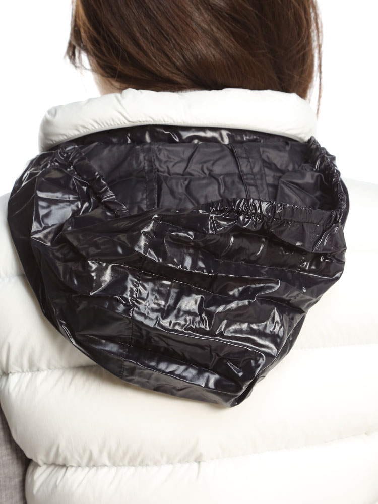 2022年秋冬新作のモンクレールレディースベストです。高級ダックダウンを90%も配合されており、暖かくとっても軽いのが特徴です。防風ジップでハイネックタイプはマフラー要らずでご着用頂けます。首の後ろには細目のジップが付いておりフードを出す事が出来ますので2WAYで楽しめますね。コートやジャケットのインナーダウンとしても活躍しますよ!ホワイトはモノトーンのバイカラー、ブラックはオールブラックでどちらもシンプルで飽きがこないデザインです。カジュアルにもフェミニンにも、またはビジネス用としても活躍する一着です。ポケット付きなのも嬉しいですね。サイズ感はごわつかないスリムフィットになりますので、通常のサイズでもご着用頂けますが大き目がお好みでしたらワンサイズ上げてくださいね。私は普段Lサイズですが、Lでピッタリ、Mだと厚手のインナーを着たときに窮屈でした。( スタッフS )・マットなロングセゾン素材を使用