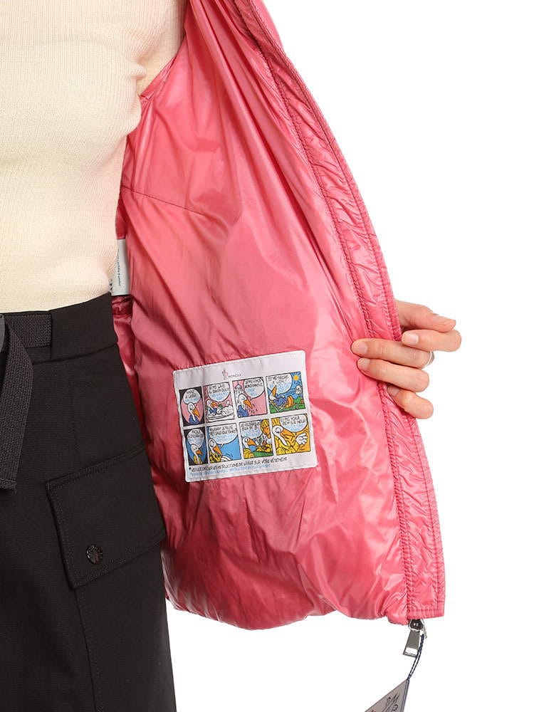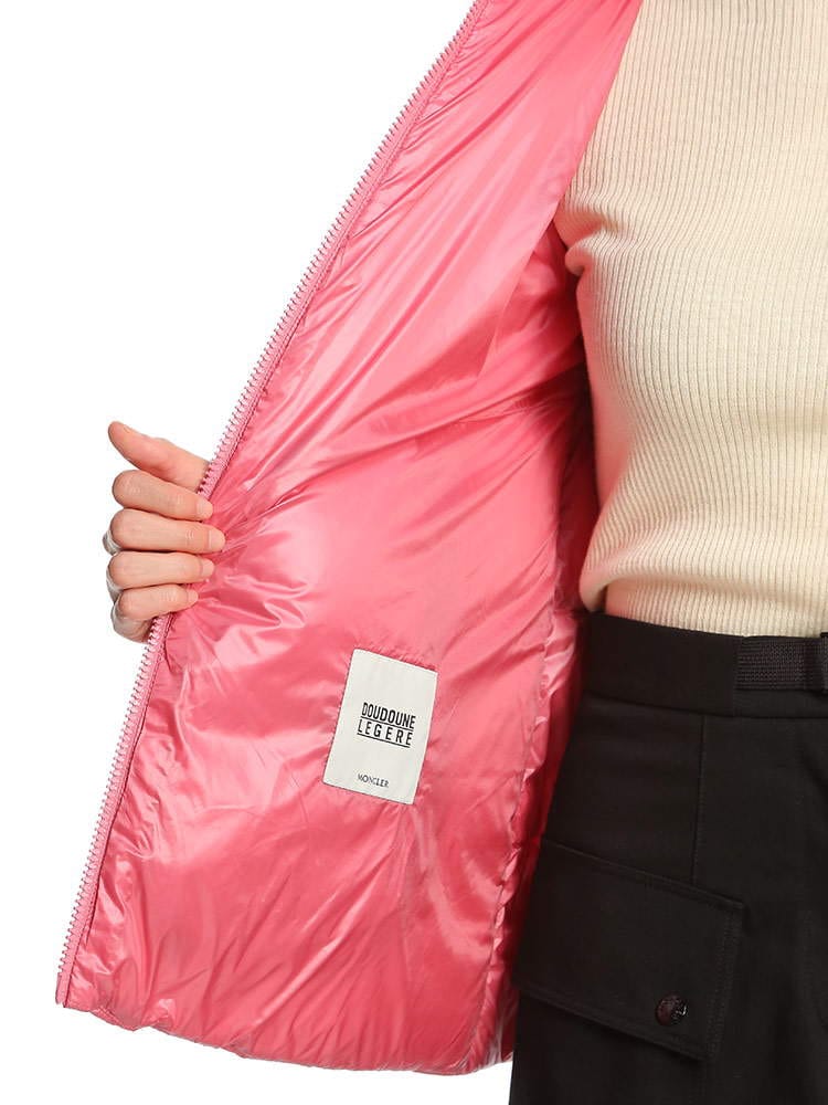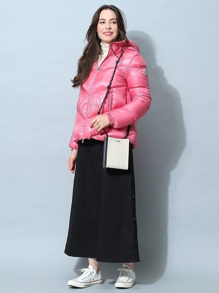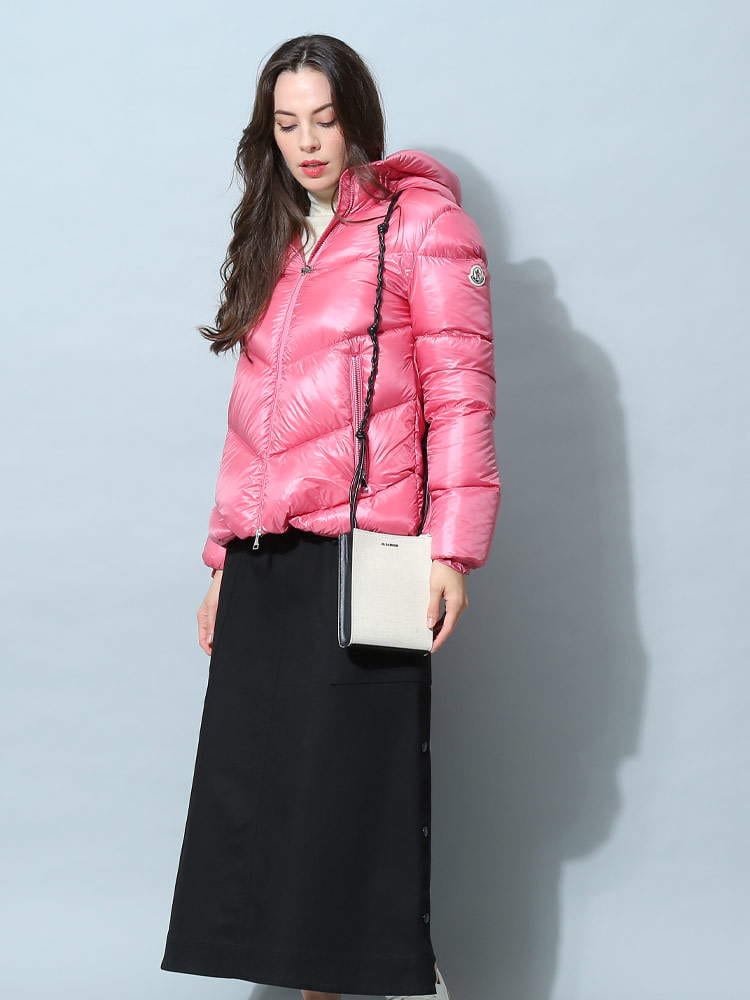 2022年秋冬新作のモンクレールレディースダウンです。高級ダックダウンをふんだんに90%も入っておりますので防寒性に優れ、とっても軽いのが特徴です。光沢のある薄手ナイロン素材を使用していますので、脱いでもかさばらないのが嬉しいポイント。一番上までジップを上げるとハイネックになりますのでマフラー要らず!レギュラーフィットになりますが、肩幅は少し狭めで華奢見えします。また、身幅からヒップにかけて広がる、女性らしいAラインシルエットですので厚手のインナーも当たりが出る事なくスマートに着用できますよ。私は普段Lサイズですが、Lサイズで少し大きく、Mサイズでも問題なく着用できました。シンプルで飽きの来ないデザインはデニムやワンピースと合わせて長年お使い頂けますね。通勤用にもピッタリです。( スタッフS )