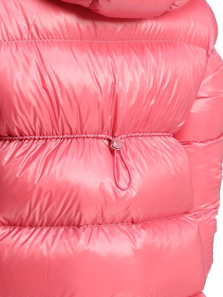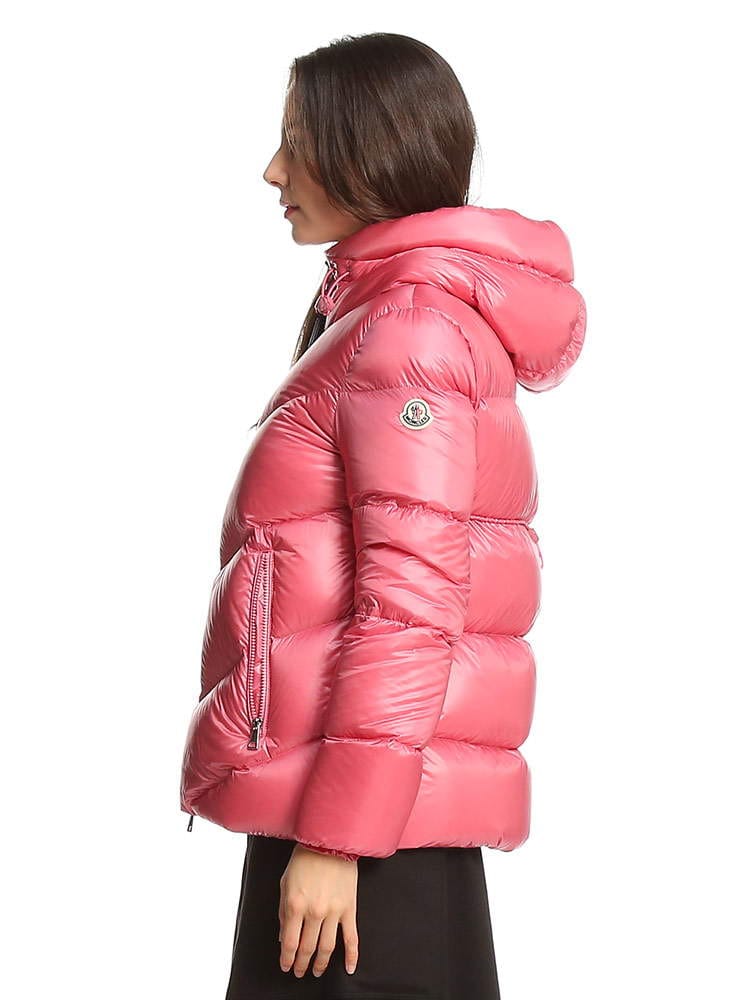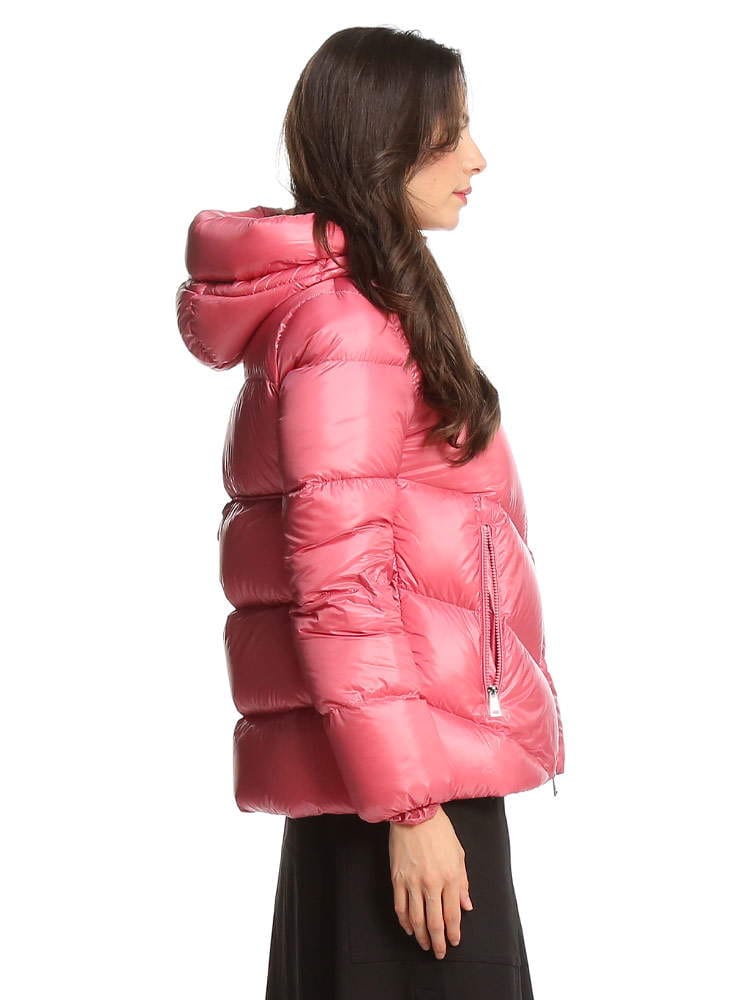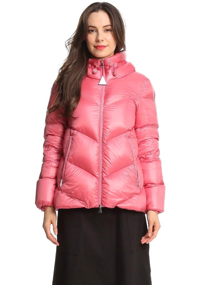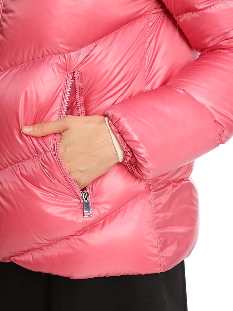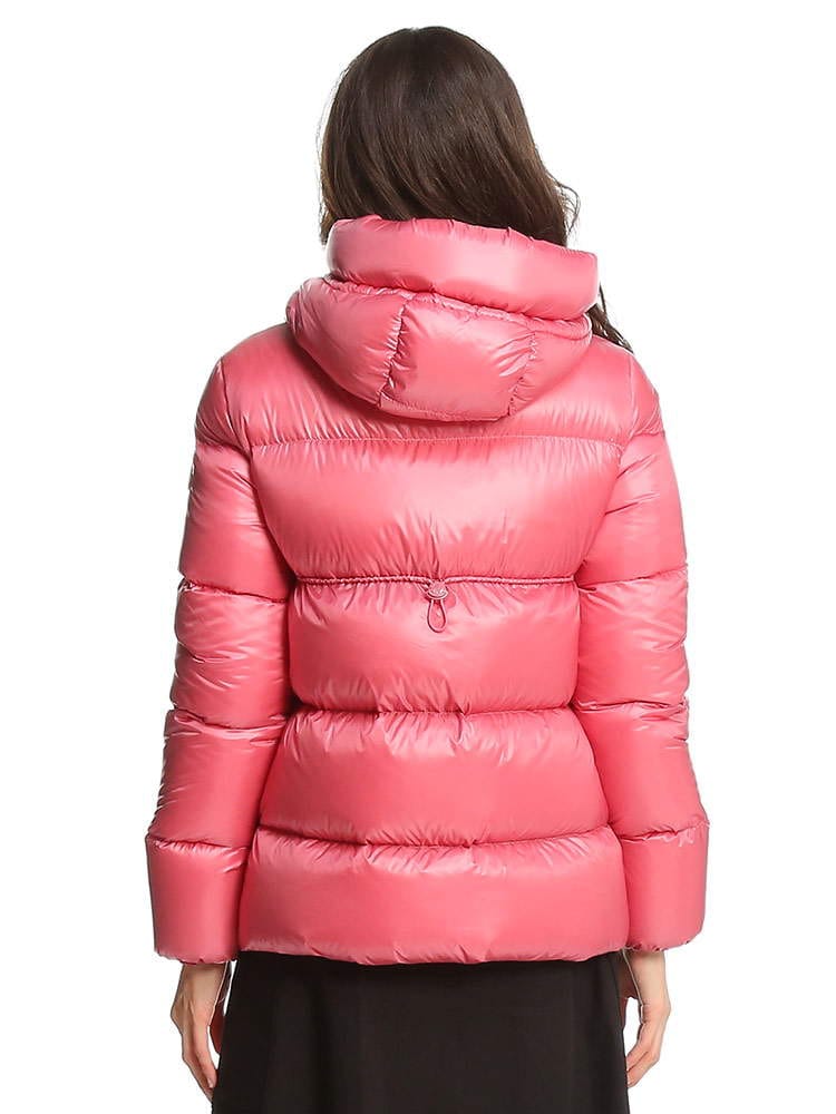 ・薄手ナイロンラケ素材を使用・薄手ナイロン素材の裏地・ダウンパディング入り・フード・ジッパークローズ・ジッパーポケット付レギュラーフィットスリムショルダーフレアウエストとヒップ商品名:Chambon ショートダウンジャケット