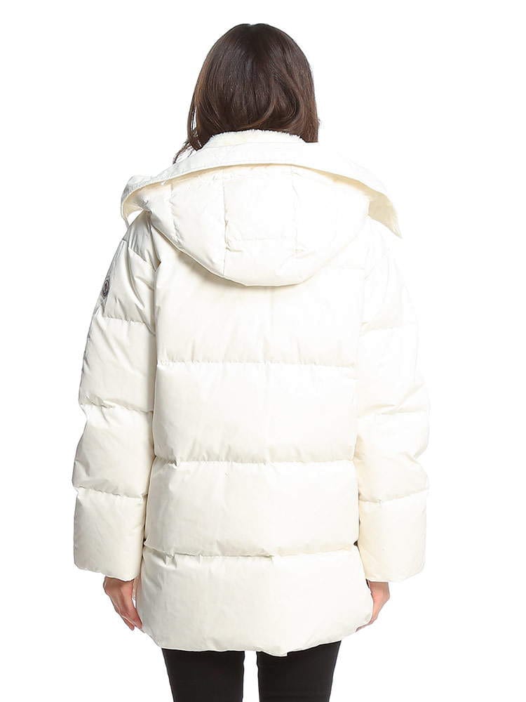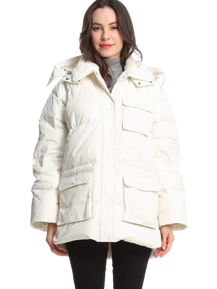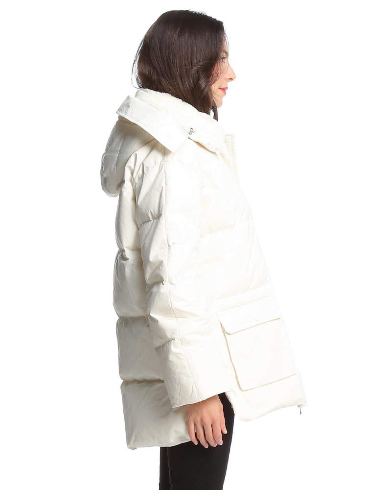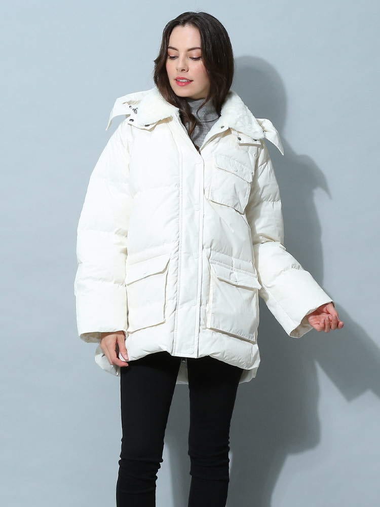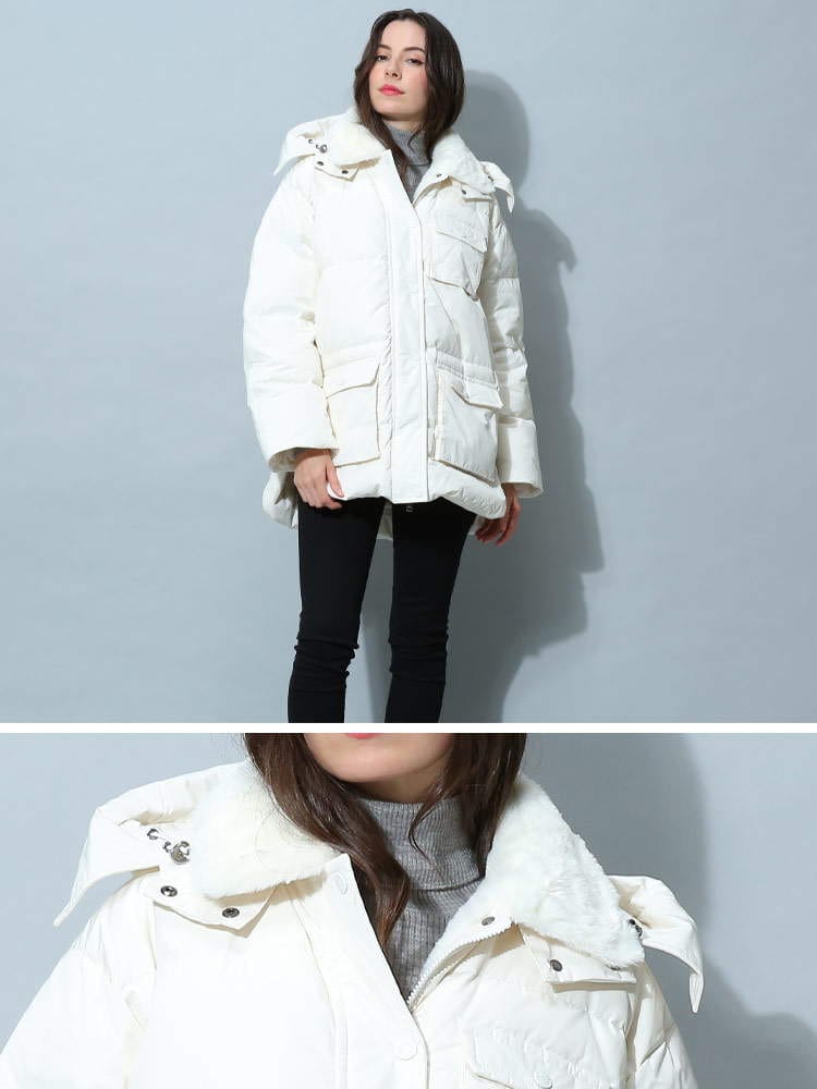 カジュアルな印象のシルエットですが、首元にフェイクファーの襟がついていることで上品な印象に。取り外し可能なフードを取り外していただくことで、さらに上品で女性らしく演出することができます。
