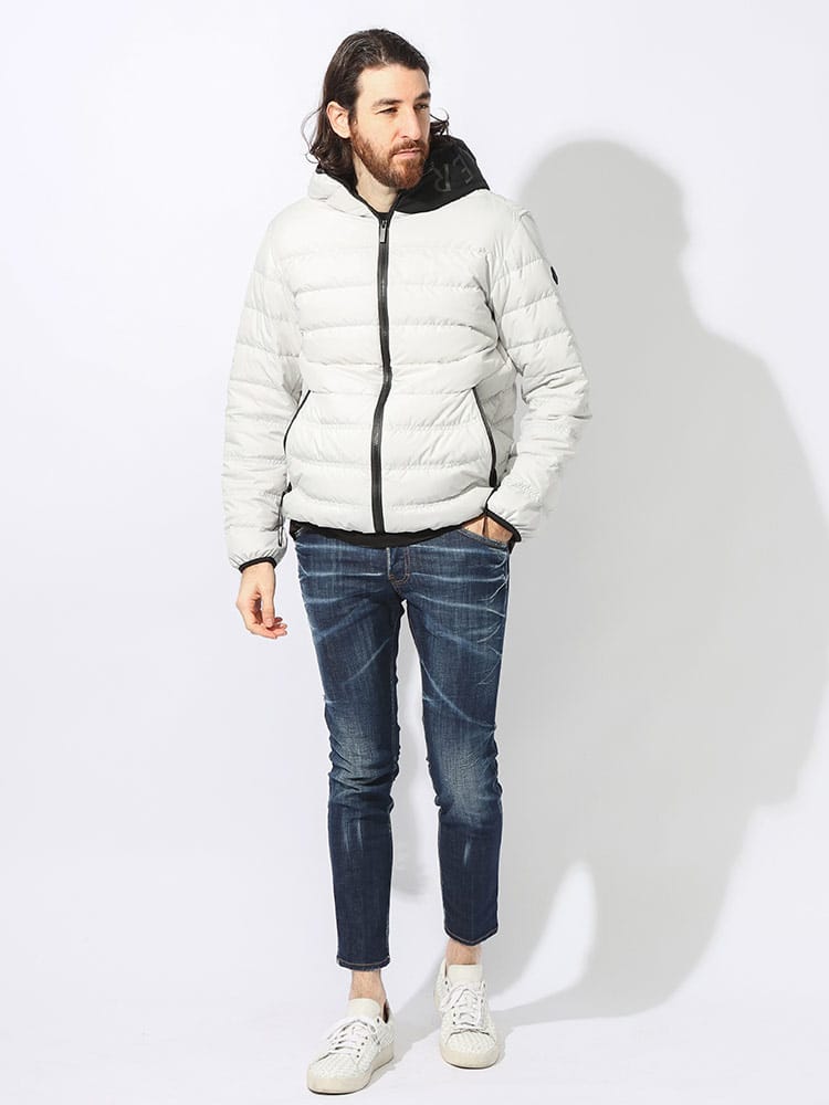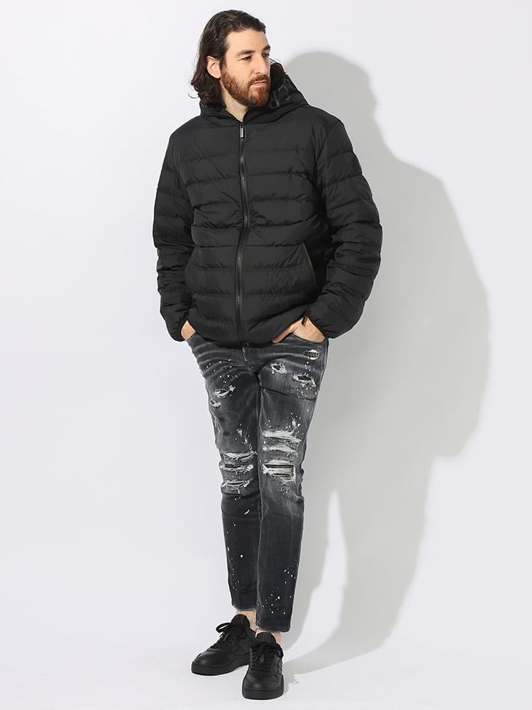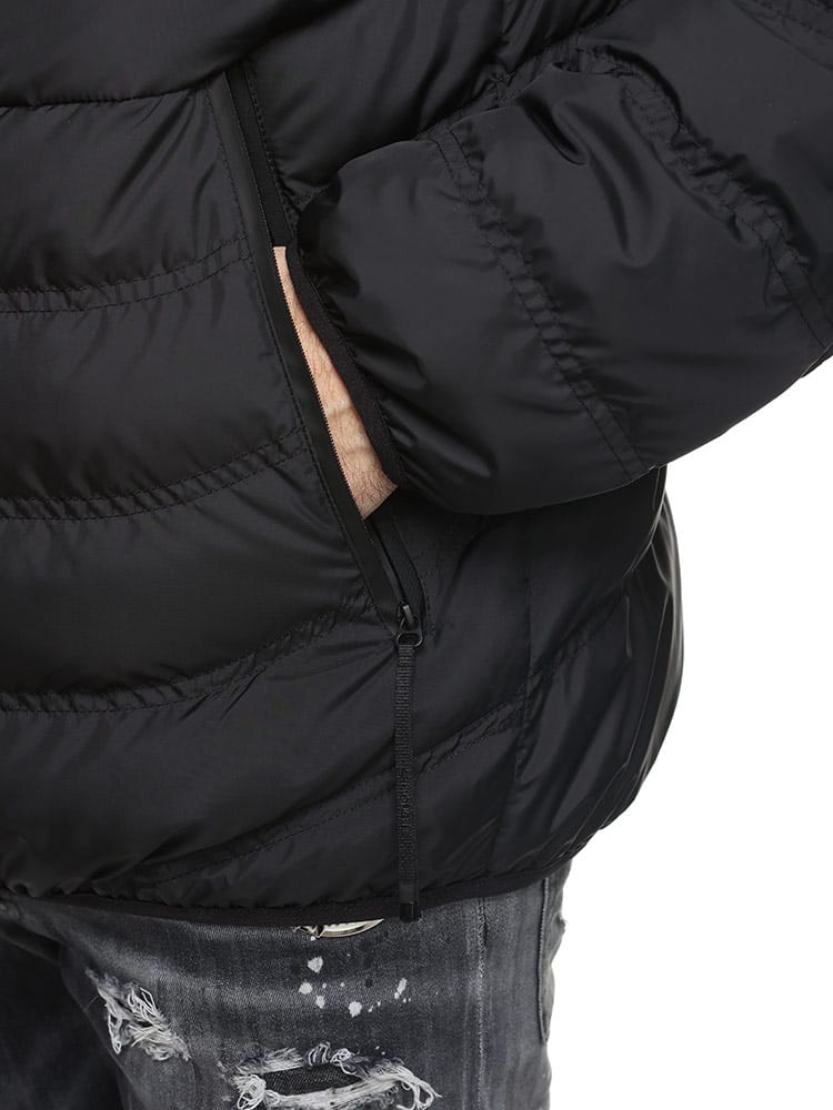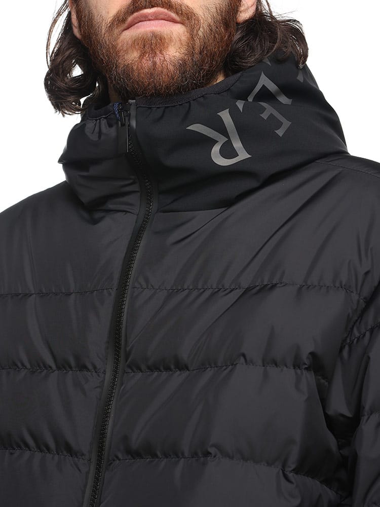 洗練されたミニマルなデザインのVernascaショートダウンジャケットは、マットブラックコレクションを象徴するアイテムです。超軽量ナイロンファブリック素材を使用し、優れた撥水性を備えたフード付きショートダウンジャケットです。フードにはロゴレタリングが施されています。