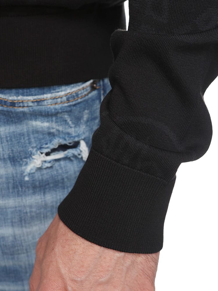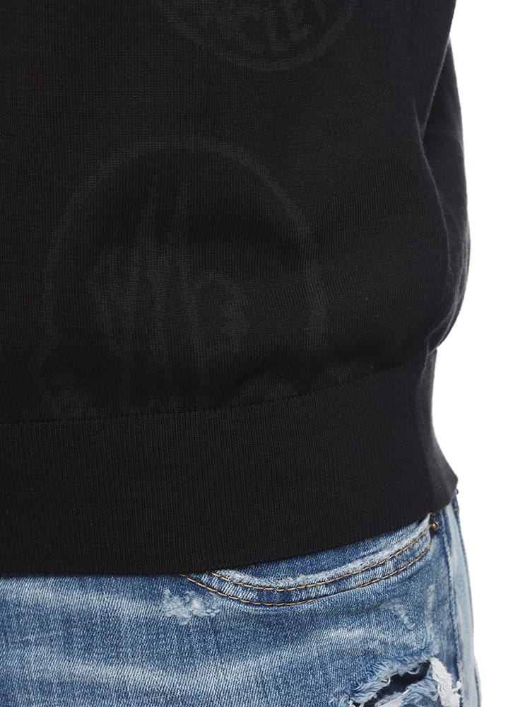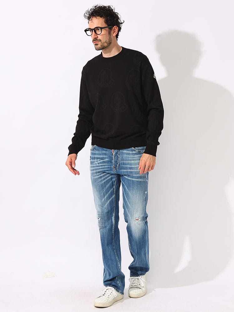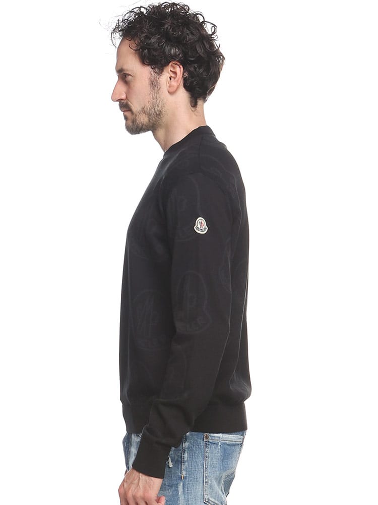 MONCLERのクルーネックニットセーター。ワッペンロゴ総柄が特徴。高品質な素材で暖かく、洗練されたデザインがスタイリッシュな印象を与えます。