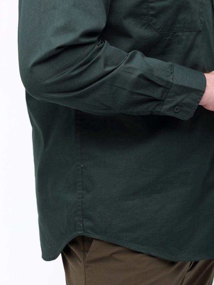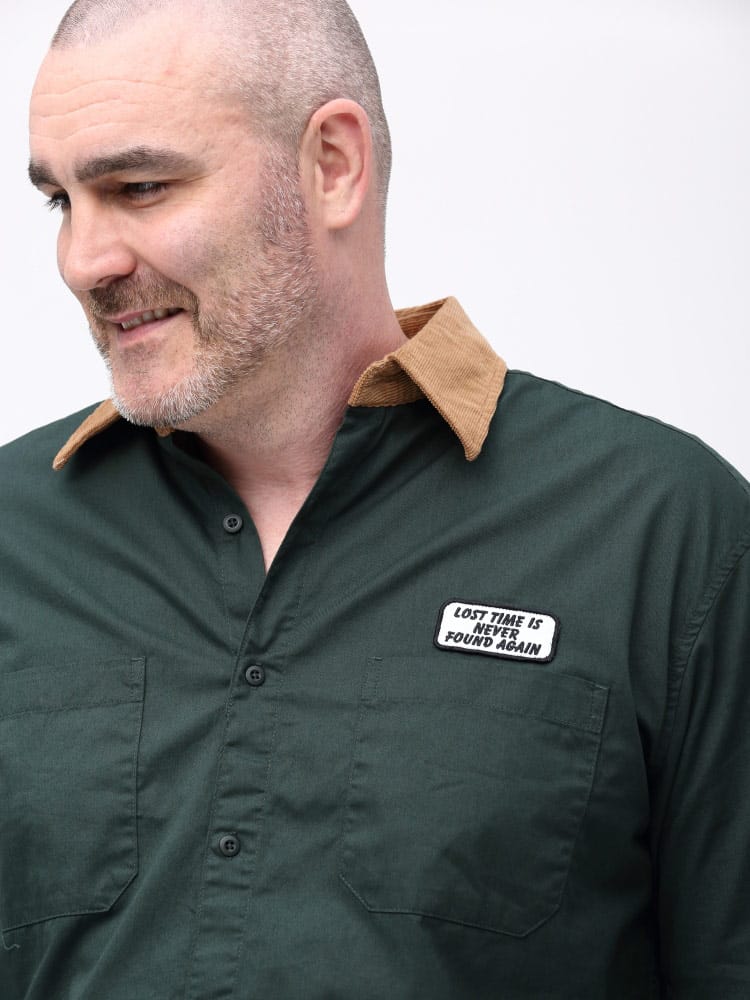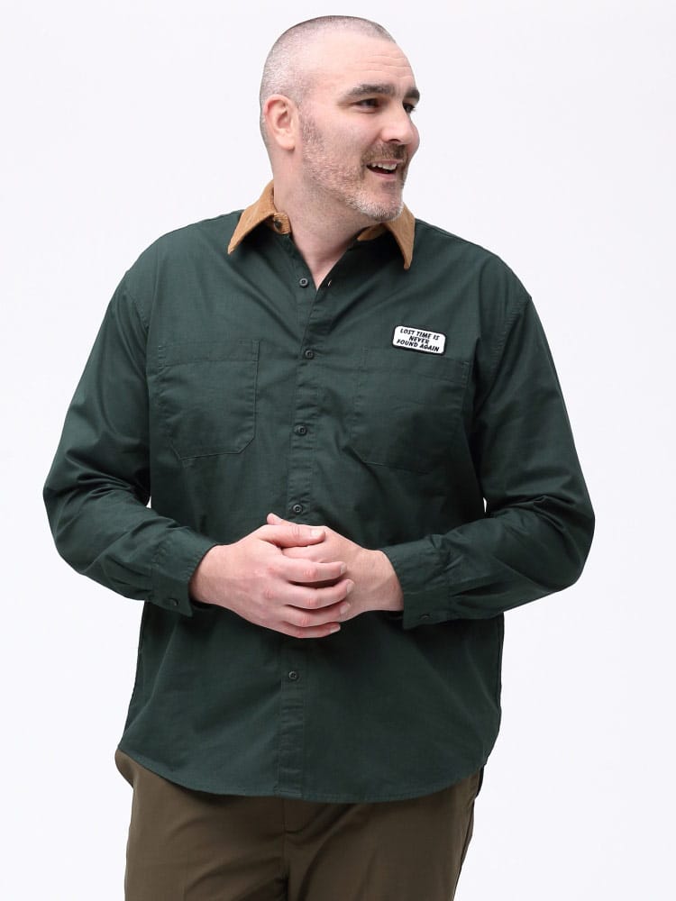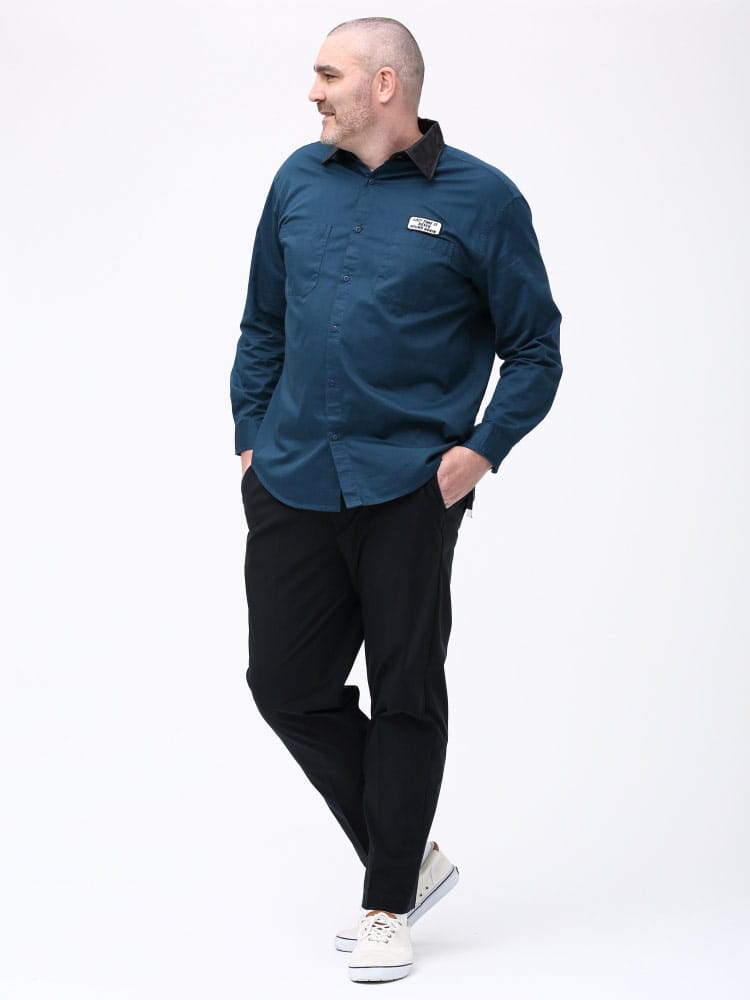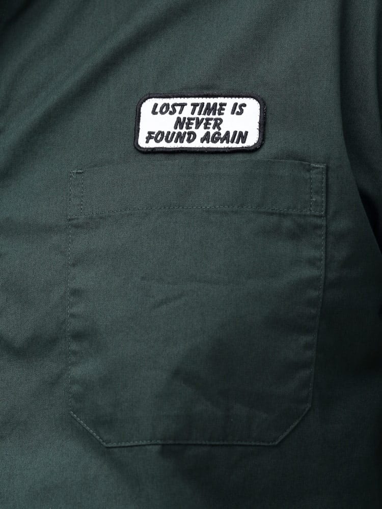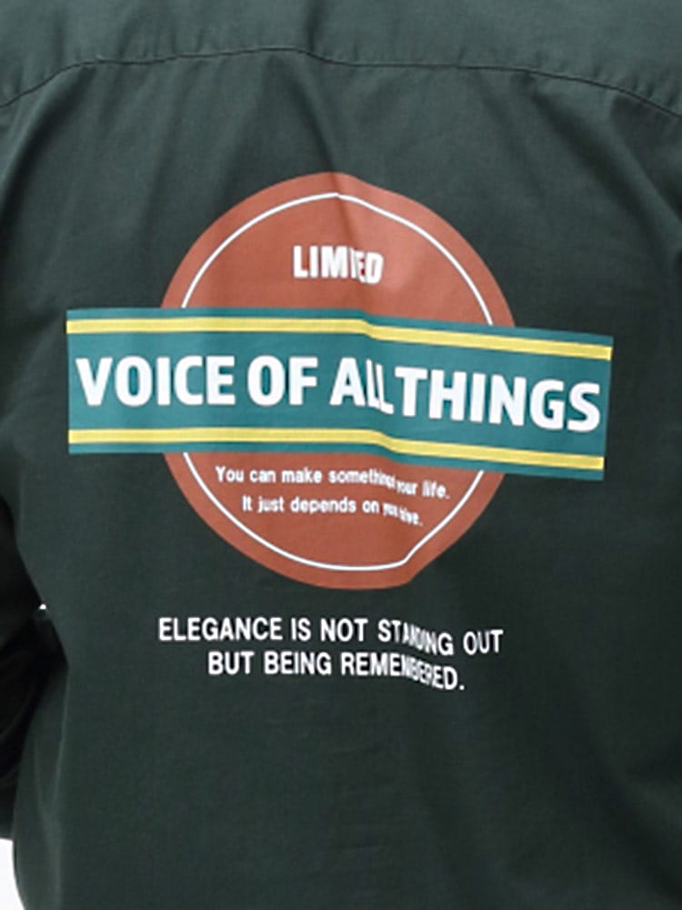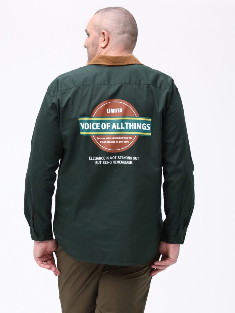 襟の異素材切り替えを施した、ワークシャツ。カラーによって素材が違う素材で襟をデザインしたオシャレな一枚。本体はワークシャツ使用でフロントWポケット完備。胸に刺繍ワッペン、バックプリントを施した古き良きアメカジ要素を詰め込んだ仕上がり。デニム、チノとの相性抜群です。一枚で存在感、オシャレにきまる一枚です。