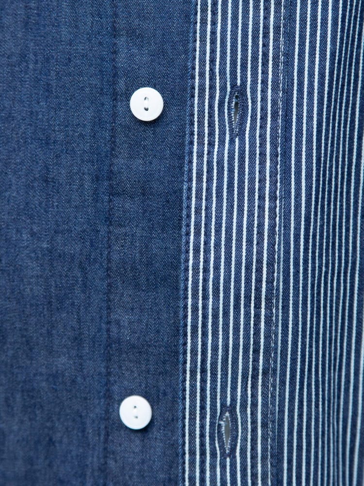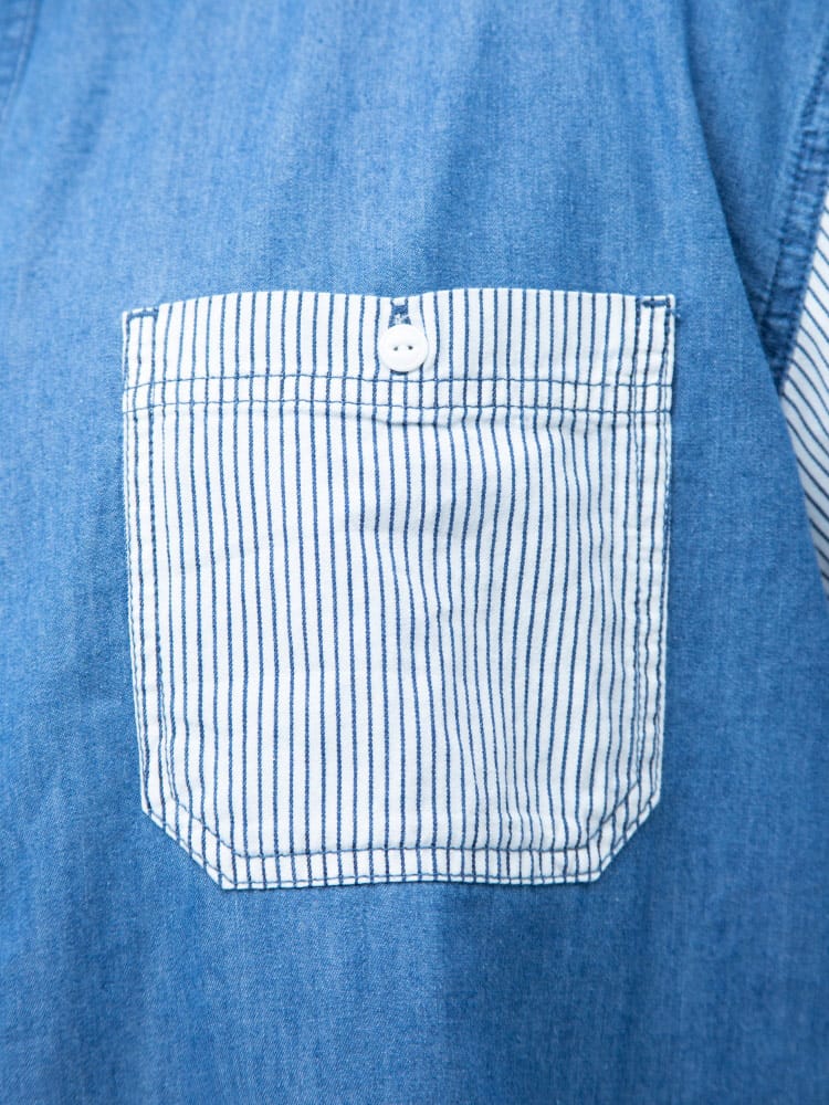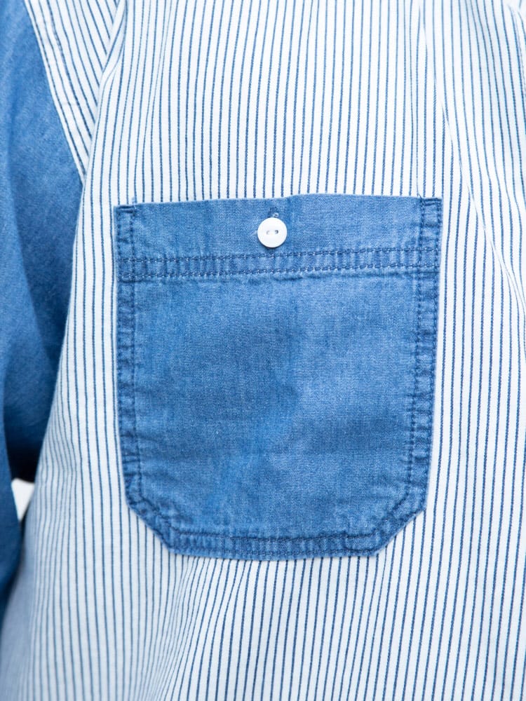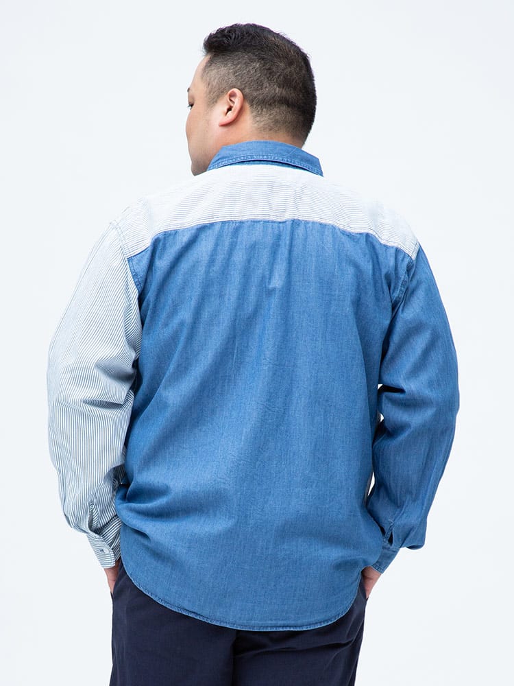 インディゴのクレイジー切り替えがお洒落なポケット 長袖 シャツです。クレイジー切り替えが普段のコーデにアクセントをプラスしてくれます。フロントにポケット付き。肌触り抜群のコットン生地を使用し、着心地抜群のアイテムです。