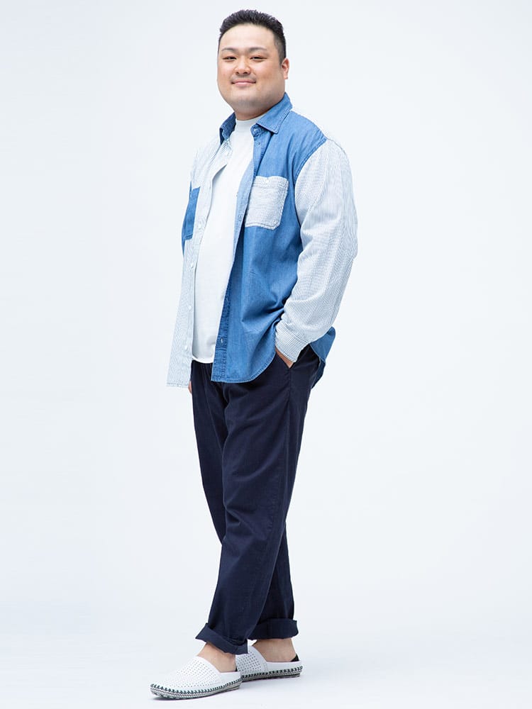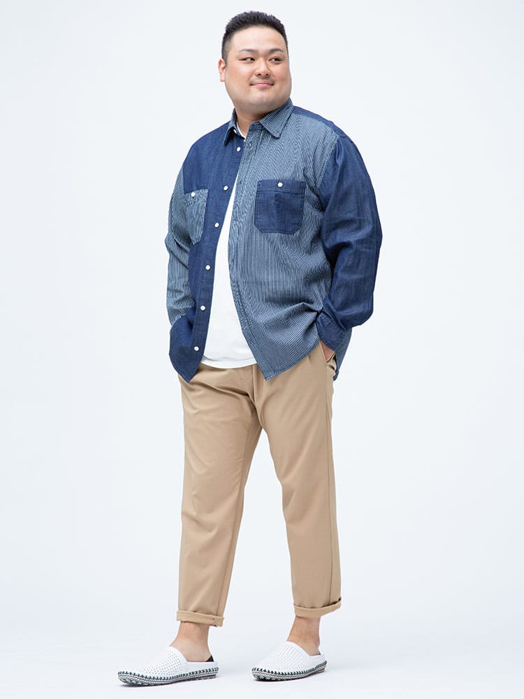 身長:178cm / 体重105kg / B:113 / W:105 / H:108 / S:28.0cm 着用サイズ:X1(3L~4L相当)