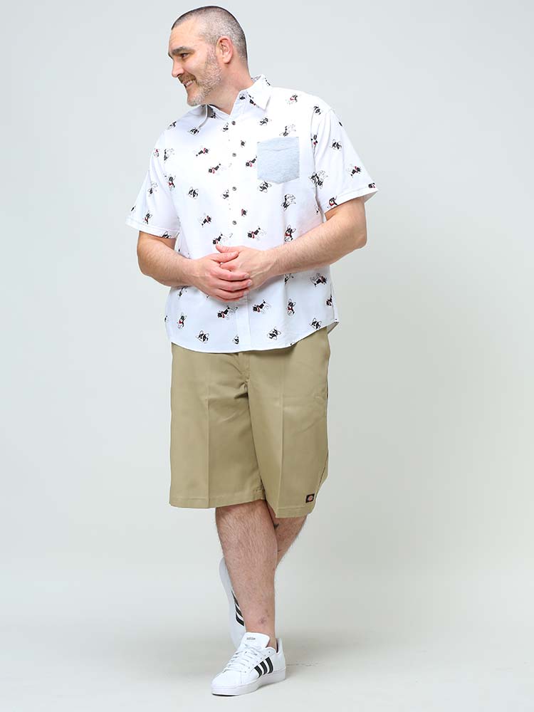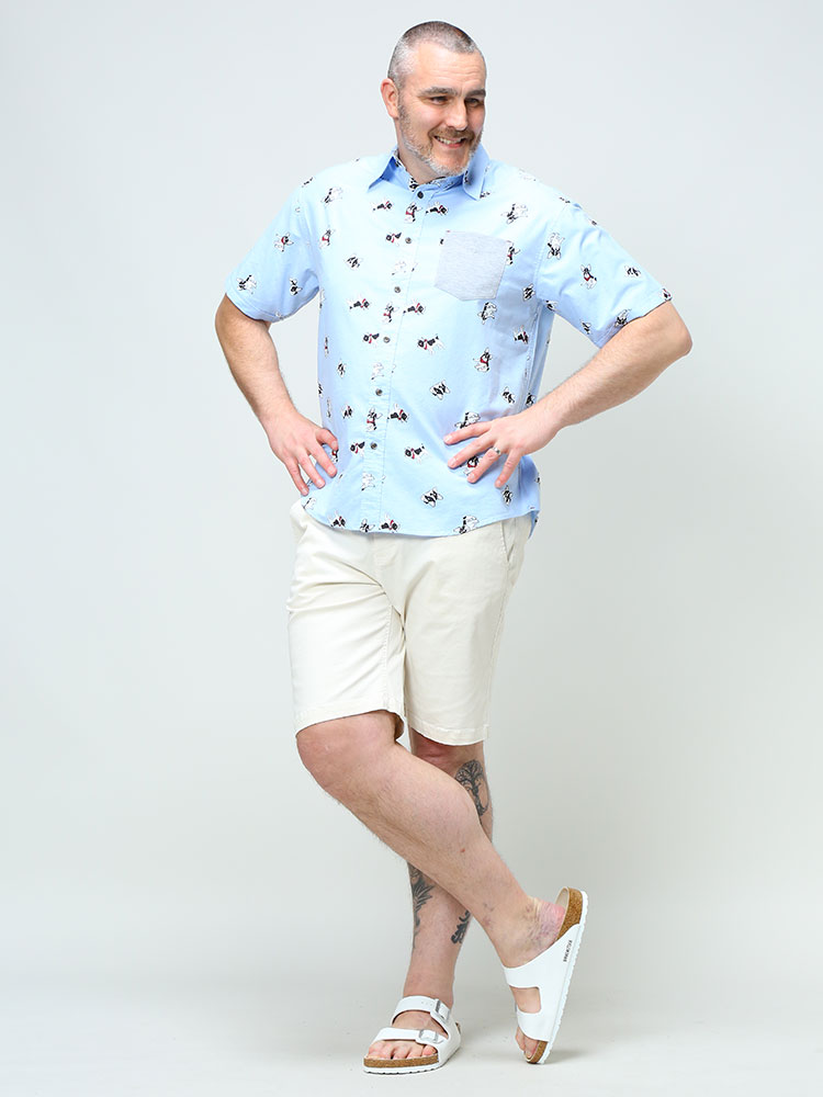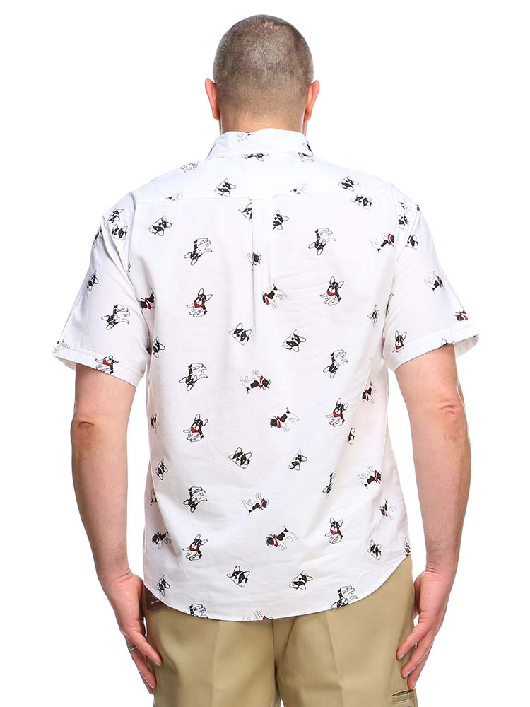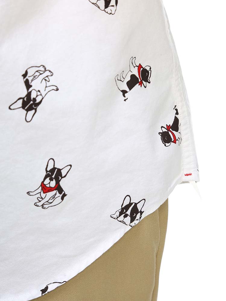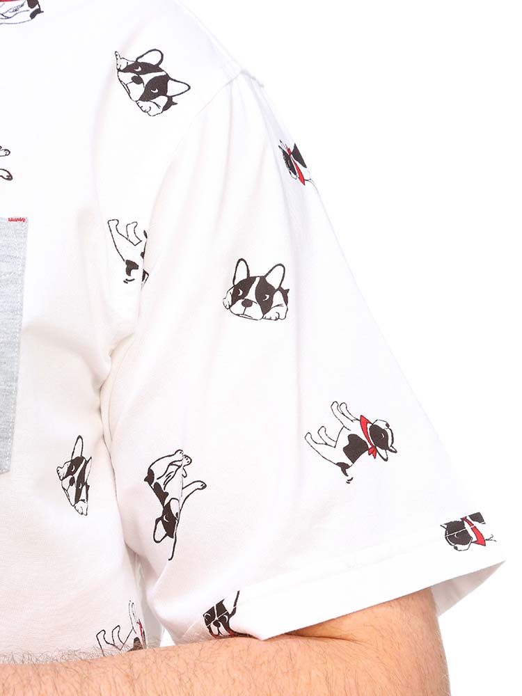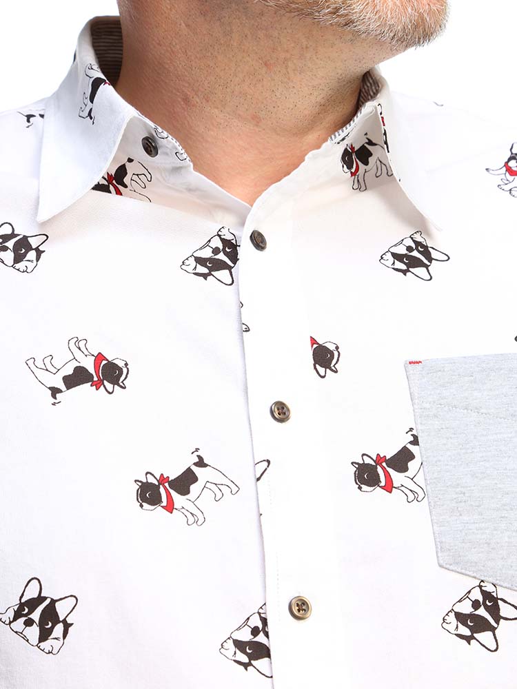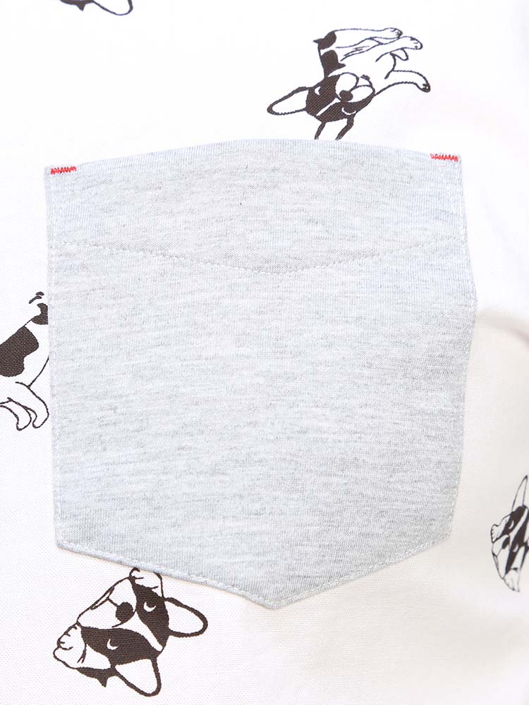 フレンチブルドッグ柄がポップなポケット 半袖 シャツです。左胸の異素材ポケットがポイントです。生地には肌触りの良いコットン生地を使用しています。カジュアルスタイルにおすすめの一枚です。