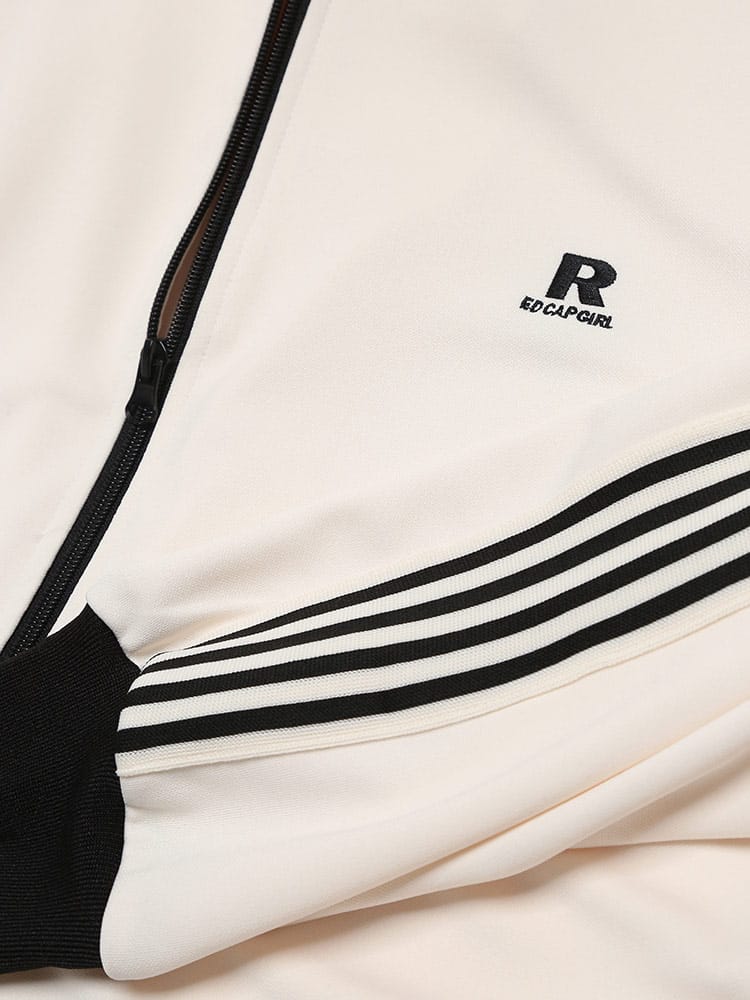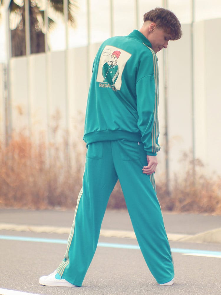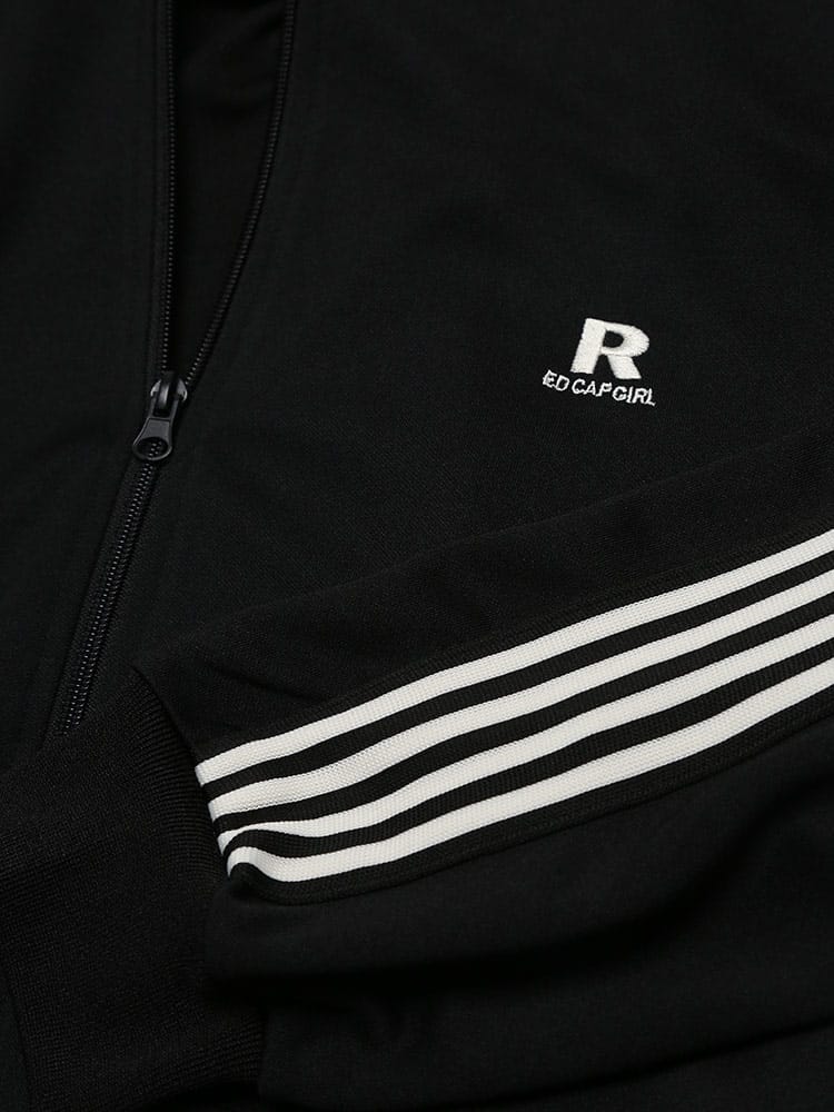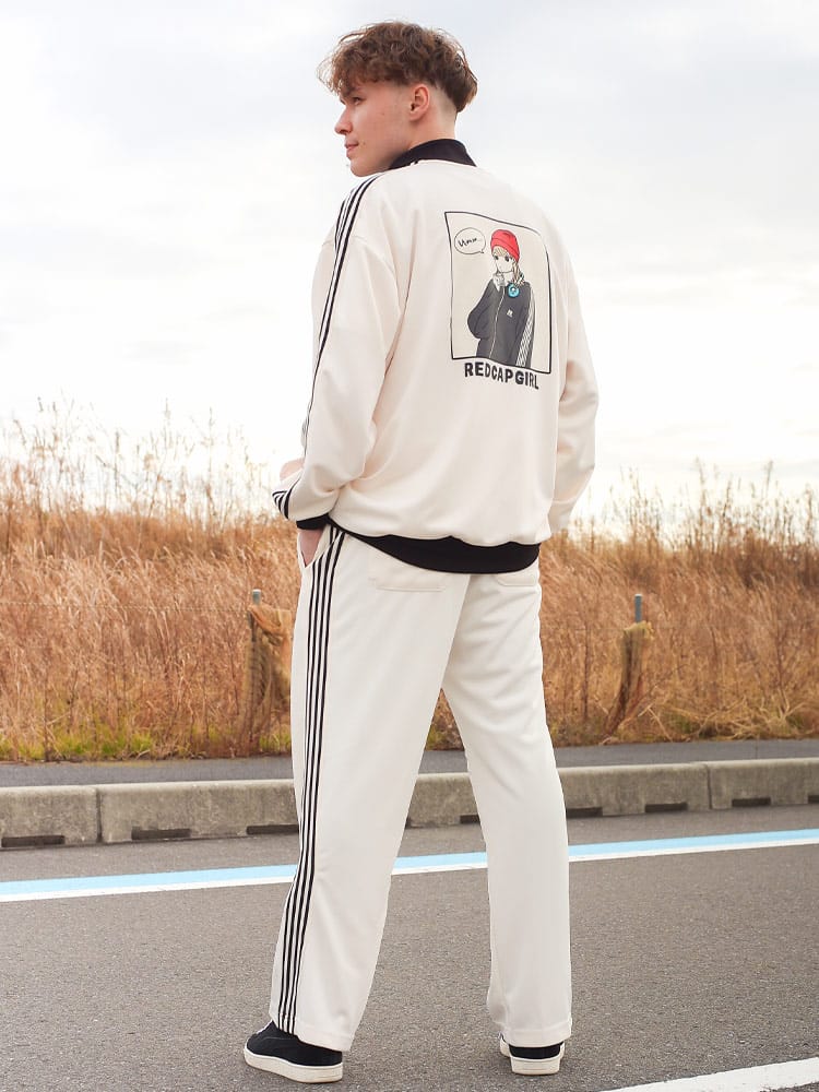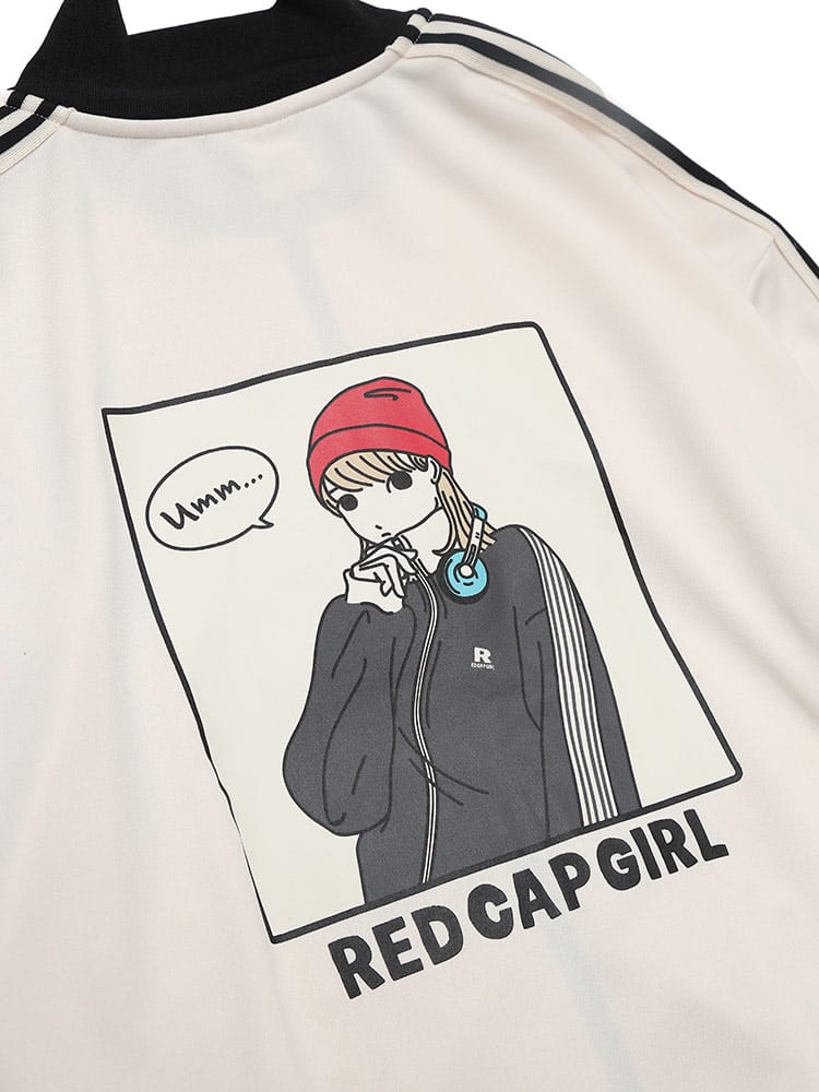 Red Cap Girlのバックプリントラインフルジップトラックジャケットは、動きやすくスタイリッシュなデザインが特徴です。フルジップクロージャーとスリムなラインが現代的な雰囲気を醸し出し、背面にはポップなイラストプリントが施されています。快適なフィット感と優れた耐久性を兼ね備え、日常のカジュアルウェアからアクティブなシーンまで幅広く対応。