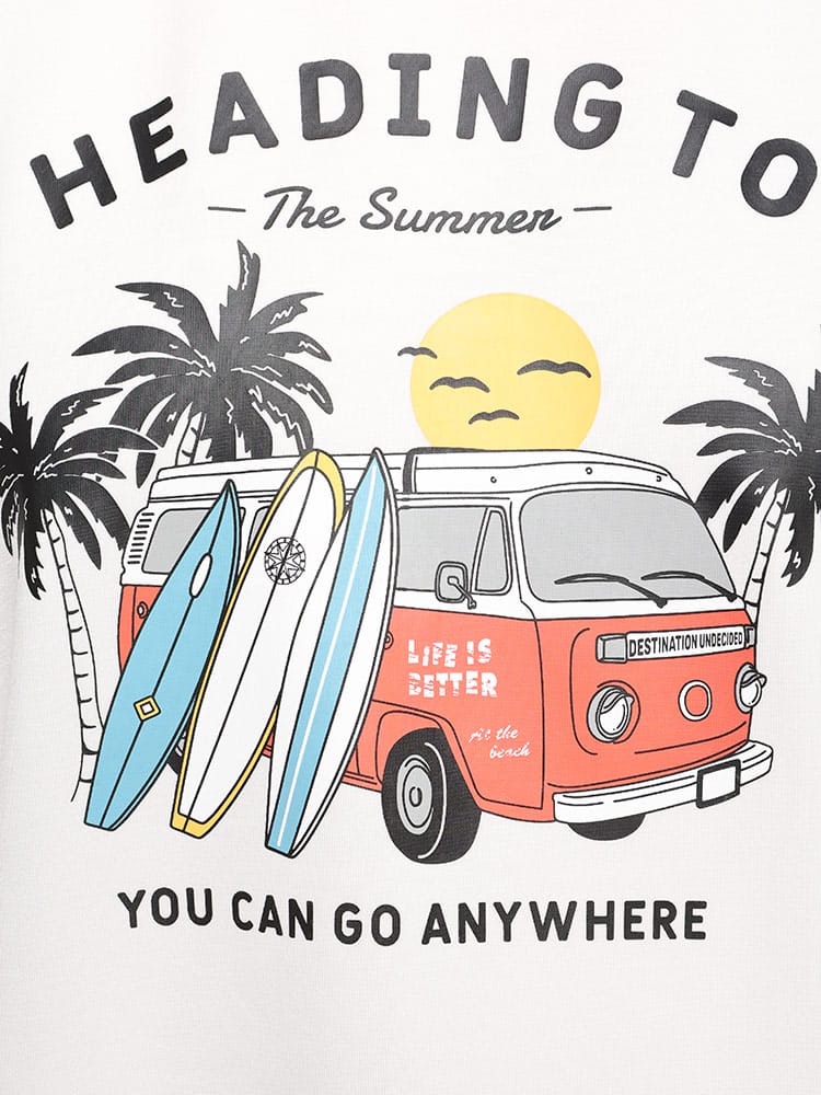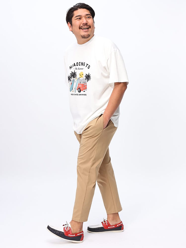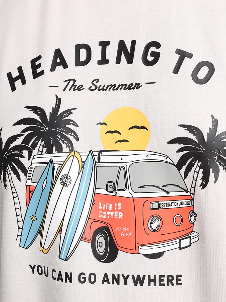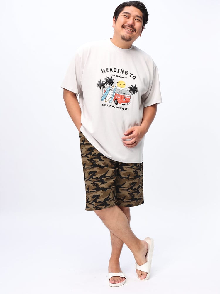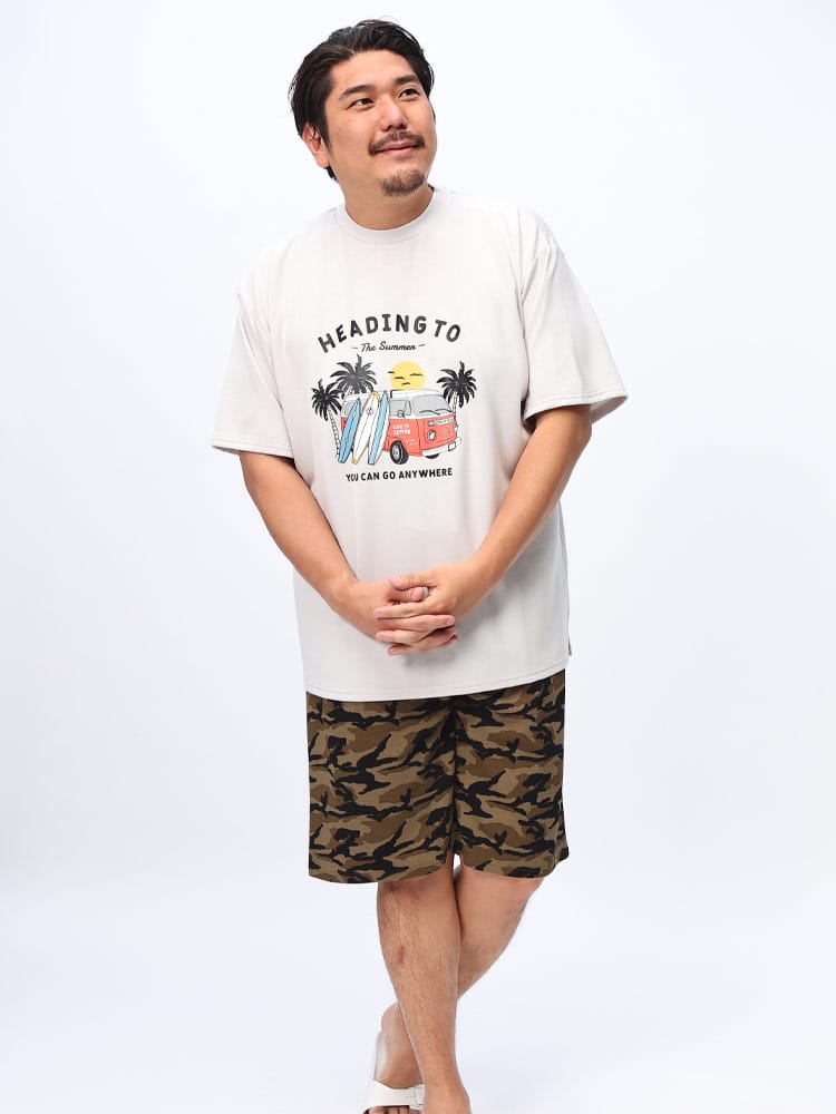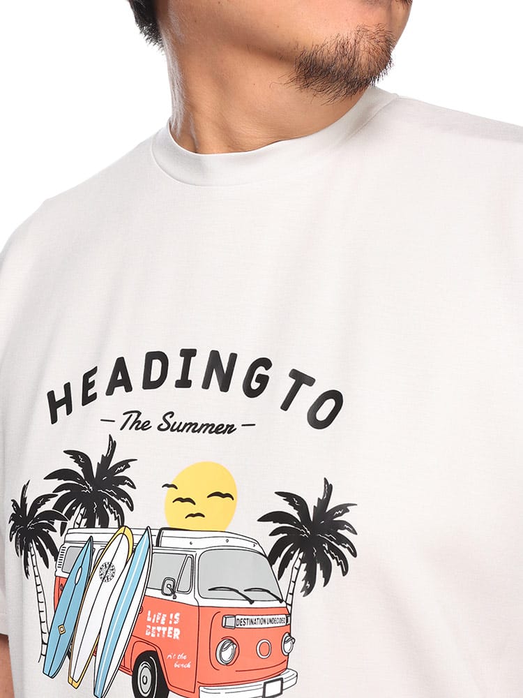 シルクのような肌触りのクールタッチなプリントTシャツ登場。サーフボードとキャンピングカーをモチーフにしたポップアートプリントが特徴です。冷感機能を持つ素材で作られており、夏の暑い日でも涼しく快適に過ごせます。シルクのような肌触りのストレッチファブリックは動きやすさを提供し、カジュアルながらもスタイリッシュな印象を与えるデザインです。アクティブな日でもスタイルを損なわない理想的なウェアです。