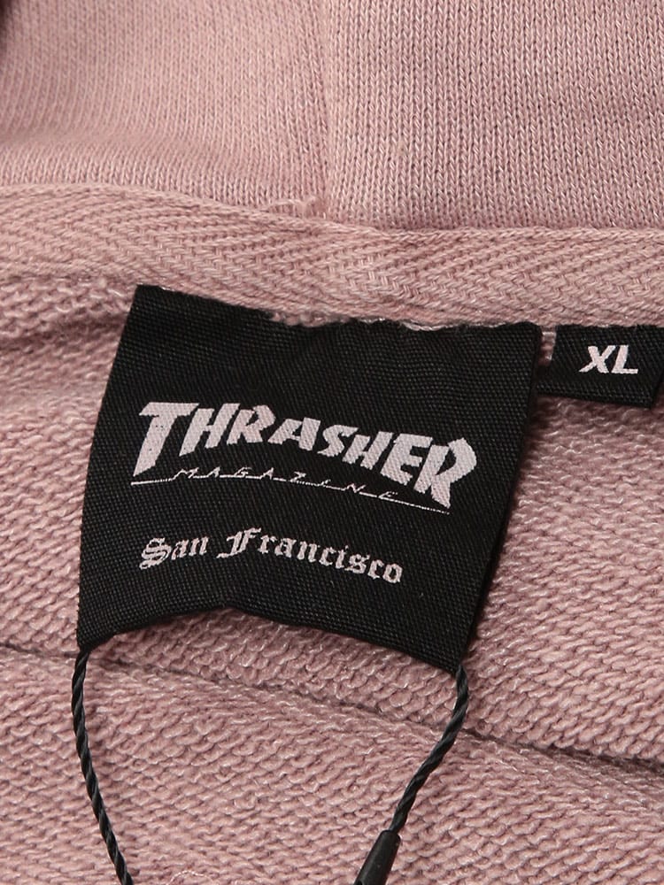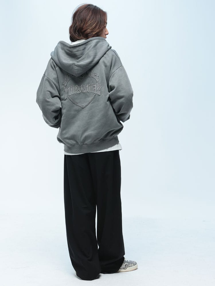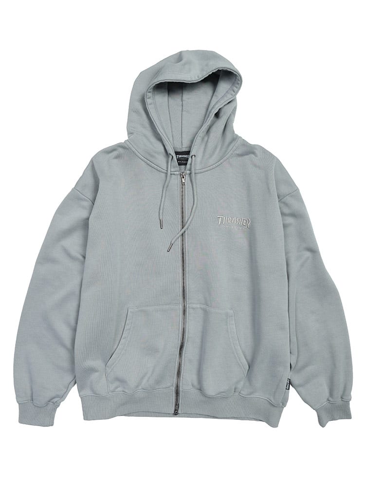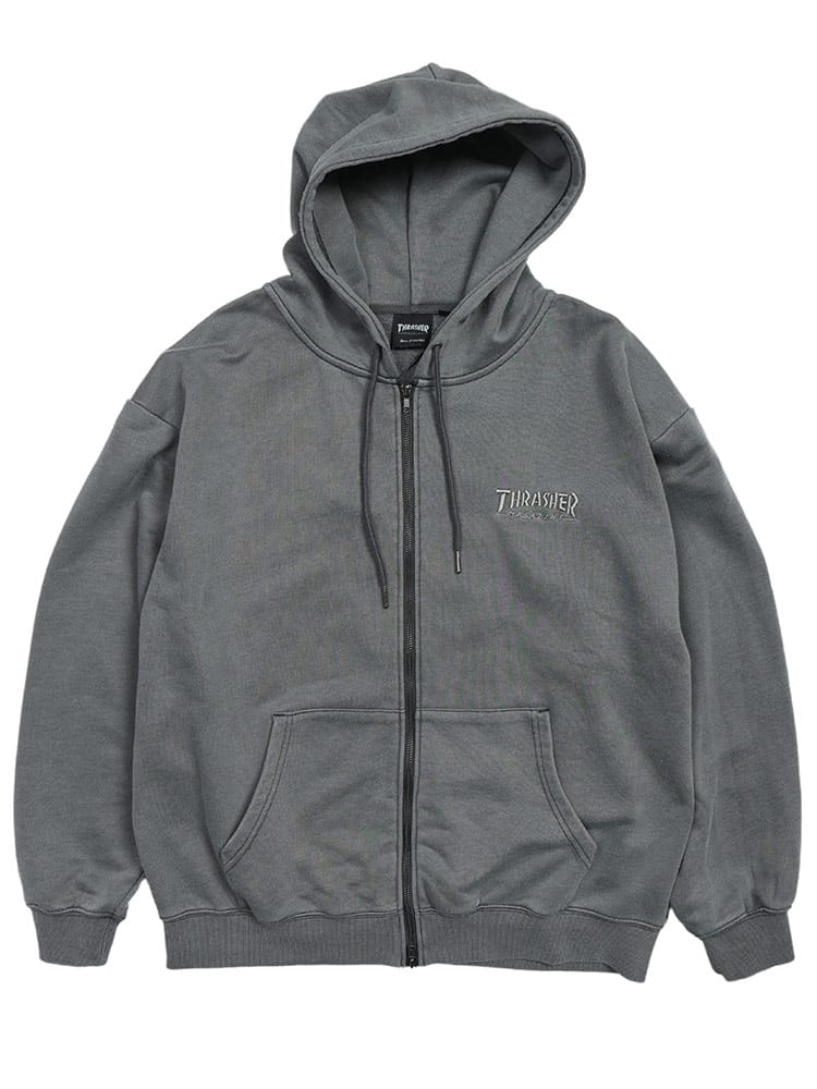 「THRASHER(スラッシャー)」の真骨頂ともいえる、ヴィンテージライクな表情に仕上げたピグメント加工フルジップパーカー。特殊な染め工程によって生み出された、長年愛用したような奥深い色ムラ。古着さながらのこなれた風合いが、着る人のスタイルに奥行きを与えます。胸元にはブランドの象徴であるロゴをダメージデニム風に表現したグラフィックを配し、タフでエッジの効いたストリート感を演出。ジップアップ仕様のため、インナーとのレイヤードも自由自在です。さらりとした質感の裏毛(パイル)素材を採用し、季節を問わず快適な着心地をキープ。性別を問わないユニセックスなシルエットは、程よくリラックスした今の空気感を纏っています。アメカジの武骨さと、スケートカルチャーの奔放さが融合した、ワードローブに欠かせない主役級の一着です。