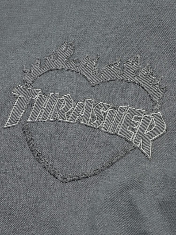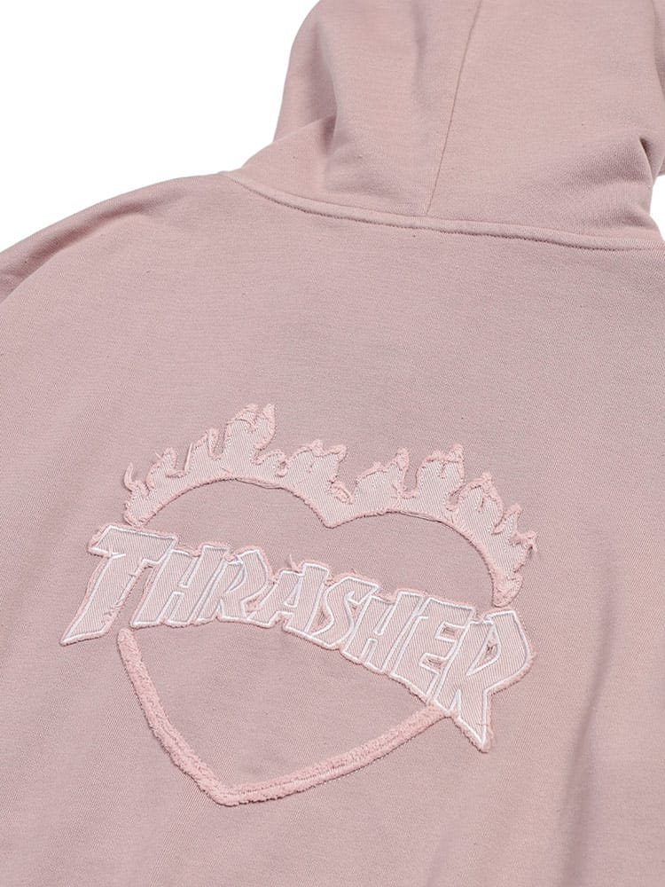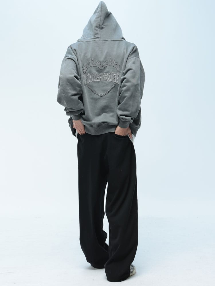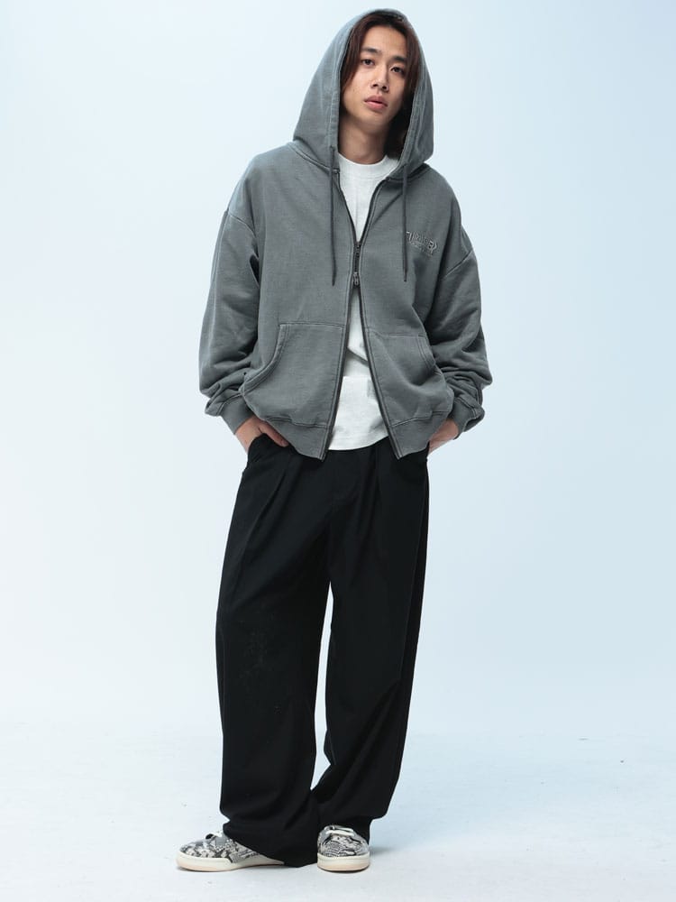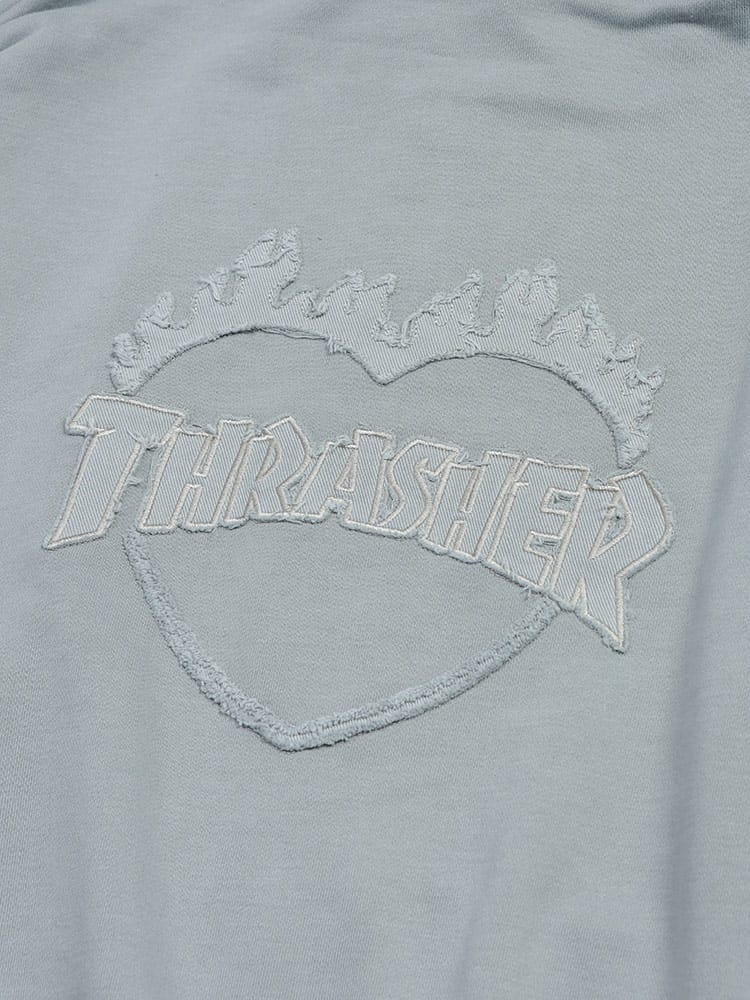 「THRASHER(スラッシャー)」の真骨頂ともいえる、ヴィンテージライクな表情に仕上げたピグメント加工フルジップパーカー。特殊な染め工程によって生み出された、長年愛用したような奥深い色ムラ。古着さながらのこなれた風合いが、着る人のスタイルに奥行きを与えます。胸元にはブランドの象徴であるロゴをダメージデニム風に表現したグラフィックを配し、タフでエッジの効いたストリート感を演出。ジップアップ仕様のため、インナーとのレイヤードも自由自在です。さらりとした質感の裏毛(パイル)素材を採用し、季節を問わず快適な着心地をキープ。性別を問わないユニセックスなシルエットは、程よくリラックスした今の空気感を纏っています。アメカジの武骨さと、スケートカルチャーの奔放さが融合した、ワードローブに欠かせない主役級の一着です。
