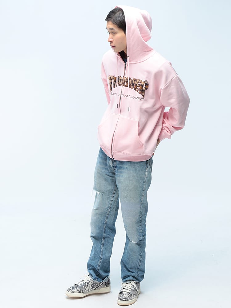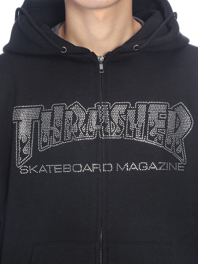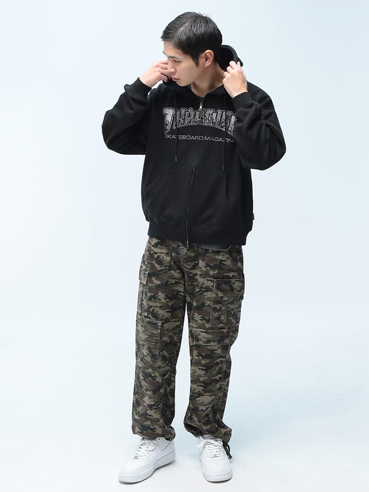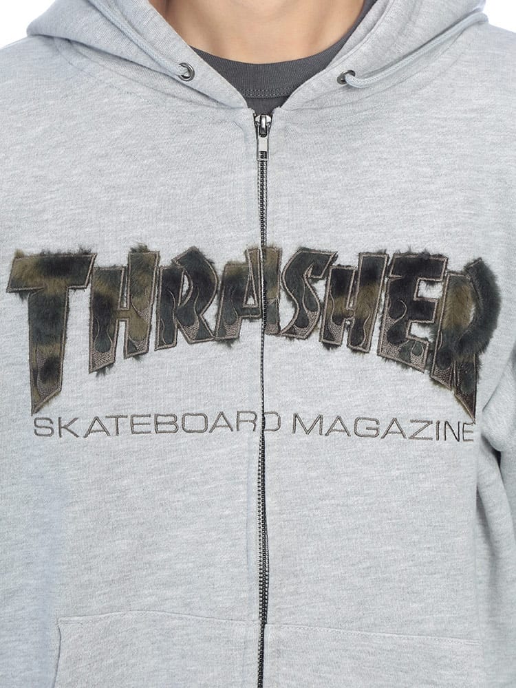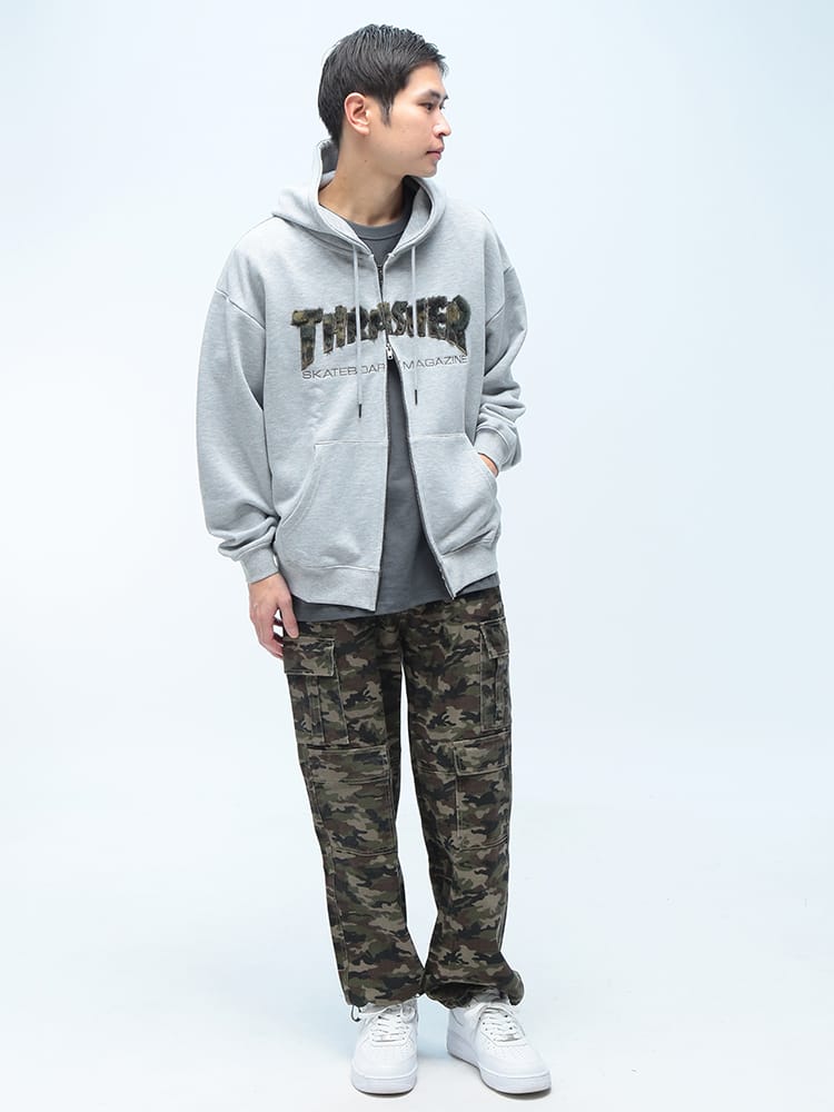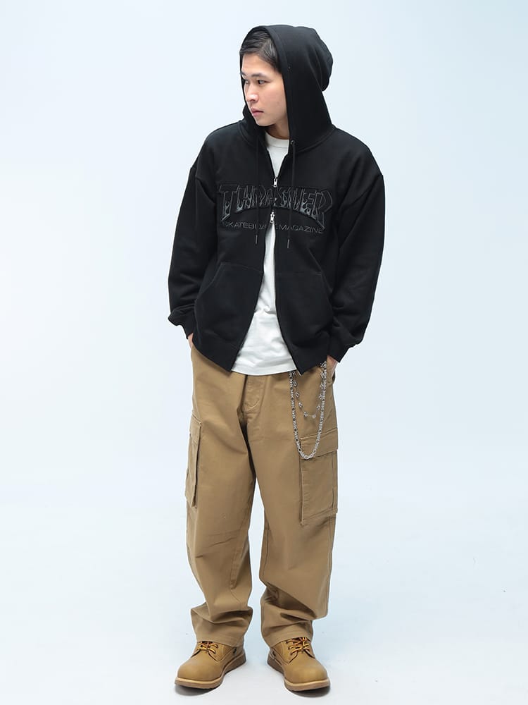 ストリートシーンの王道「THRASHER」の汎用性抜群フルジップパーカー。フロントに配されたアイコニックなブランドロゴが目を惹く本作は、スケーターファンのみならず、現代のストリートファッションに欠かせないマストアイテムです。最大の特長は、着こなしの幅を広げるダブルジップ仕様。裾側を開けてインナーを見せるレイヤードスタイルや、シルエットの微調整も自由自在です。素材には、吸湿性に優れサラリとした肌触りの裏毛(パイル地)を採用。厚すぎず薄すぎない絶妙な肉感で、秋口のアウターから冬場のインナー使いまでロングシーズン活躍します。ポリエステルと綿を混紡したタフなボディは、型崩れしにくくデイリーユースに最適。リブ部分にはポリウレタンを配合し、快適なフィット感と動きやすさを両立しました。小物の収納に便利なサイドポケットを完備し、機能面も充実。オーバーサイズでの着こなしや、カップルでのシェアもおすすめの一着です。