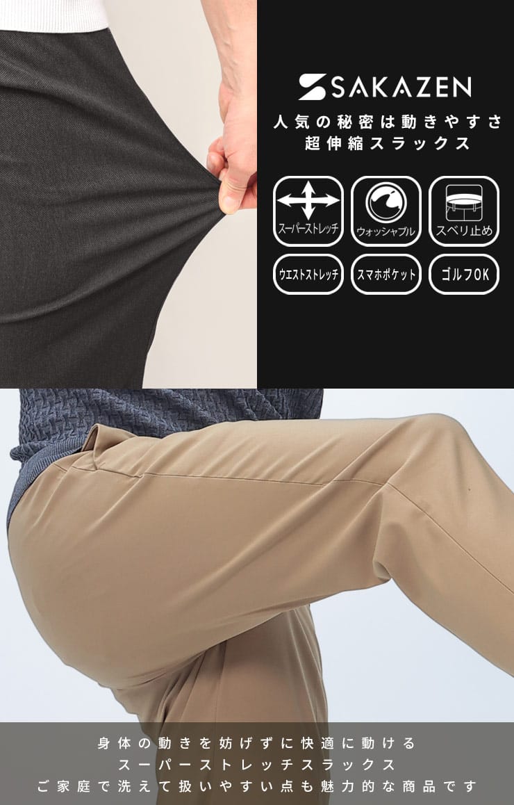 仕様 :外側ポケット数×4つ / ノータック / スーパーストレッチ / ウエストストレッチ / ウォッシャブル / スマホポケット / 滑り止め