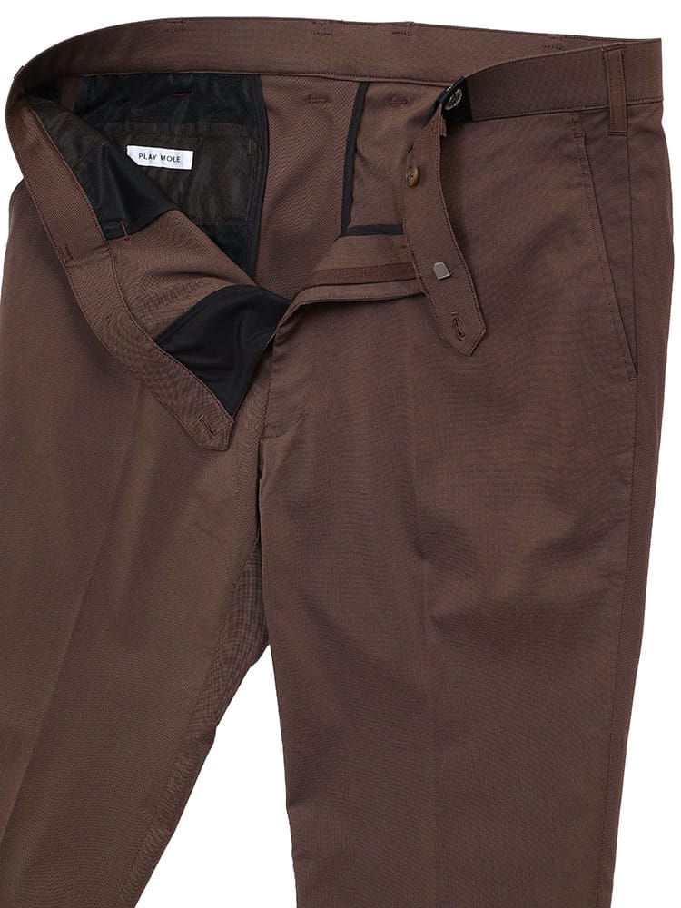 非常に高いストレッチ性が特徴的なPLAYMOLEのストレッチノータックスラックスです。ボトム部分はジャージ素材を思わせる高い伸縮性で履き心地はとっても快適。ひんやりと冷たい肌触りの接触冷感機能を搭載しています。また、ウエストにはゴム素材をあてているのでお腹周りも非常にゆったり、かつ柔らかくフィットするつくりとなっています。仕事着にも、普段使い、ゴルフにもオススメしたいアイテムです。